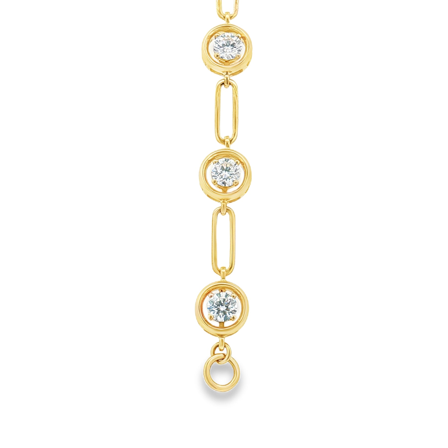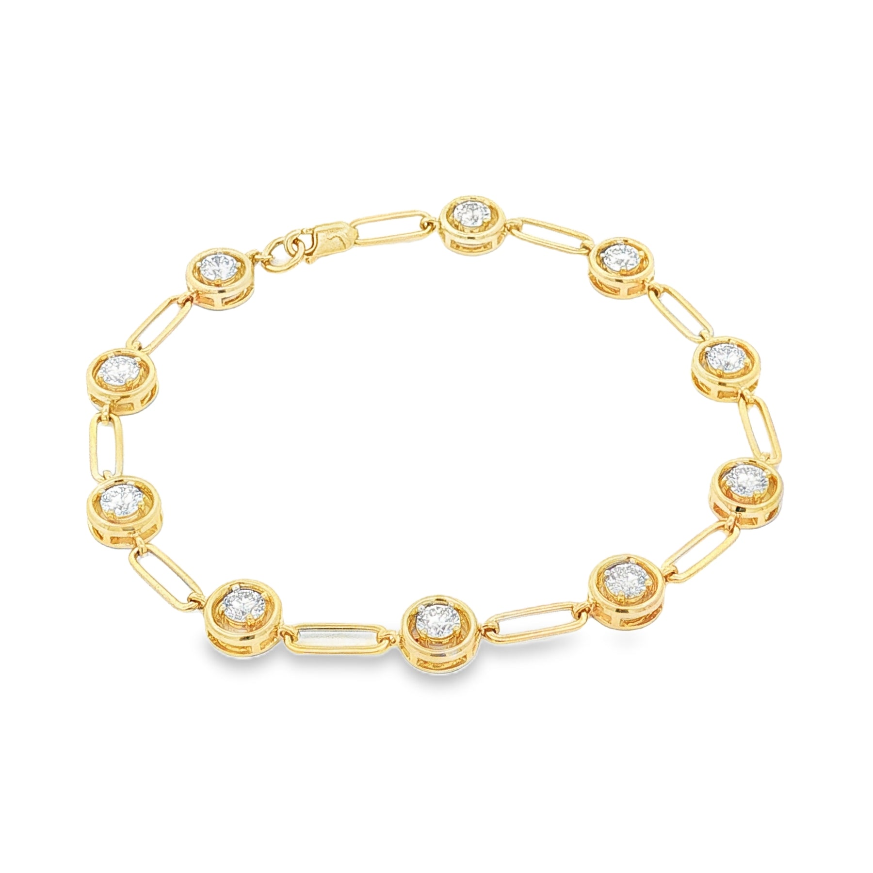 This elegant 7.5" bracelet is crafted in solid 14K yellow gold and set with 2.23 carats of lab-grown diamonds, each bezel-set for a clean, timeless finish. The diamonds feature brilliant sparkle in a modern alternating-link design, creating a luxurious piece perfect for everyday shine or special occasions. Secured with a classic lobster clasp for comfortable, reliable wear.