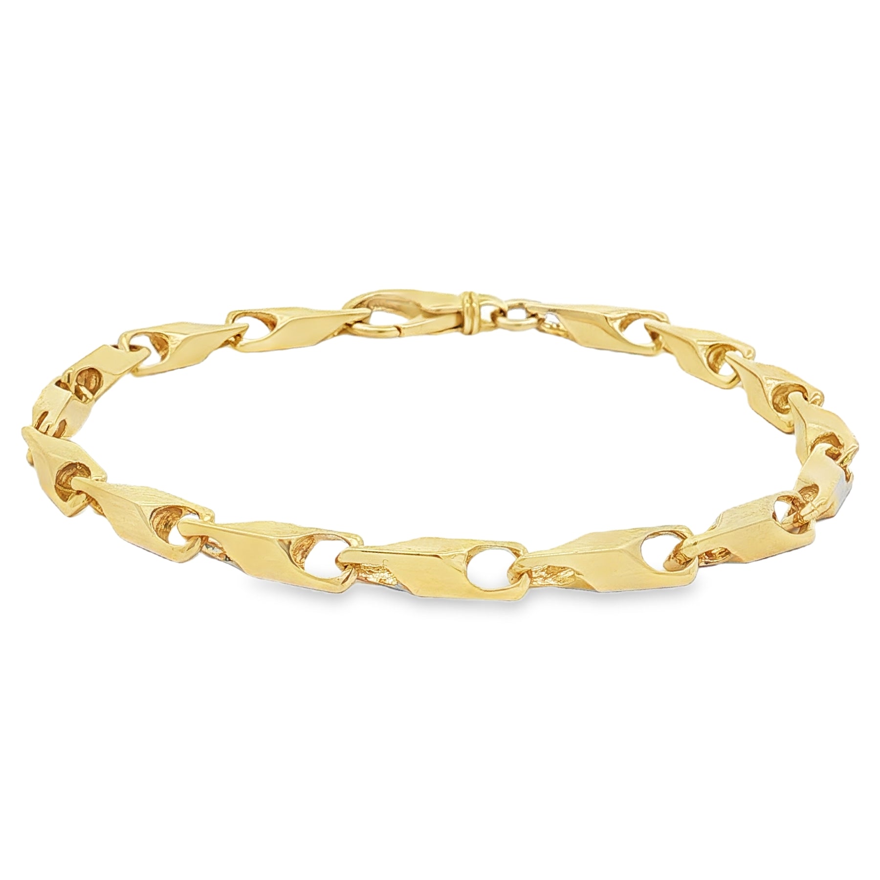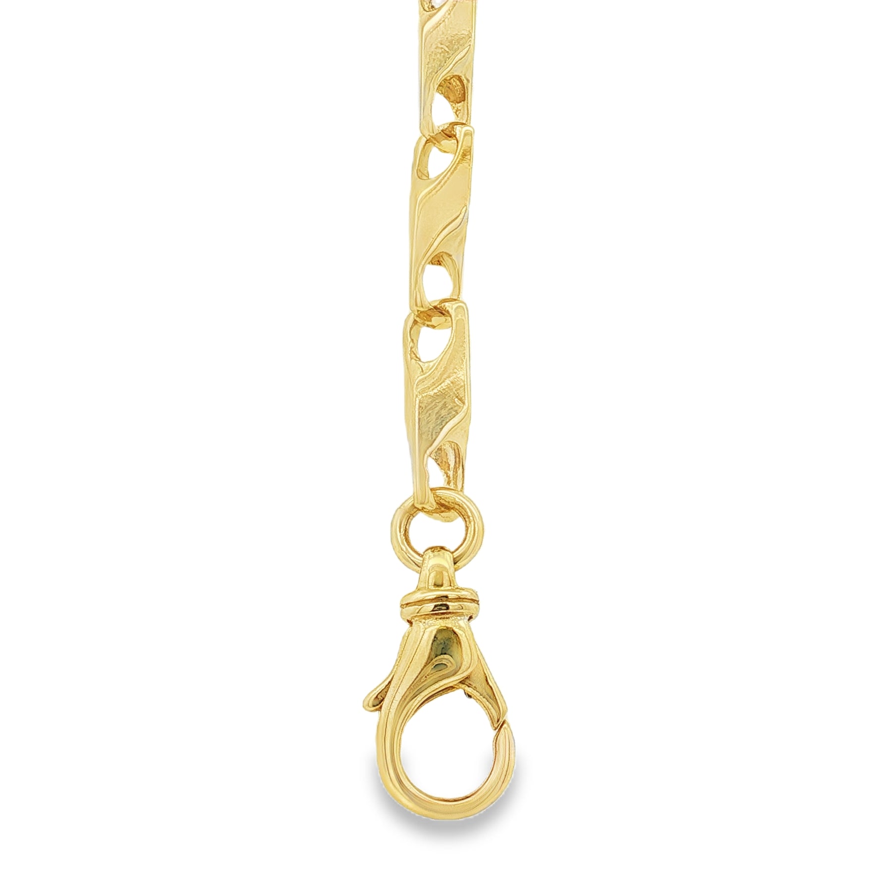 Make a bold impression with this 14K yellow gold fancy link bracelet, crafted with heavy, sculpted links that catch the light from every angle. Measuring 3.5mm wide and 8 inches long, this statement piece combines durability with refined design, secured by a heavy duty lobster clasp for everyday wear.