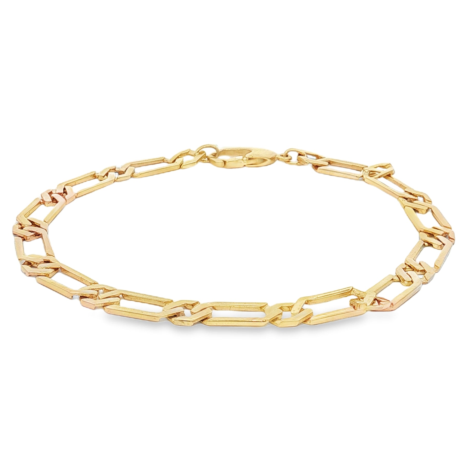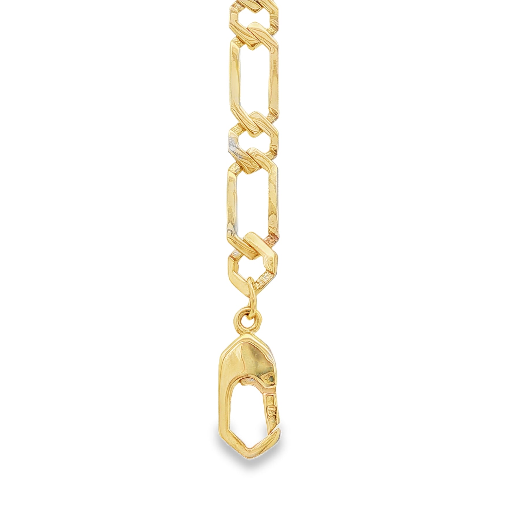 This 14K yellow gold fancy Figaro bracelet brings a bold yet refined edge to any look. Measuring 8 inches long and 5.5mm wide, it features a mix of elongated and short links with subtle design accents. The lobster clasp provides both security and comfort, making it a standout choice for everyday wear or special occasions.