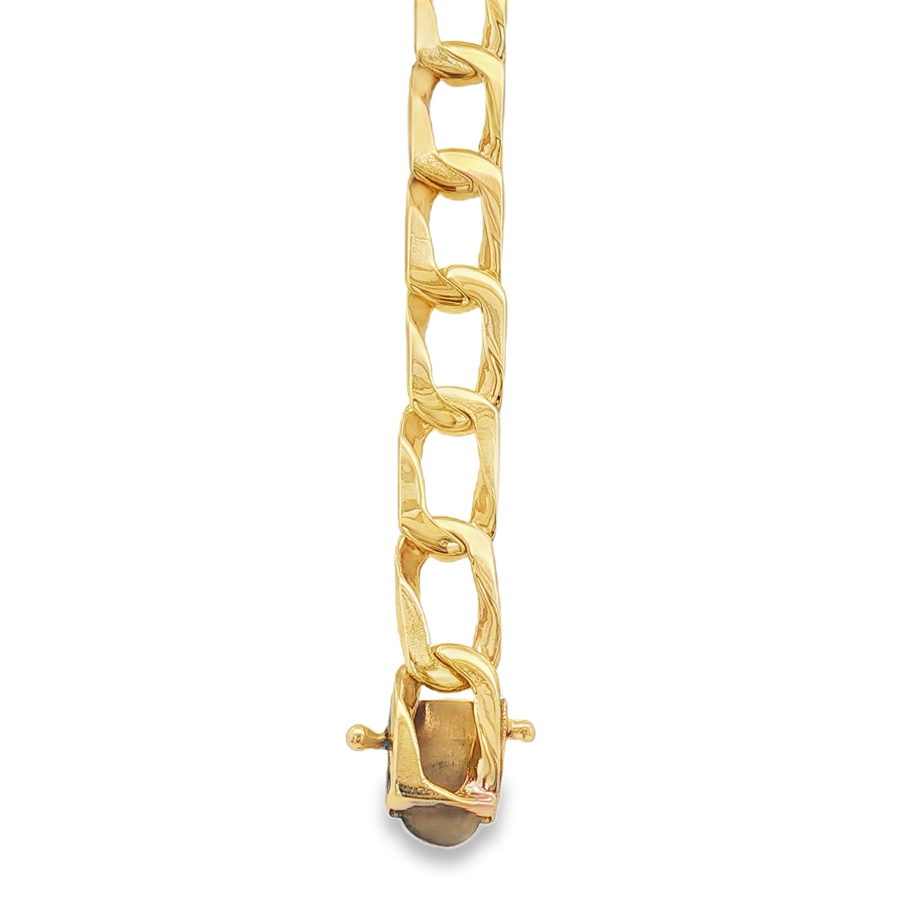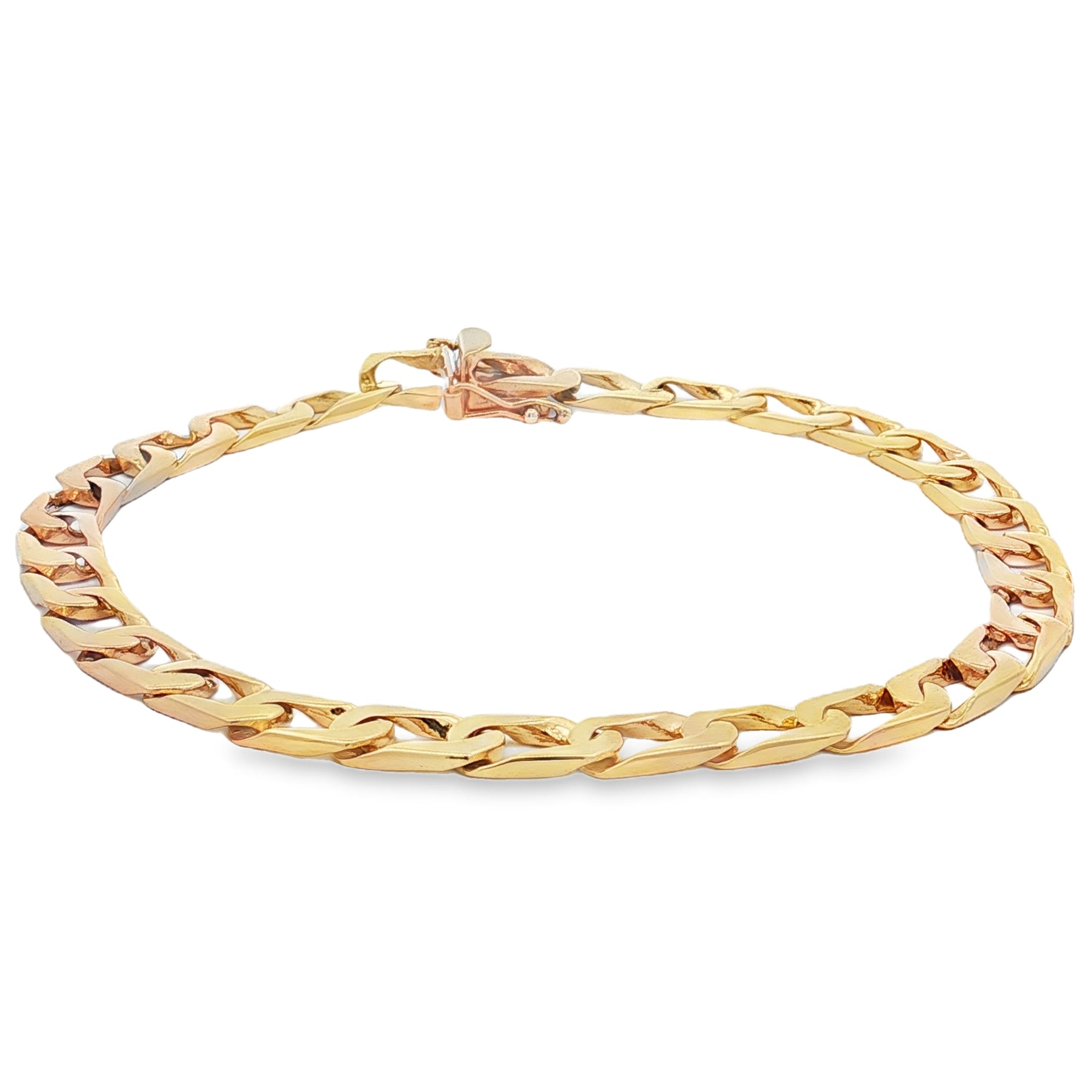 This 14K yellow gold fancy curb bracelet showcases a sleek, polished link pattern with subtle rose gold accents. Measuring 6.3mm wide and 9 inches long, it offers a bold and luxurious look. The box clasp adds a secure finish, perfect for everyday wear or elevating formal attire.