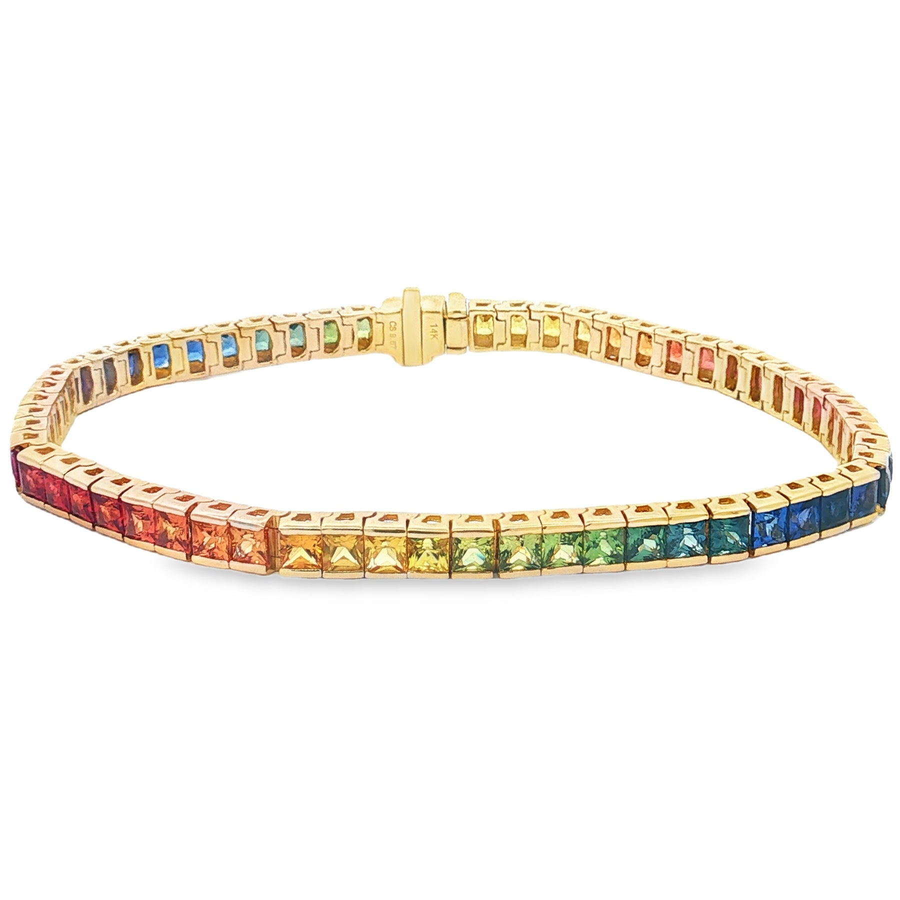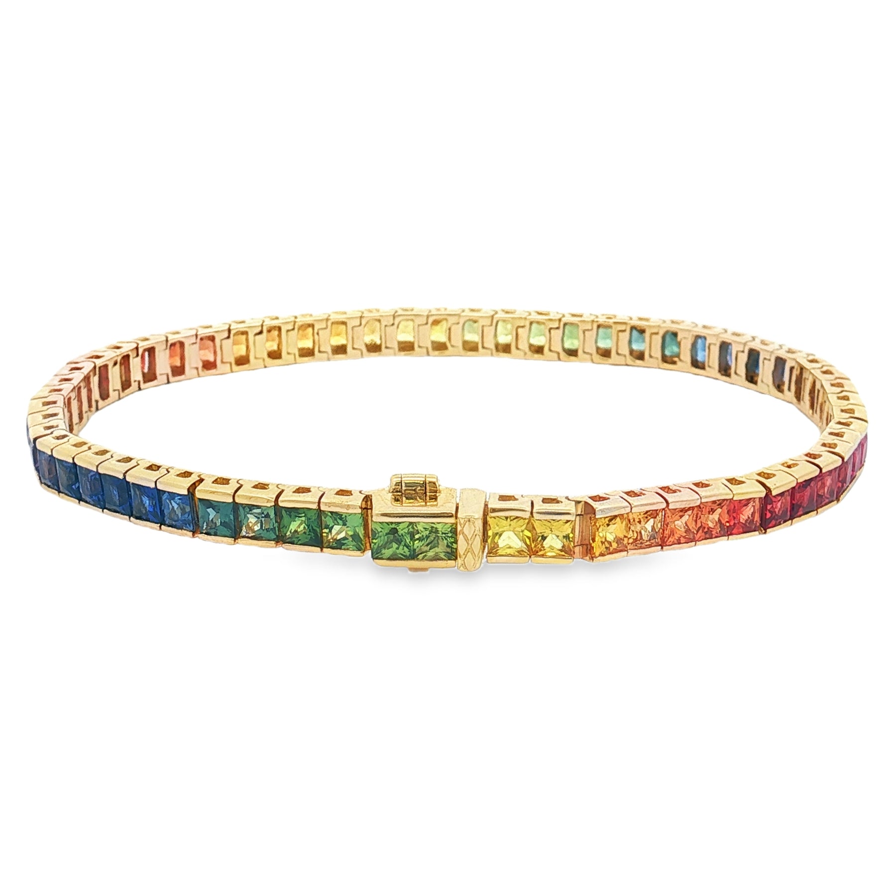 This stunning 7" bracelet features 9.67 carats of natural rainbow sapphires, precision-set in rich 14K yellow gold. Each square-cut sapphire is arranged to create a seamless ombré spectrum of color, giving the bracelet a bold, luxurious look. A secure clasp ensures comfortable, worry-free wear. Details: 🪙 Metal: Solid 14K yellow gold 💎 Gemstones: 9.67ct natural rainbow sapphires 🔶 Cut: Princess-cut square sapphires 📏 Length: 7" 🔐 Clasp: Secure box clasp