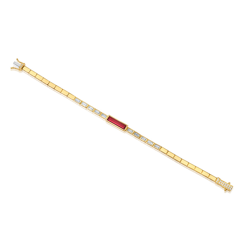 This exquisite 7" bracelet is crafted in solid 14K yellow gold and showcases a bold 2.11ct lab-created ruby at center, framed by 1.3ct of sparkling lab-grown diamonds. Sleek, modern links lead to a secure box clasp, creating a luxurious piece that balances vivid color with timeless elegance.