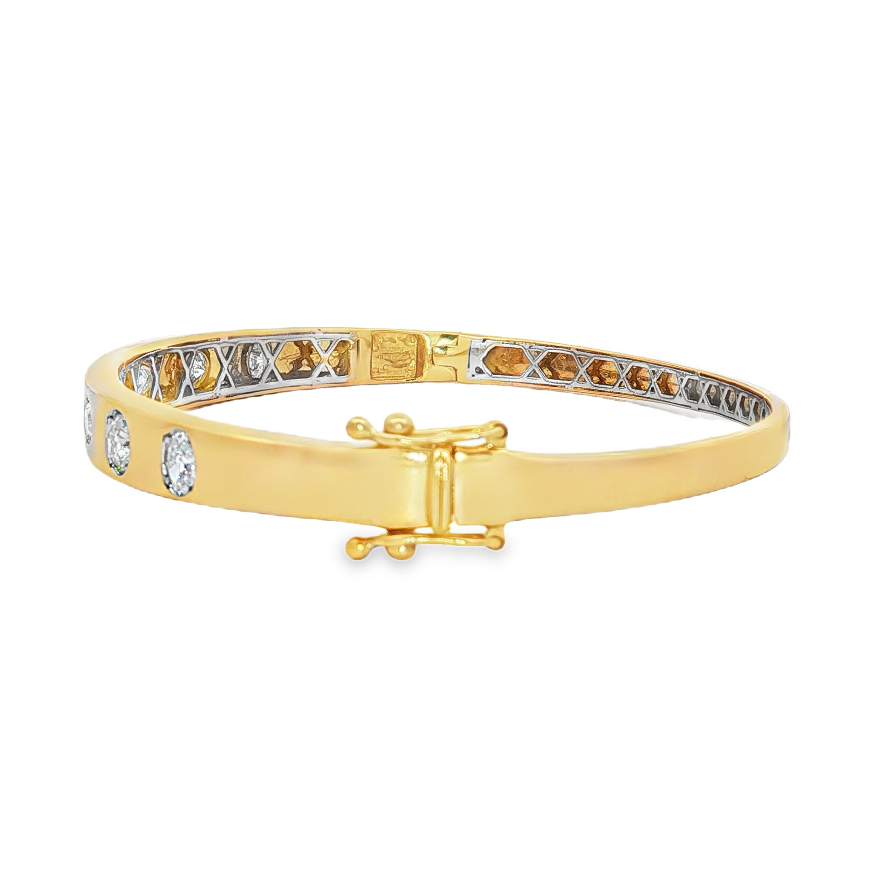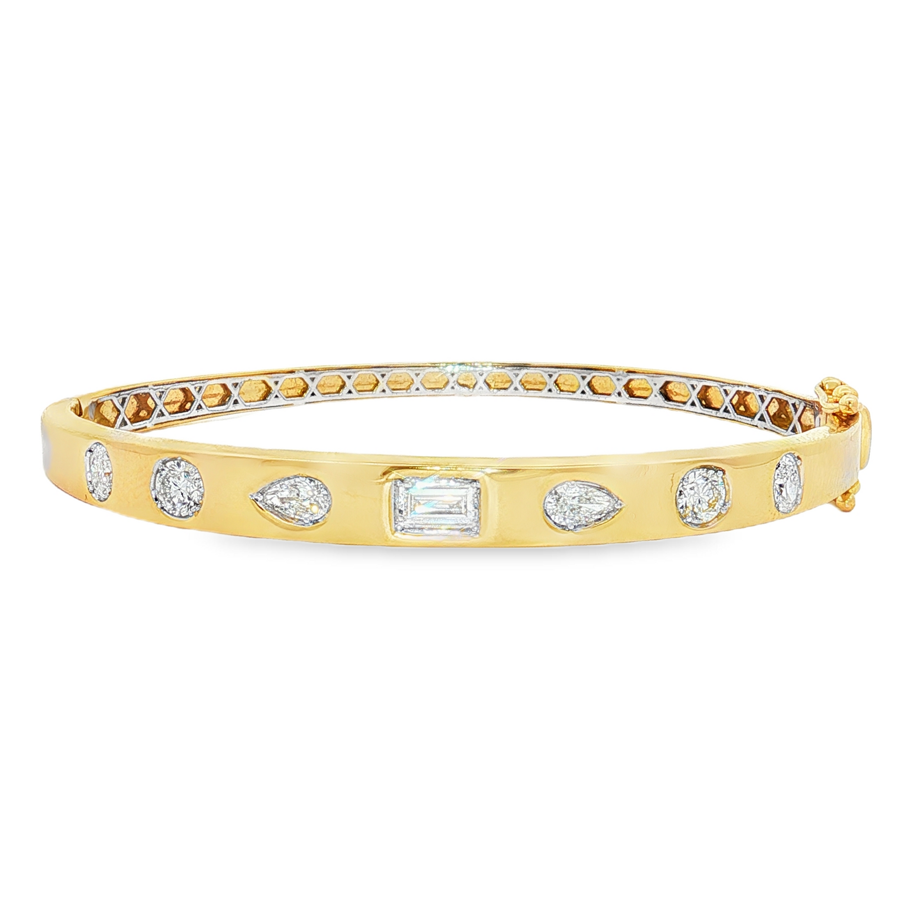 Crafted in elegant 14K yellow and white gold, this stunning 6.5-inch bangle bracelet showcases a mix of baguette, oval, pear, and round cut diamonds totaling 1.25 carats. A sophisticated design that balances modern geometry with timeless sparkle, this bracelet is perfect for everyday elegance or special occasions.