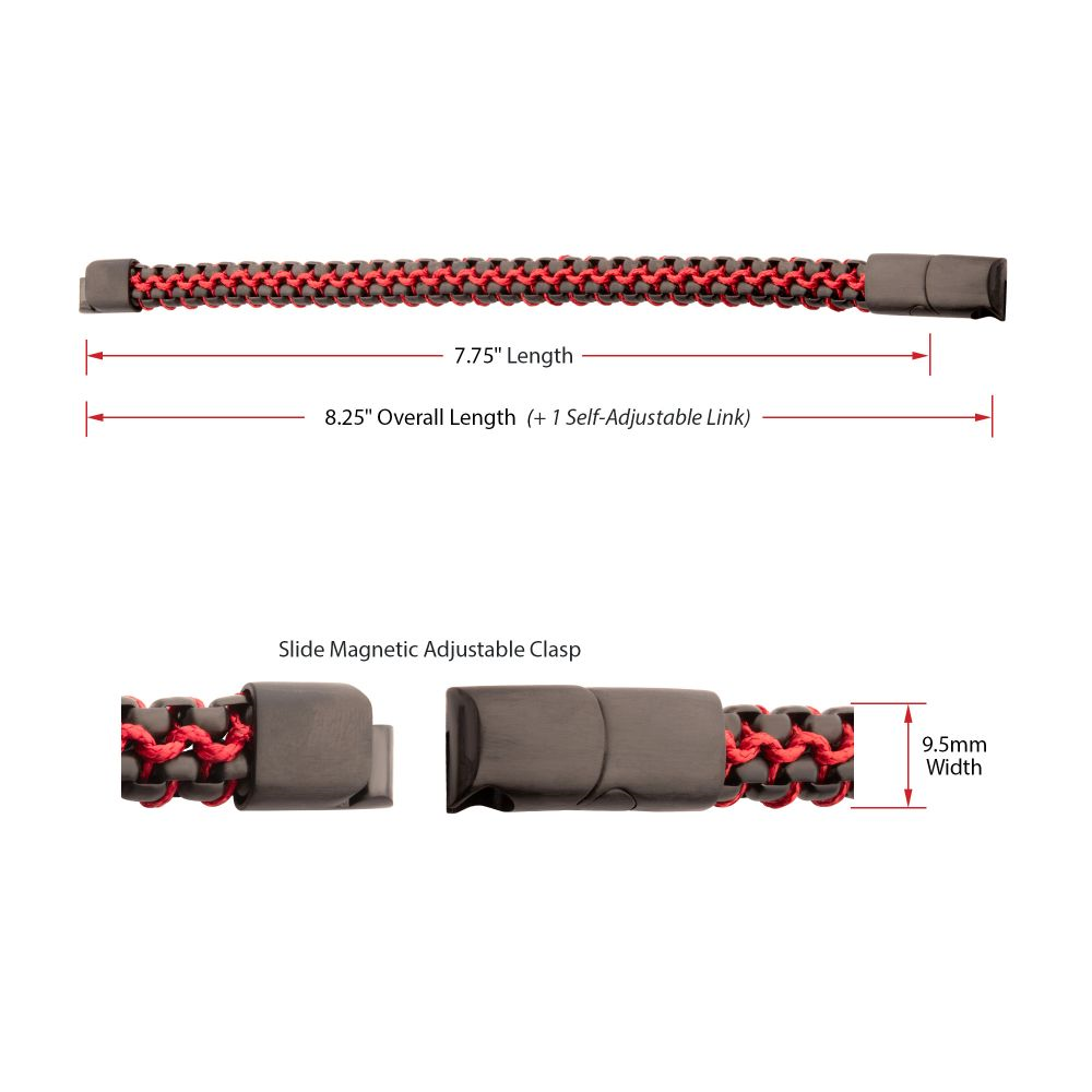 Bold and lightweight, this matte black IP stainless steel bracelet features a rugged box-chain weave accented with vibrant red waxed cord. Designed for everyday durability, it secures with a sleek slide magnetic clasp and fits wrists from 7.75" to 8.25" comfortably. A standout accessory with modern athletic style.