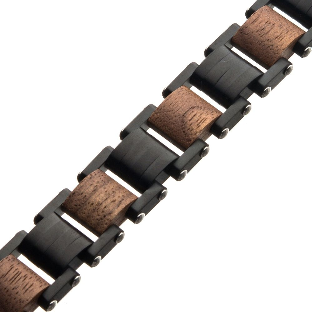 Crafted with a bold mix of materials, this black-plated stainless steel link bracelet features genuine walnut wood inlays for a rugged, refined look. The fold-over clasp provides secure wear, and it includes one self-adjustable link to allow the bracelet to fit comfortably from 7.75" to 8.25". A perfect everyday piece with a modern, earthy style.
