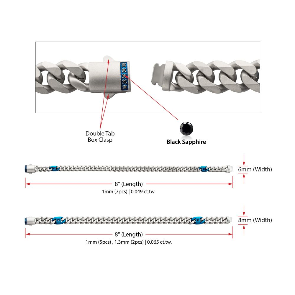 This men’s ocean steed bracelet features a matte stainless steel beveled Cuban design with blue IP accent links and black sapphire details, delivering bold, modern style inspired by strength and movement.