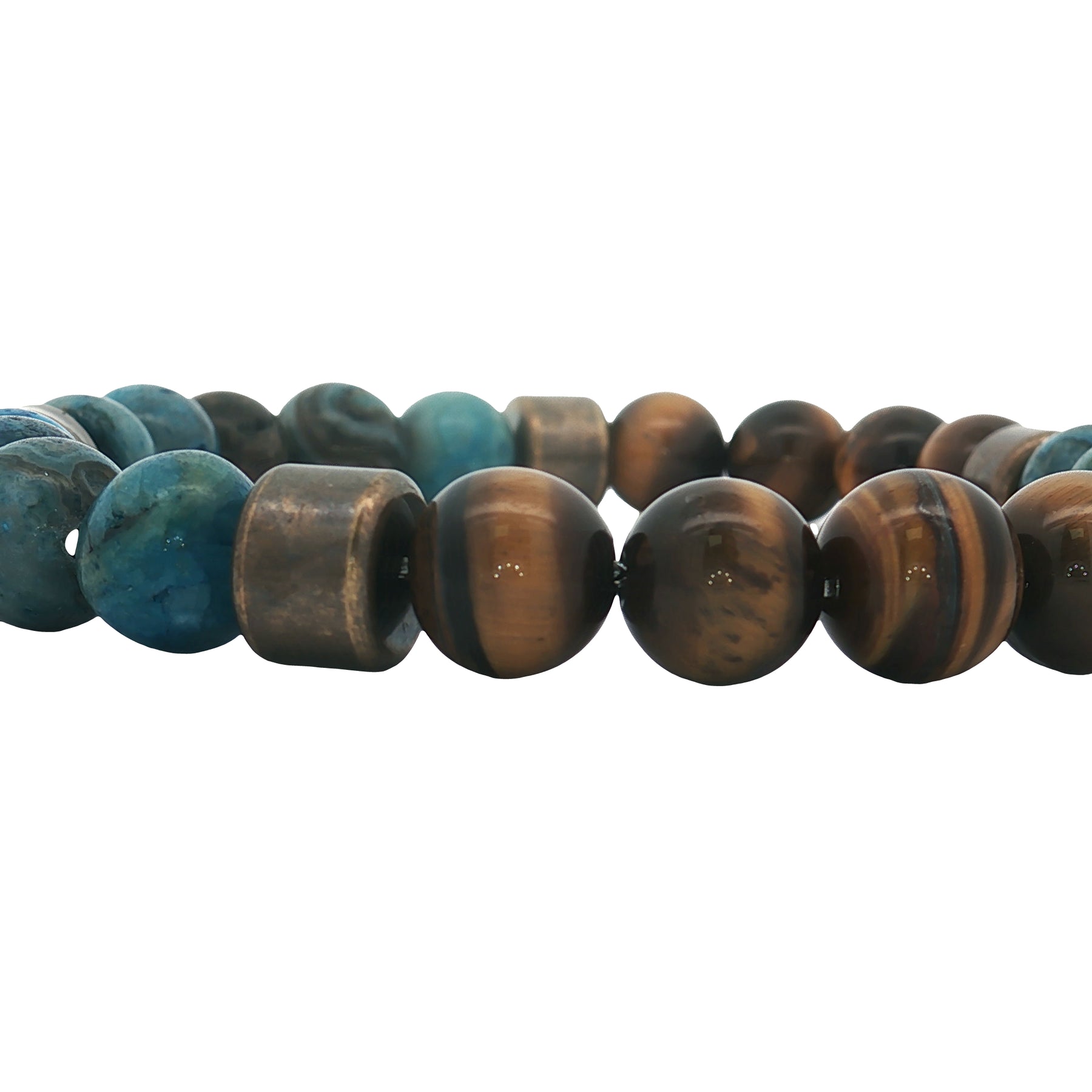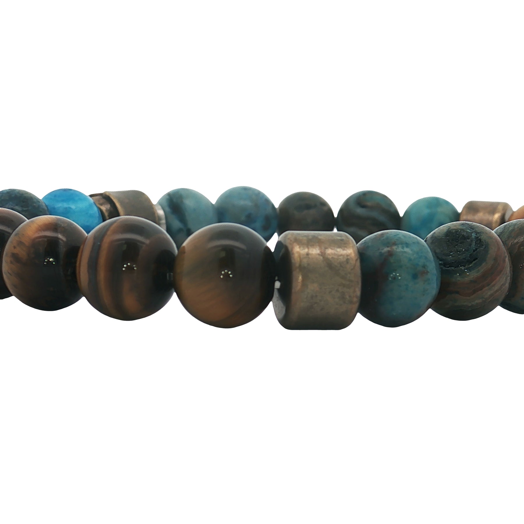 Crafted for those who value bold style and natural elegance, this bracelet blends earthy warmth with cool ocean tones. The 8mm genuine blue crazy lace agate and tiger eye beads create a captivating contrast, enhanced by stainless steel accents and rustic spacers for a rugged yet refined look.