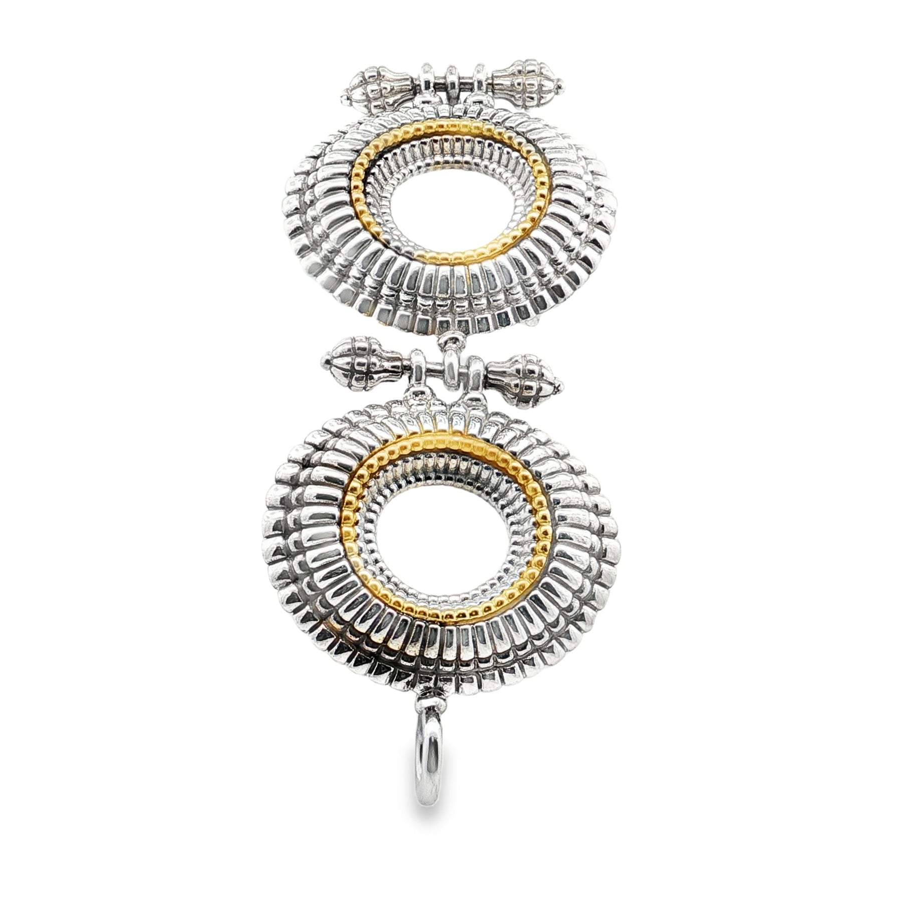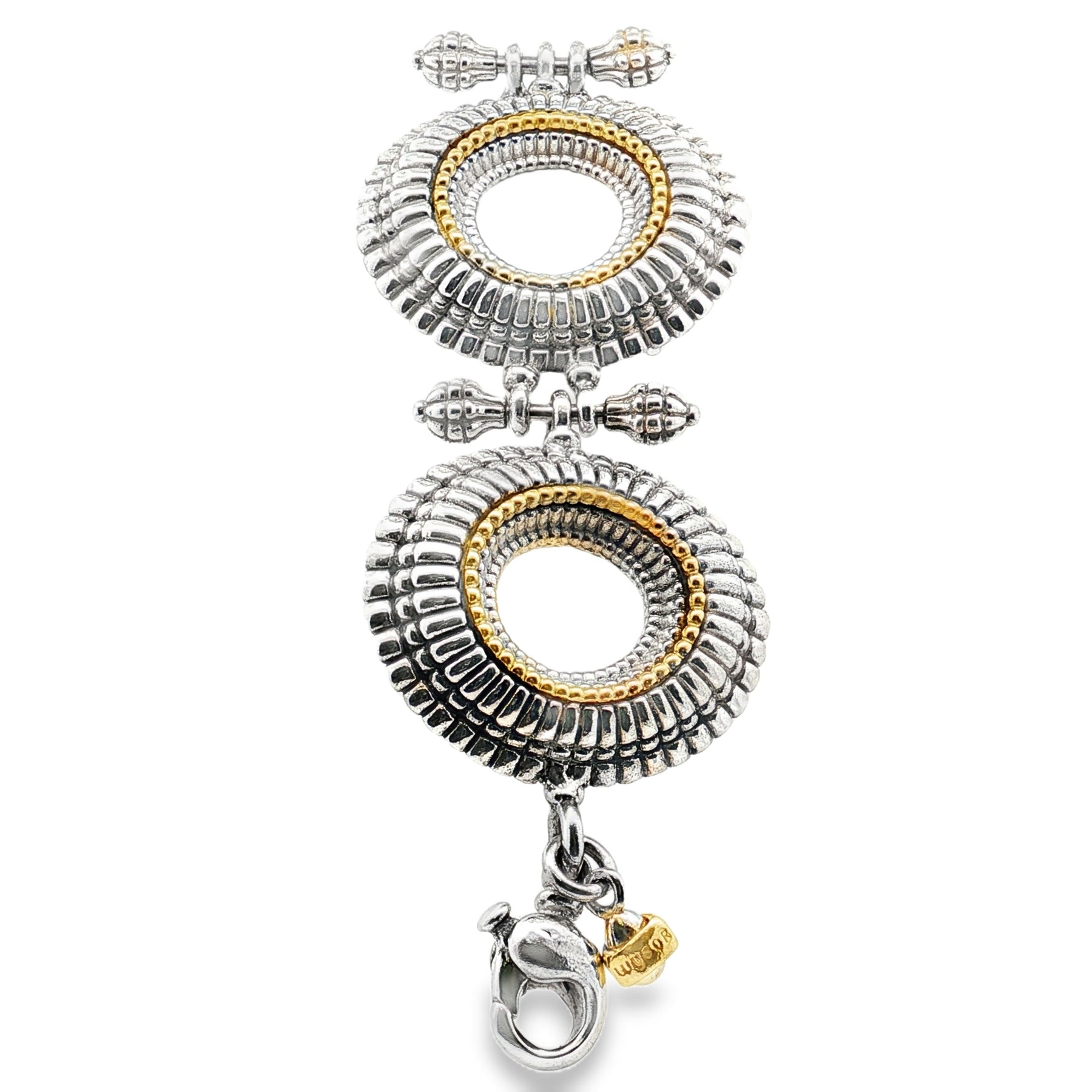 This striking estate bracelet, designed by Wysor, is a bold statement piece crafted in sterling silver and accented with 18K gold. Its heavy weight construction speaks to quality and durability, while the ornate circular link design reflects Wysorโs signature craftsmanship. Measuring 8" in length with 1.5" wide links, this bracelet offers a substantial and luxurious feel on the wrist. A second-hand estate treasure, it blends timeless artistry with enduring strength.