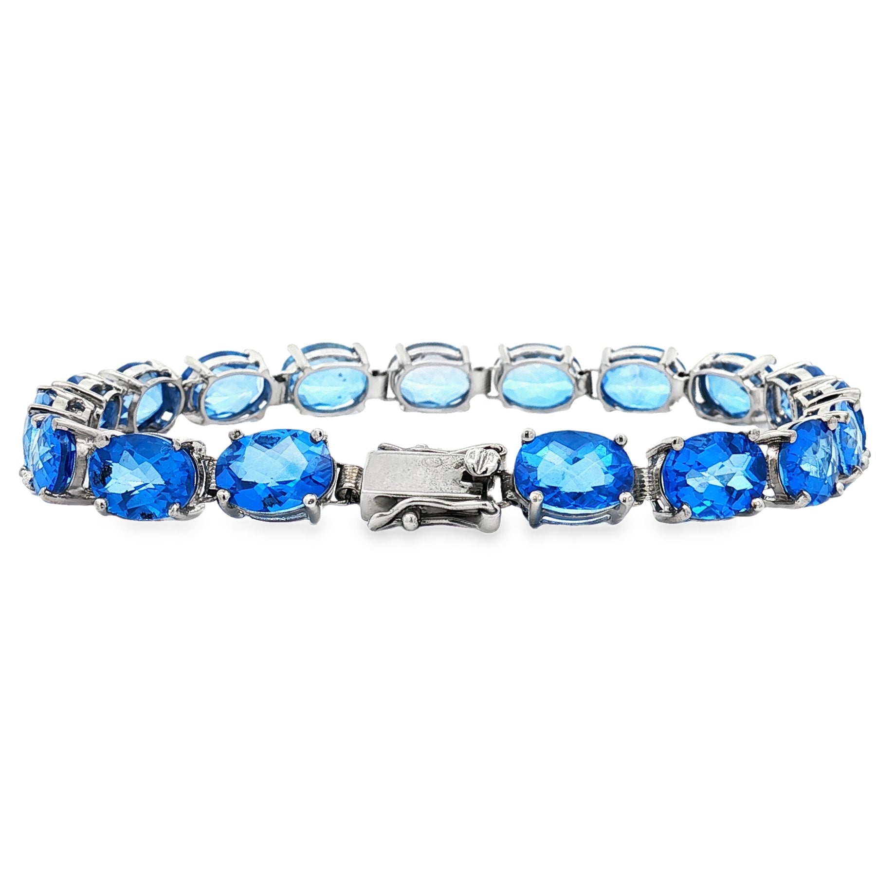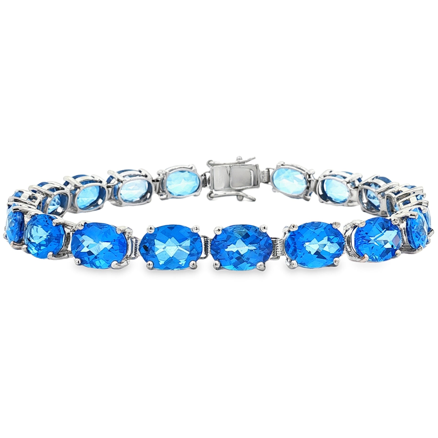 Brilliant and bold, this sterling silver bracelet showcases the radiant beauty of topaz. With a total weight of 21.78ct, the oval-cut blue topaz stones sparkle with captivating depth and color. Measuring 7" in length, the bracelet offers a secure fit and timeless elegance—perfect for adding vibrant sophistication to any look.