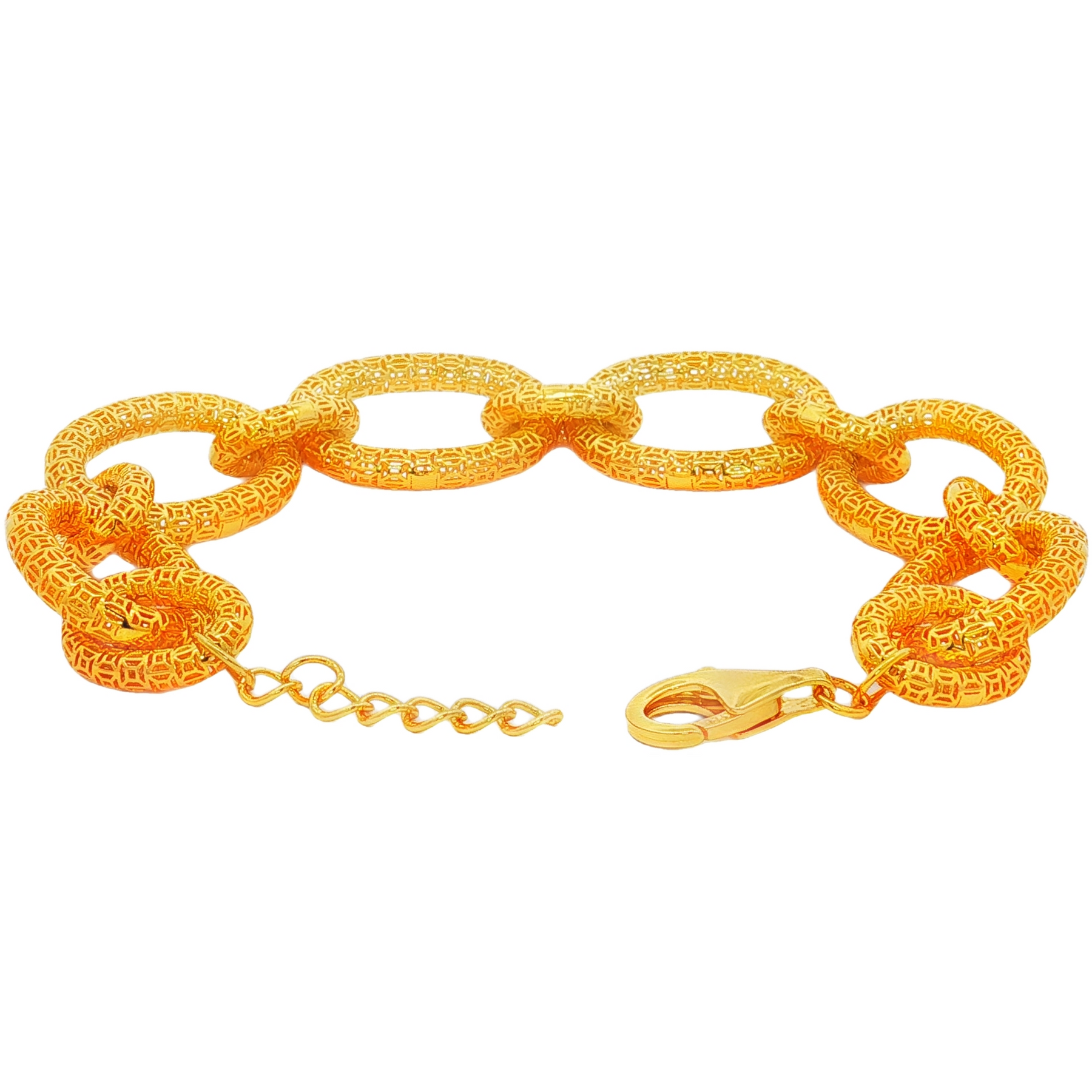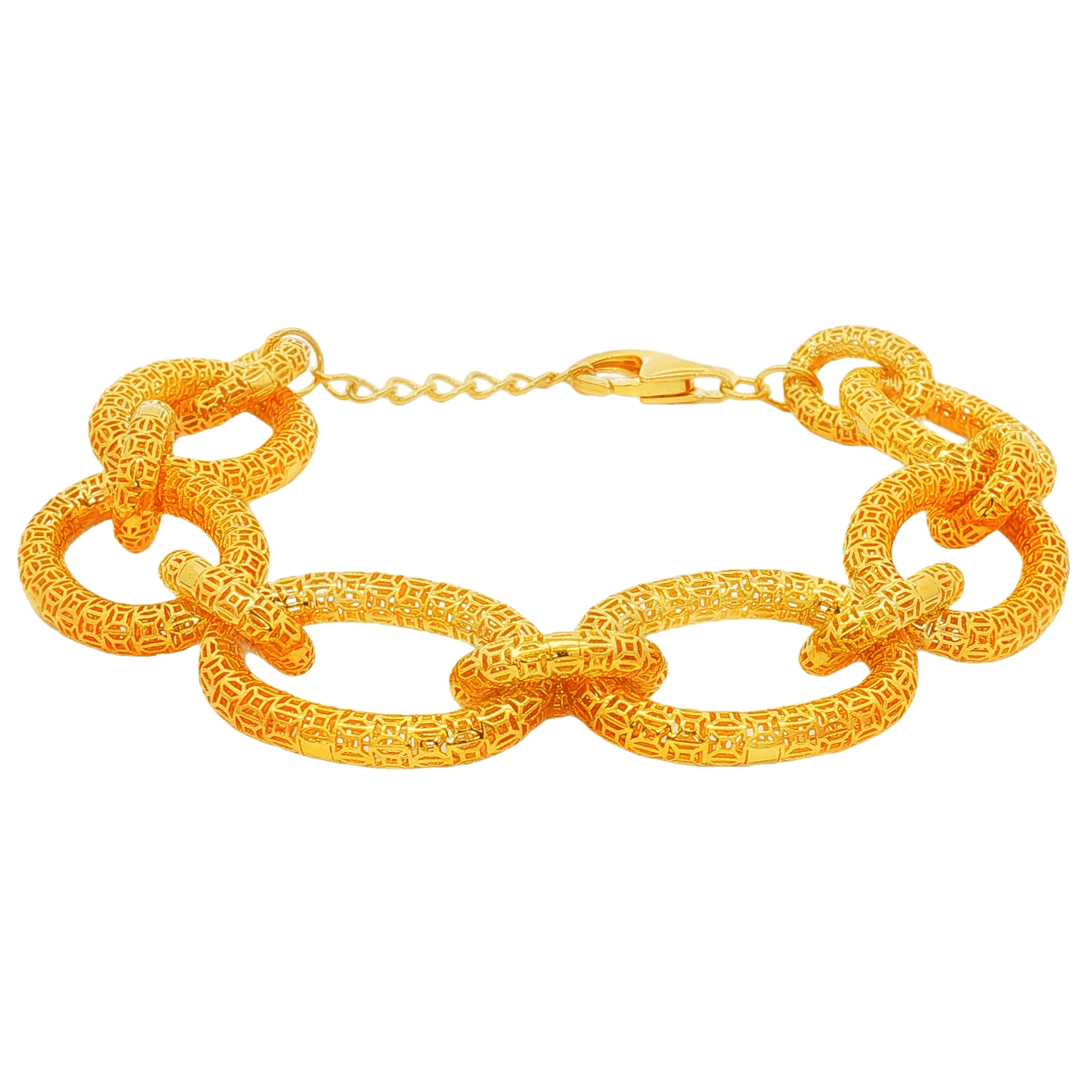 This 9" sterling silver bracelet plated in rich 22K gold combines modern design with timeless elegance. Crafted using advanced 3D printing technology, the interlocking links feature intricate openwork patterns, giving the bracelet depth and dimension while keeping it lightweight and comfortable. Finished with a secure lobster clasp and extender chain, it offers a bold yet versatile style that pairs beautifully with both casual and formal looks.