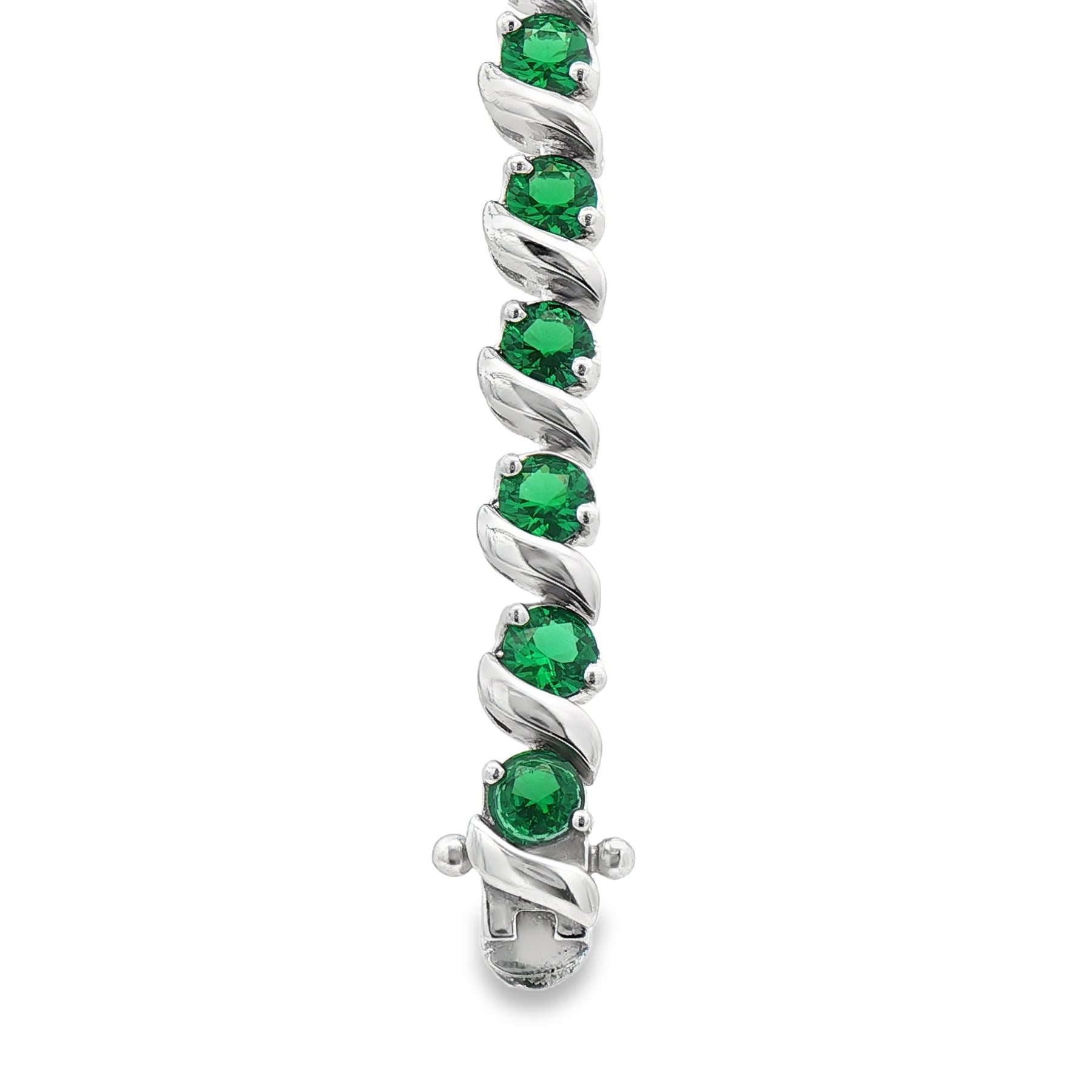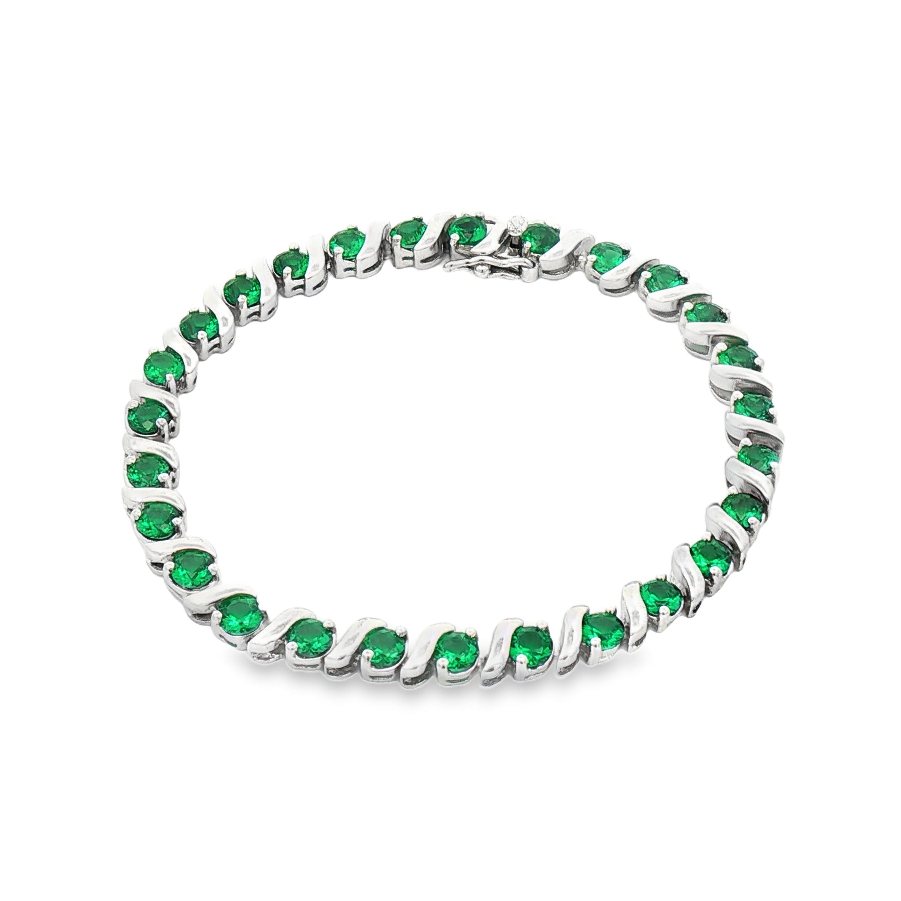 Crafted in sterling silver, this bracelet features 6.06 carats total weight of lab-created emeralds set in a flowing, wave-inspired design. The vibrant round green stones contrast beautifully against polished silver, creating bold color and elegant brilliance. Measures 7.25 inches and secures with a box clasp.