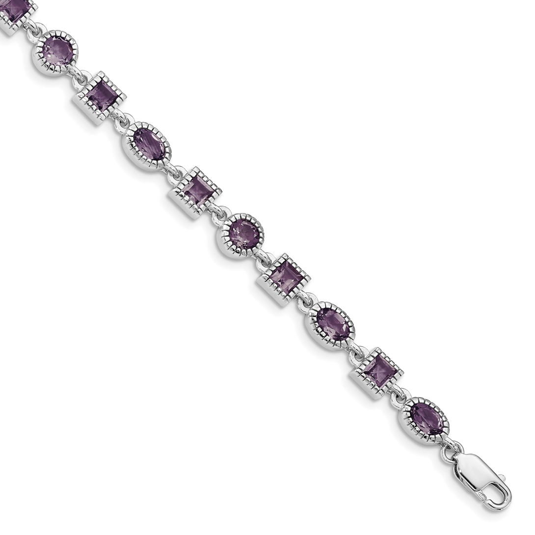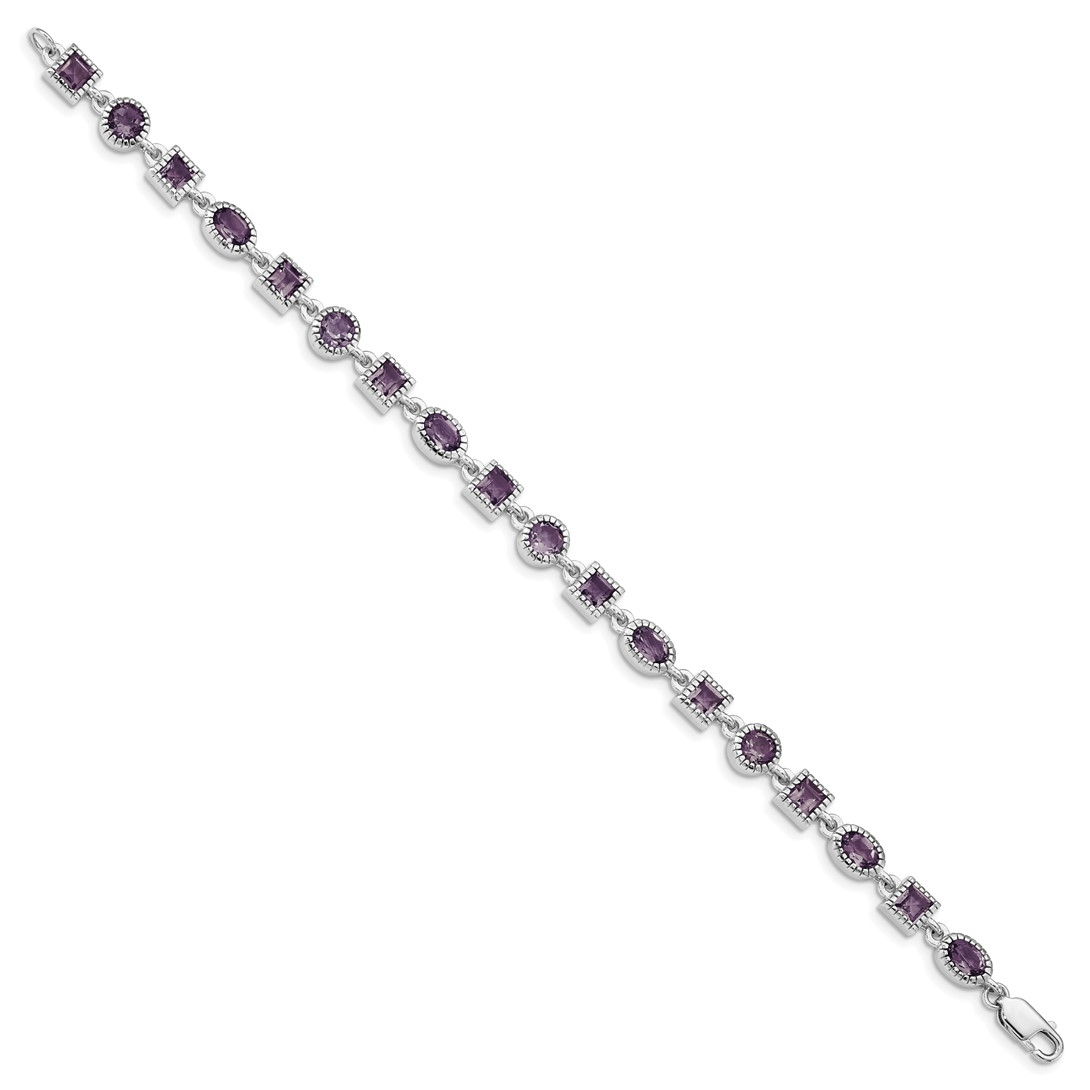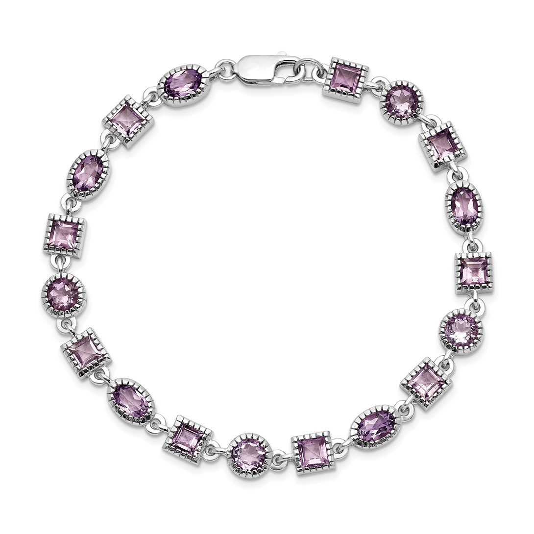 Add a touch of regal color with this 7" sterling silver rhodium-plated bracelet, featuring a stunning 6.15 carat total weight of rich purple amethyst gemstones. Each gem is beautifully cut and securely set, offering a perfect balance of sparkle and sophistication. The rhodium plating enhances brilliance and provides lasting durability, making this bracelet an ideal statement piece for both everyday elegance and special occasions.