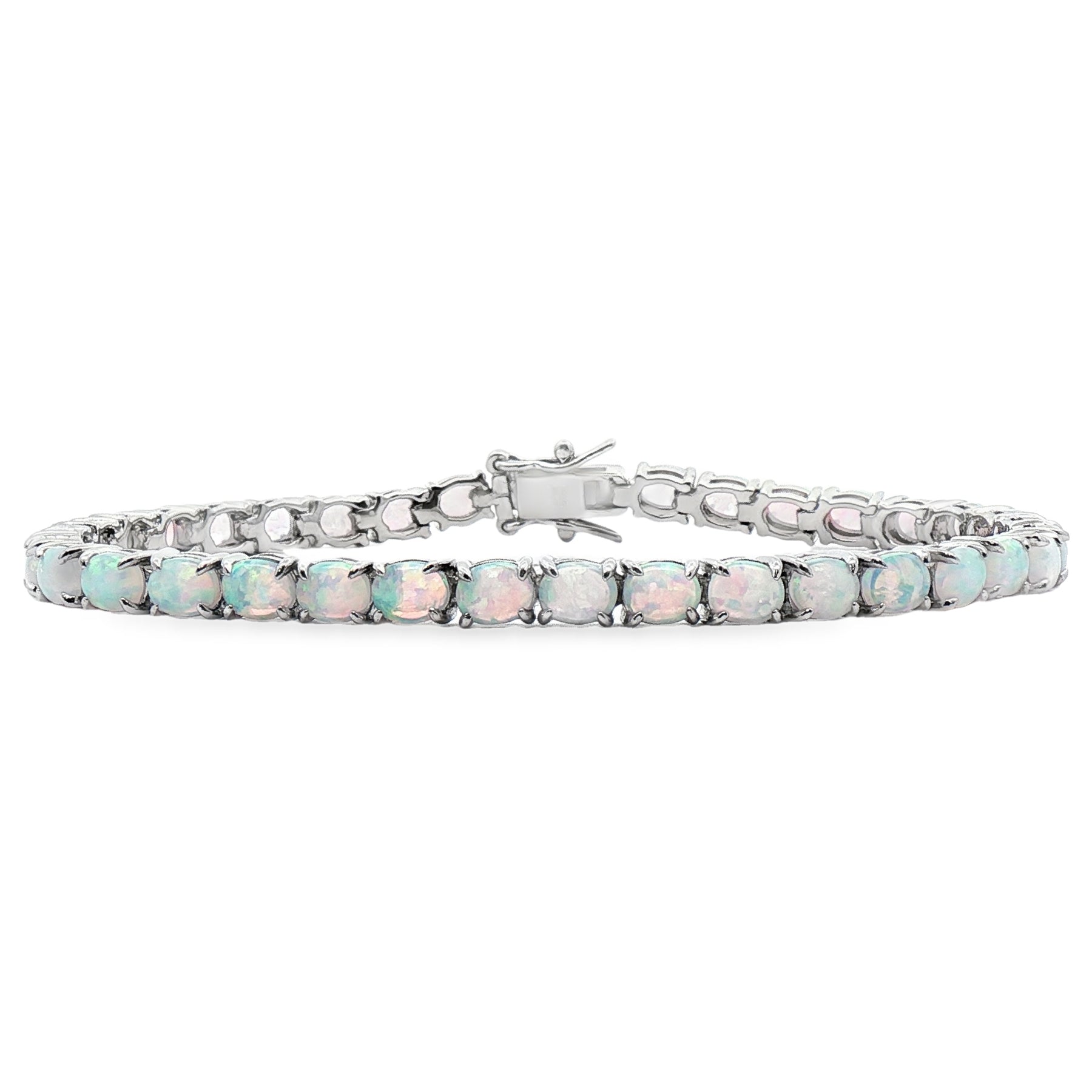 This stunning 7.25-inch sterling silver bracelet showcases 6.45 carats of shimmering lab-created opals. Each round stone glows with flashes of color, offering a timeless and elegant look. Perfect for adding a touch of sophistication to any style. Details: š Metal: Sterling Silver š Stones: 6.45ct Lab-Created Opal šØ Color: White with multi-color play š Length: 7.25" š Clasp: Secure closure š©āš¼ Gender: Ladies