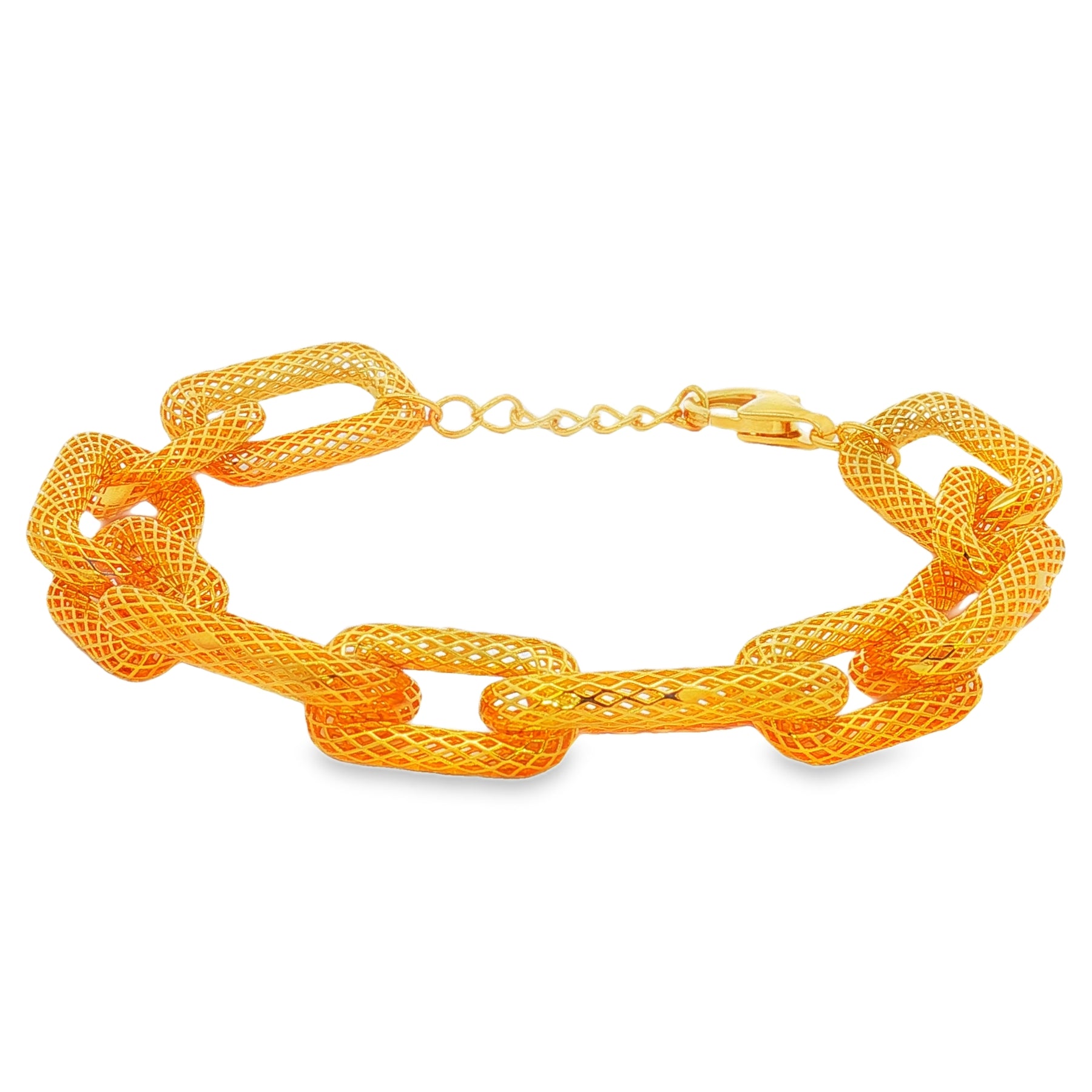 Crafted with modern design and artisanal detail, this sterling silver bracelet features a radiant 22K yellow gold plating and bold 3D printed links. The intricate openwork texture adds depth and dimension, while the 9" length provides a comfortable, secure fit. A lobster clasp ensures durability and ease of wear, making this bracelet the perfect mix of innovation and timeless style.