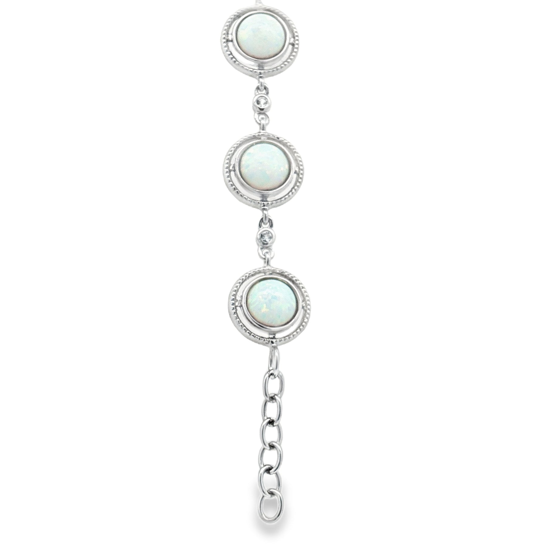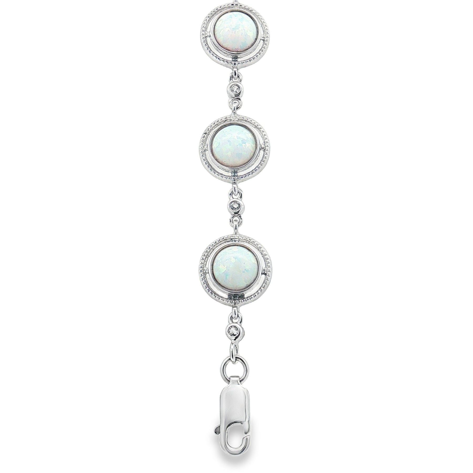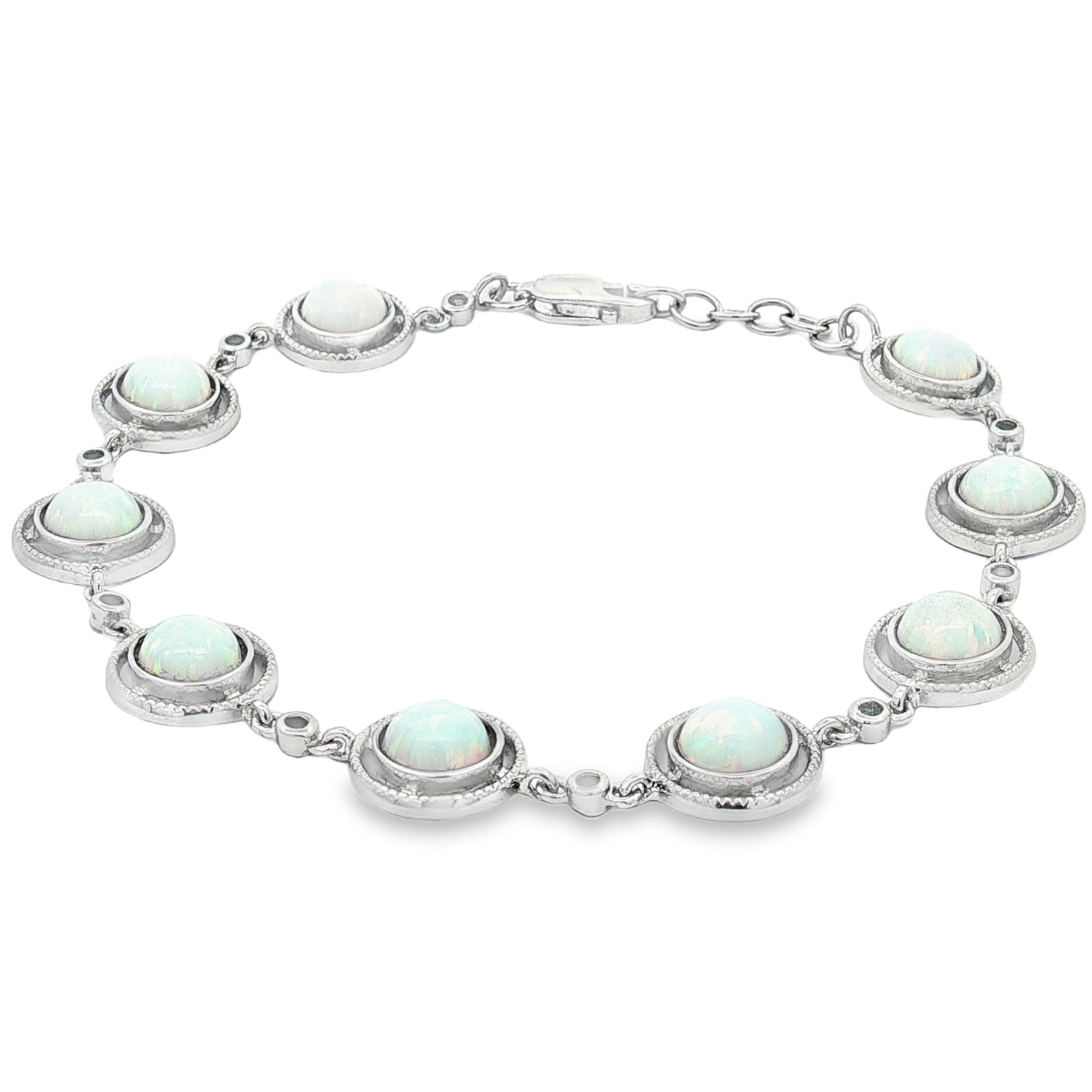 Add a touch of timeless shimmer with this 7-inch sterling silver bracelet featuring radiant lab-created opals. Each luminous round opal displays a captivating play of color—soft flashes of blues, greens, and pinks—set in elegant sterling silver bezels.