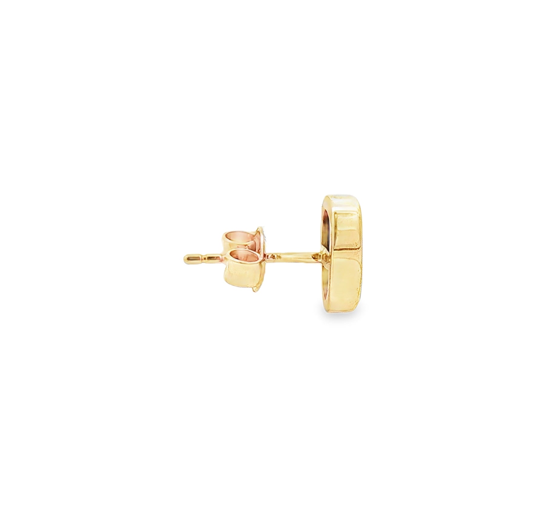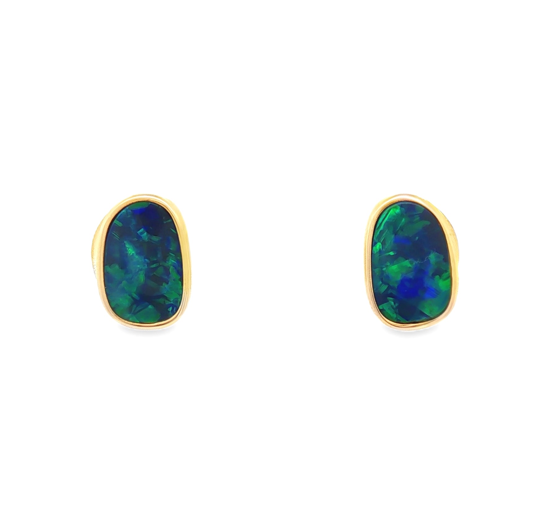 These 14K yellow gold earrings feature 1.95ct total weight free-form doublet opals with vibrant green and blue flashes, set in polished bezels for bold yet refined elegance.