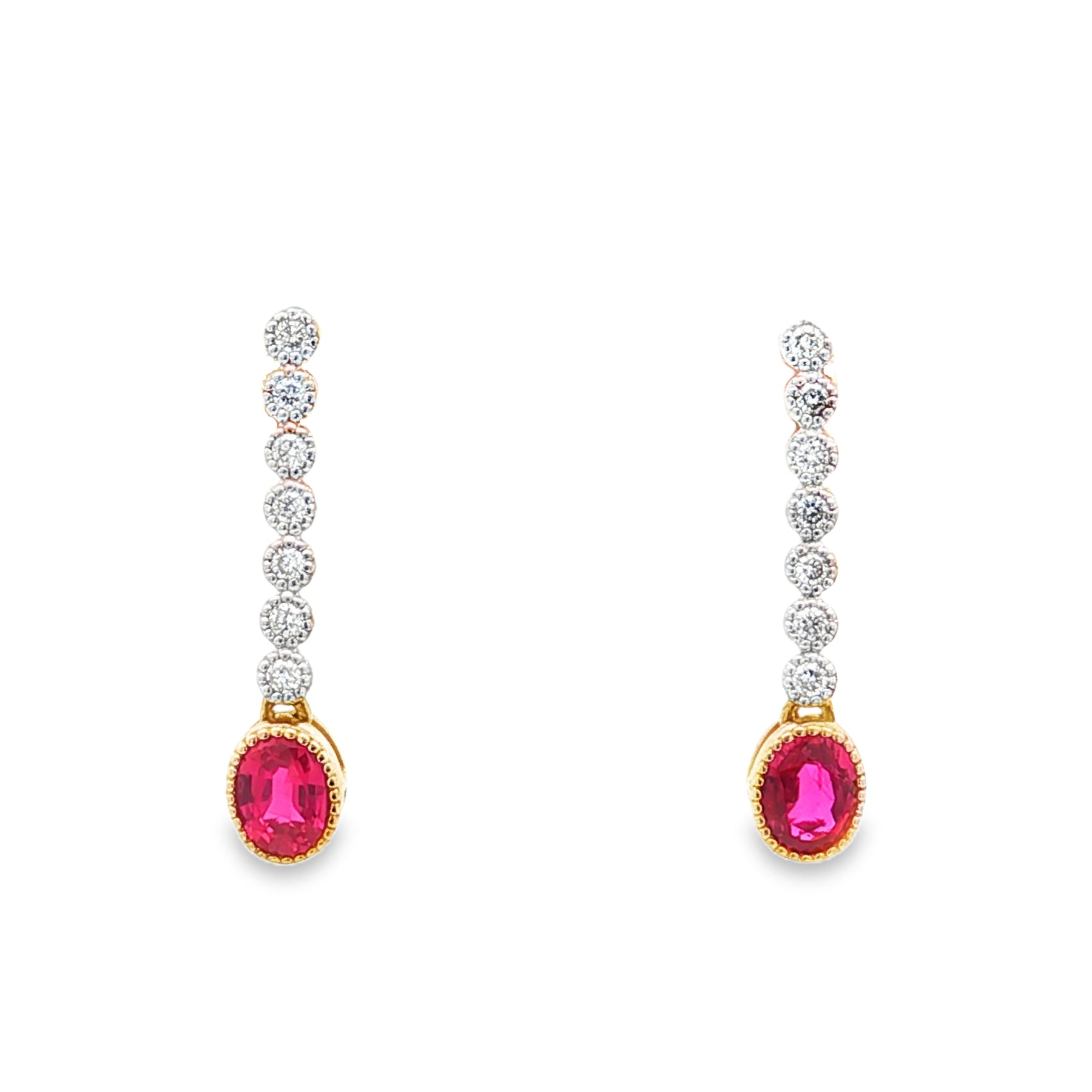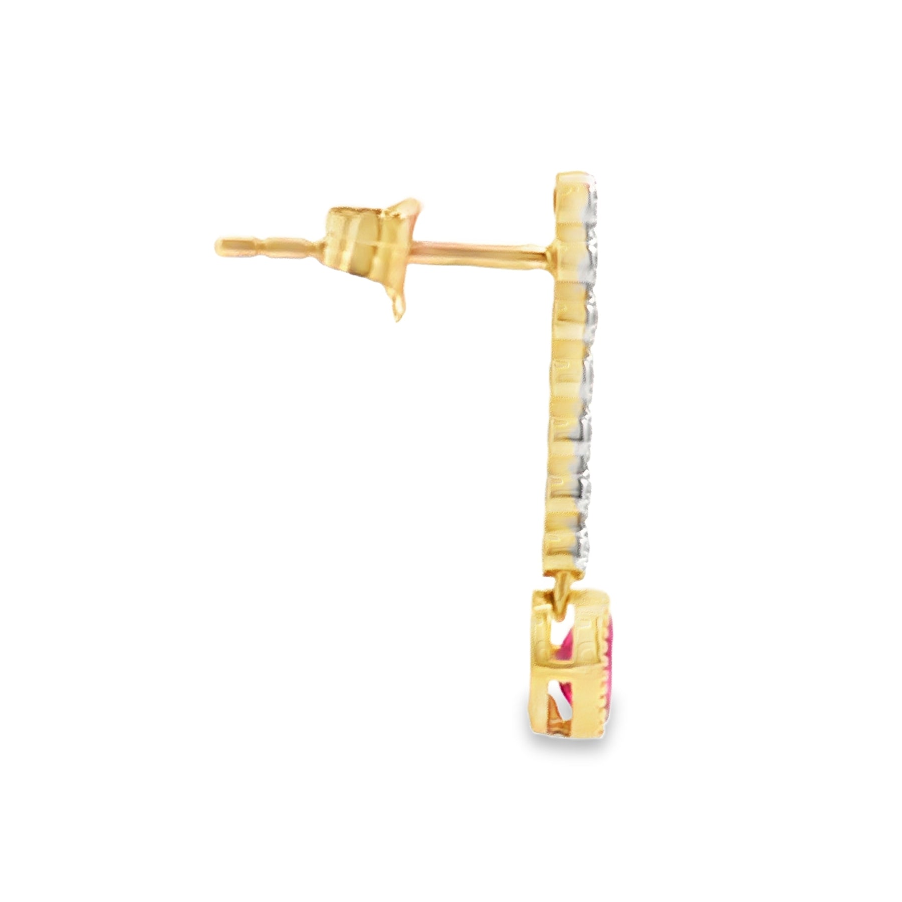 These elegant earrings showcase the timeless allure of rubies and diamonds. Crafted in 14k yellow gold, each earring features a .19ct oval ruby (totaling .38ct) suspended from a line of sparkling .09ct total diamonds. A graceful design that brings rich color and refined brilliance to any occasion.