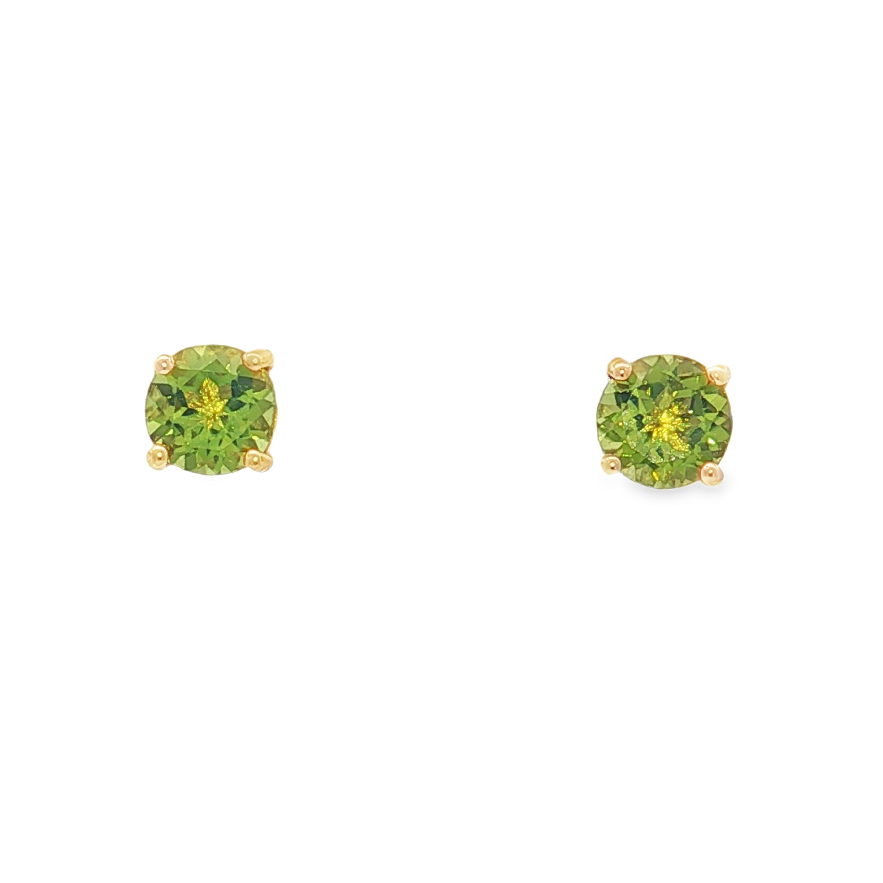 These 14K yellow gold stud earrings showcase vibrant round-cut peridots totaling .9 carats. Their fresh green sparkle adds a lively, natural charm that brightens any outfit — elegant, minimal, and full of color.
