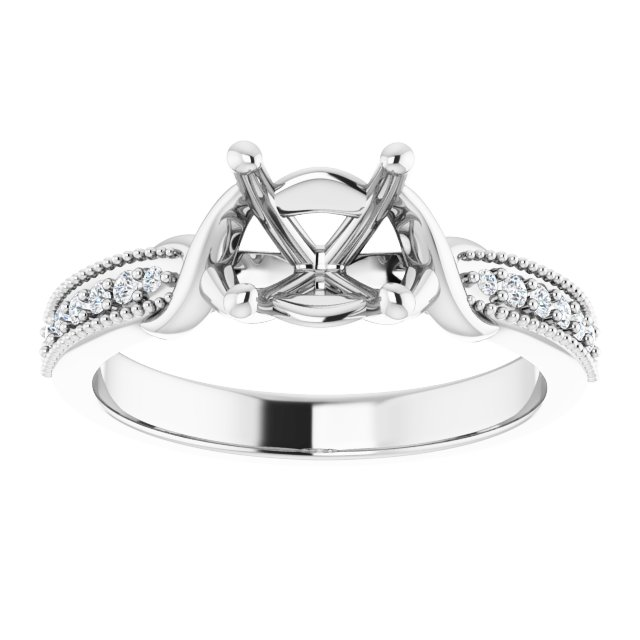 Mounting Only ā ready for your perfect center stone. This elegant 14K white gold semi-set engagement ring is designed to hold a 6.5mm (1ct) round diamond or gemstone of your choice. The band sparkles with .1 carat total weight of natural diamonds, accented by vintage-inspired milgrain details and gracefully intertwined shoulders. A timeless and meaningful design, ready to be customized with your chosen center stone.