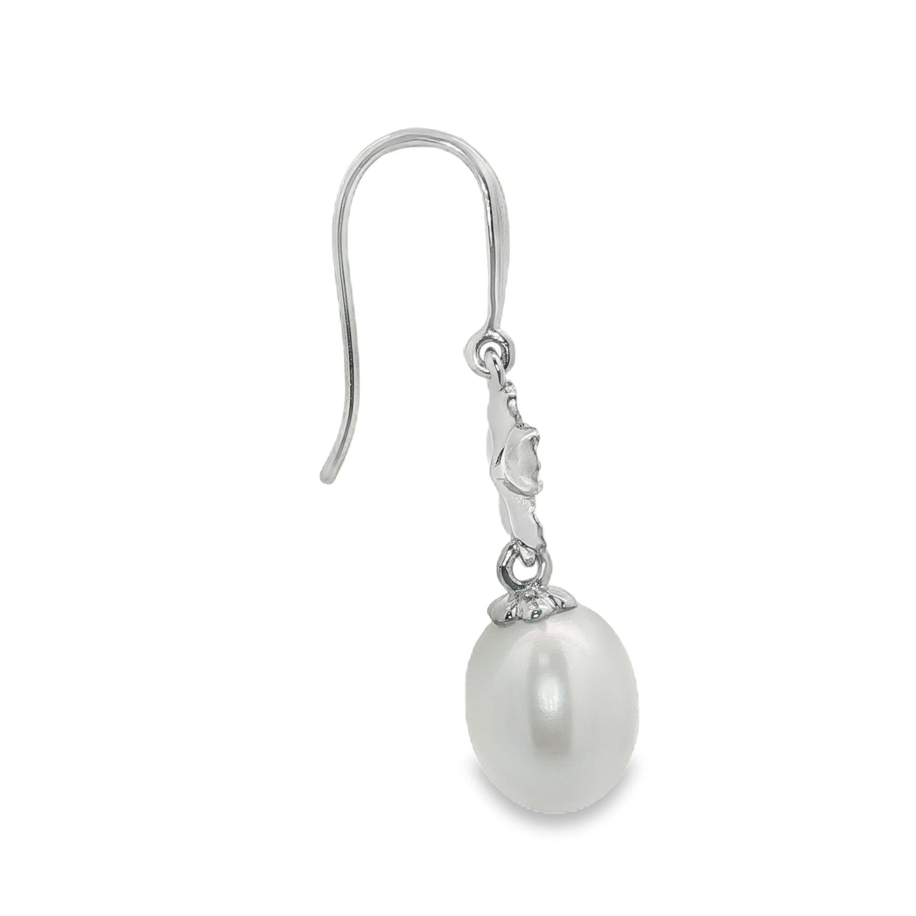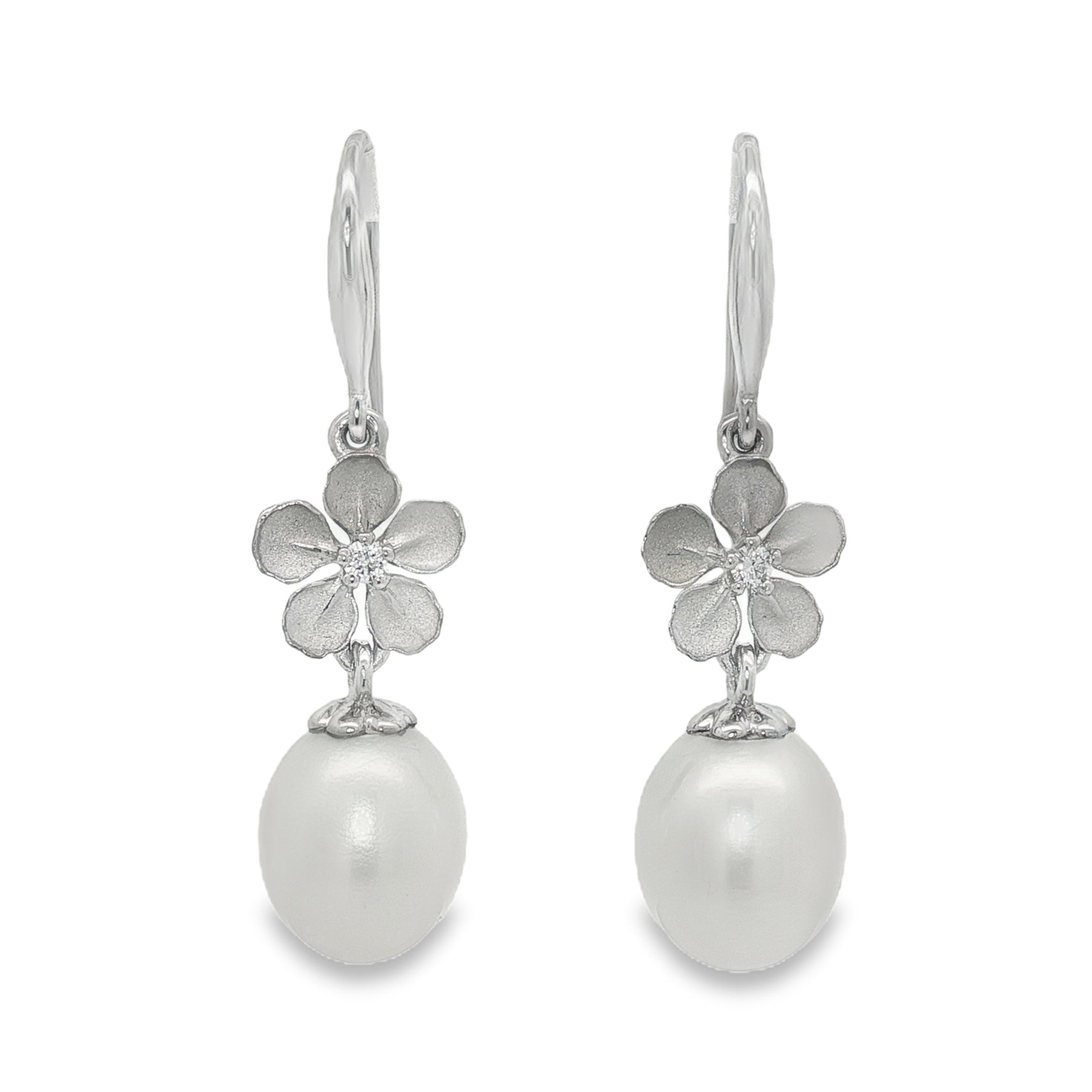 These elegant 14K white gold drop earrings feature lustrous freshwater pearls gracefully suspended from a delicate floral design. Each flower is accented with a sparkling diamond, totaling 0.06 carats, adding a touch of brilliance and sophistication. Perfect for any occasion, these earrings are a timeless blend of beauty and elegance, making them a versatile addition to any jewelry collection or a thoughtful gift for someone special.