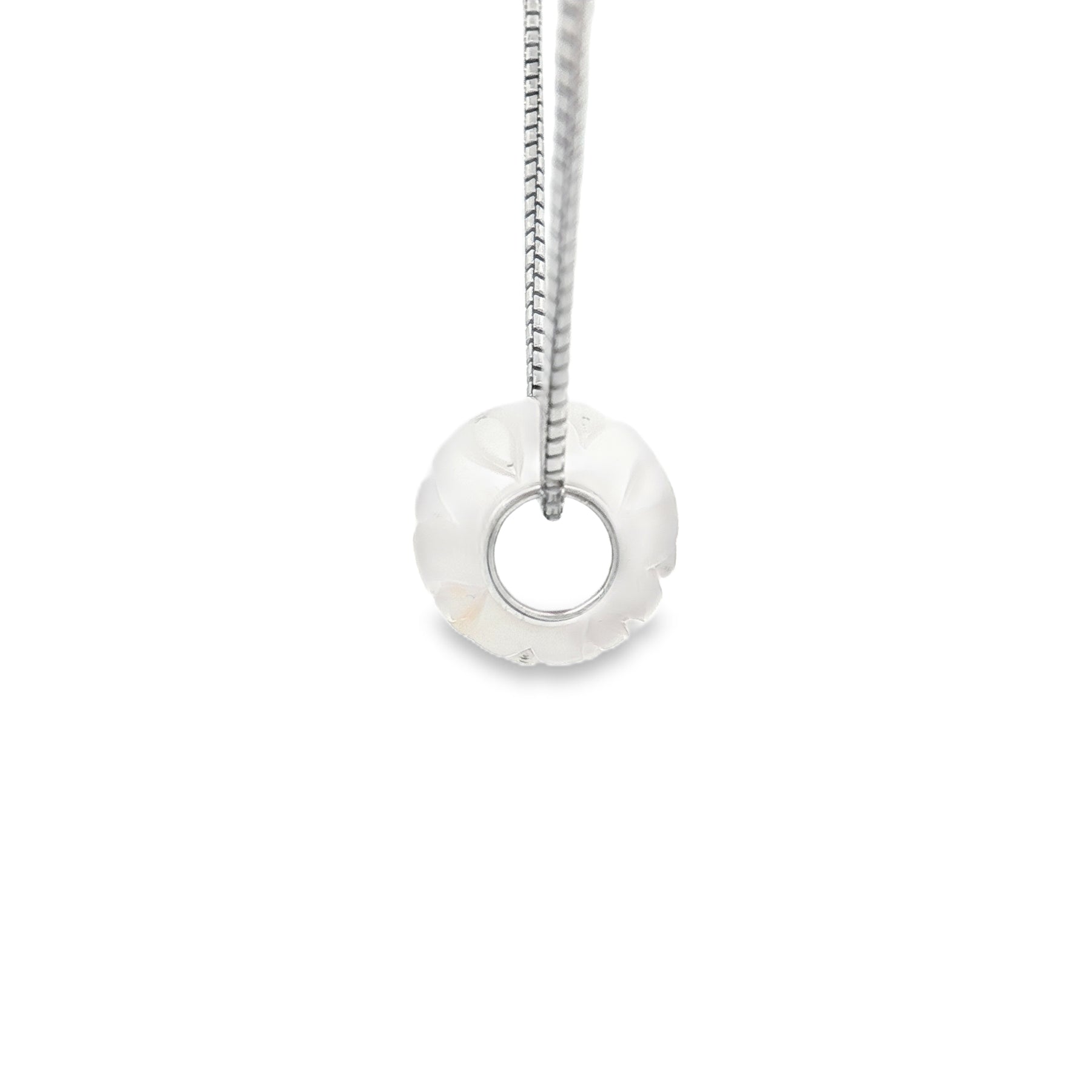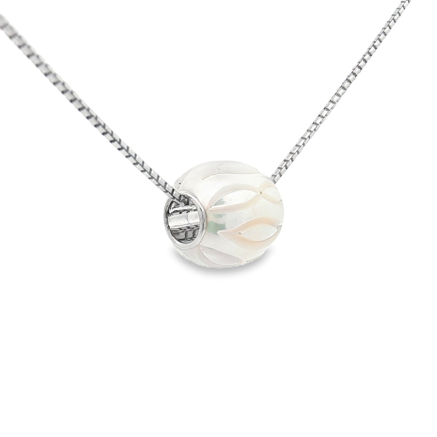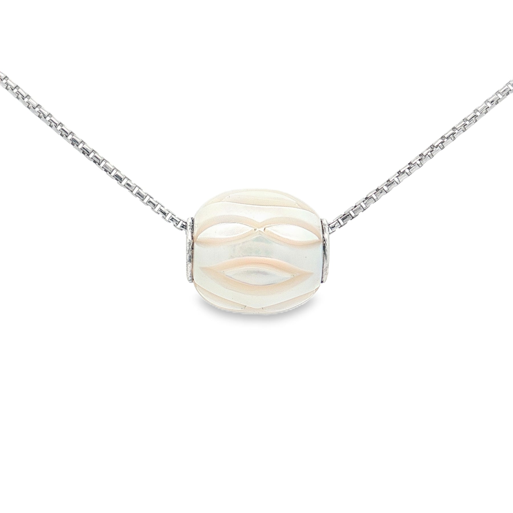 This elegant necklace features a beautifully carved freshwater pearl bead, softly glowing with natural iridescence, suspended on a classic sterling silver chain. Its modern yet organic design makes it a versatile everyday piece with timeless appeal.