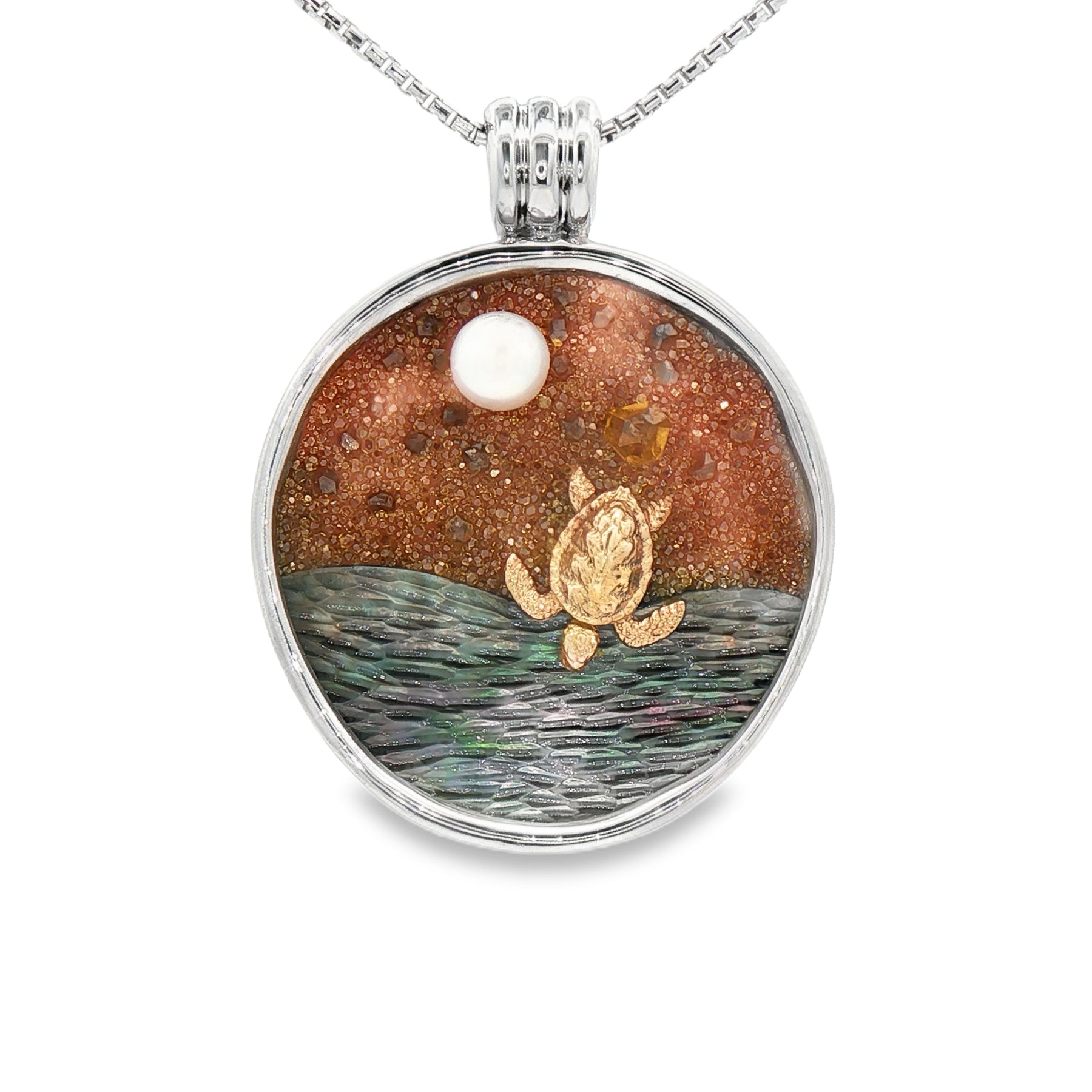 This pendant is crafted in sterling silver and features a detailed 14K yellow gold turtle, symbolizing longevity and grace. The backdrop showcases a shimmering lab-grown diamond druzy in rich red and orange tones, creating a vibrant, ocean-inspired scene. Accented with natural black abalone for iridescent depth and a luminous white freshwater pearl, this piece blends artistry with organic beauty. Suspended from an 18-inch sterling silver chain, it offers a striking yet elegant statement.