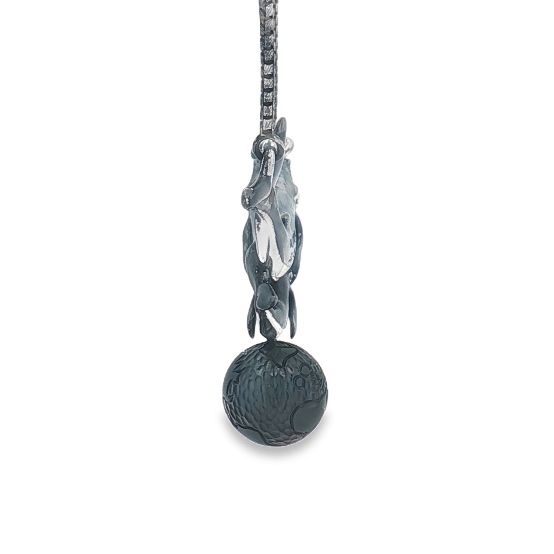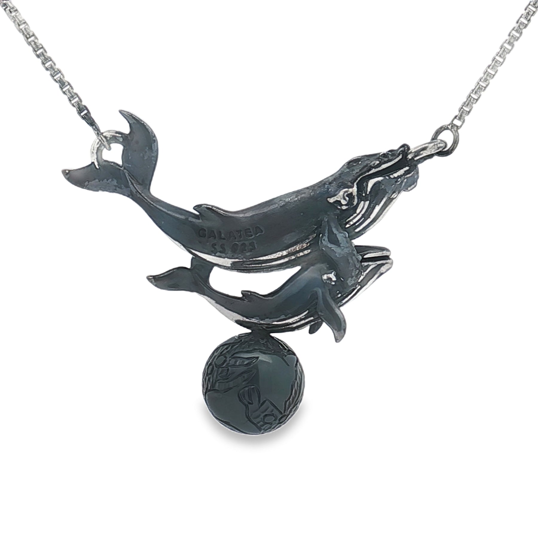 This beautifully crafted sterling silver necklace features a whale and baby calf, captured mid-swim in an elegant, flowing design that symbolizes protection, love, and the deep bond between parent and child. Suspended beneath them is an 11mm Tahitian pearl, celebrated for its rich luster and timeless sophistication.