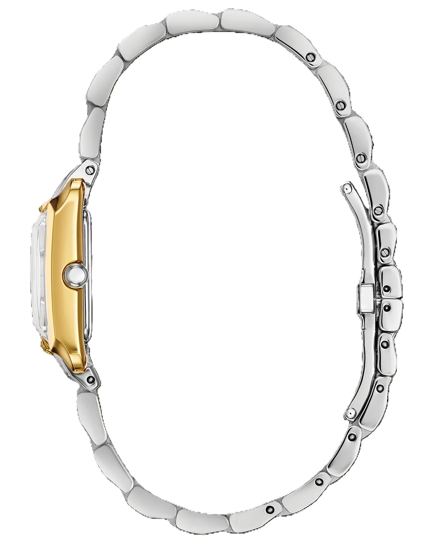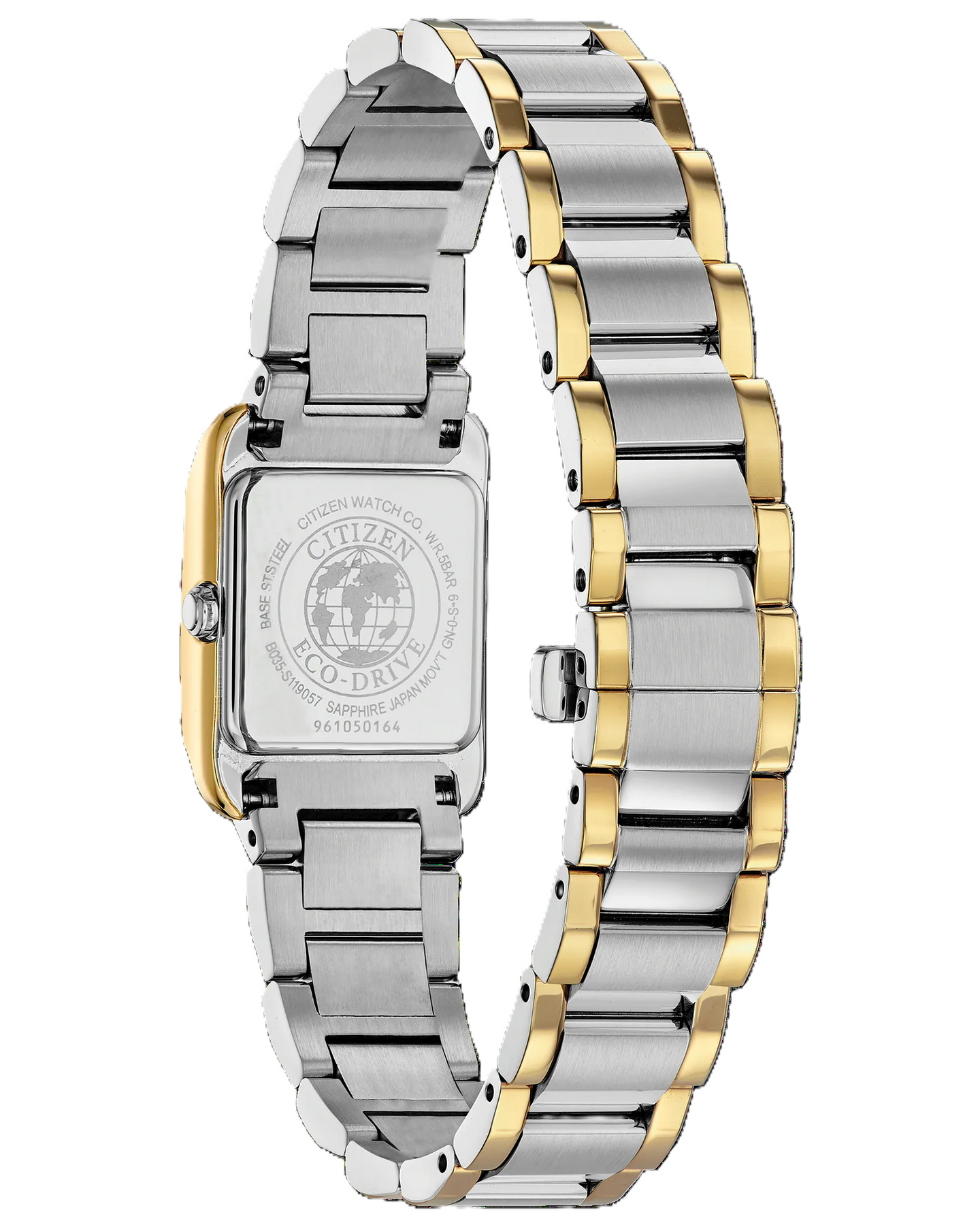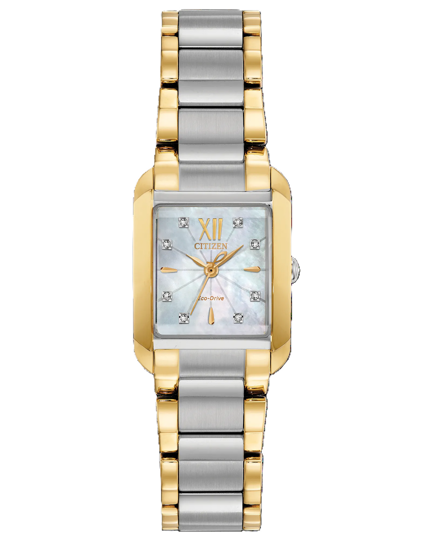 This elegant Citizen L timepiece blends refined style with modern sustainability. The two-tone stainless steel rectangular case frames a luminous mother-of-pearl dial set with sparkling diamond markers for a graceful, elevated look. Powered by Citizen’s Eco-Drive technology, it runs on any light source—never needing a battery replacement. Perfect for daily wear or dressy occasions, this piece brings timeless sophistication to every outfit.