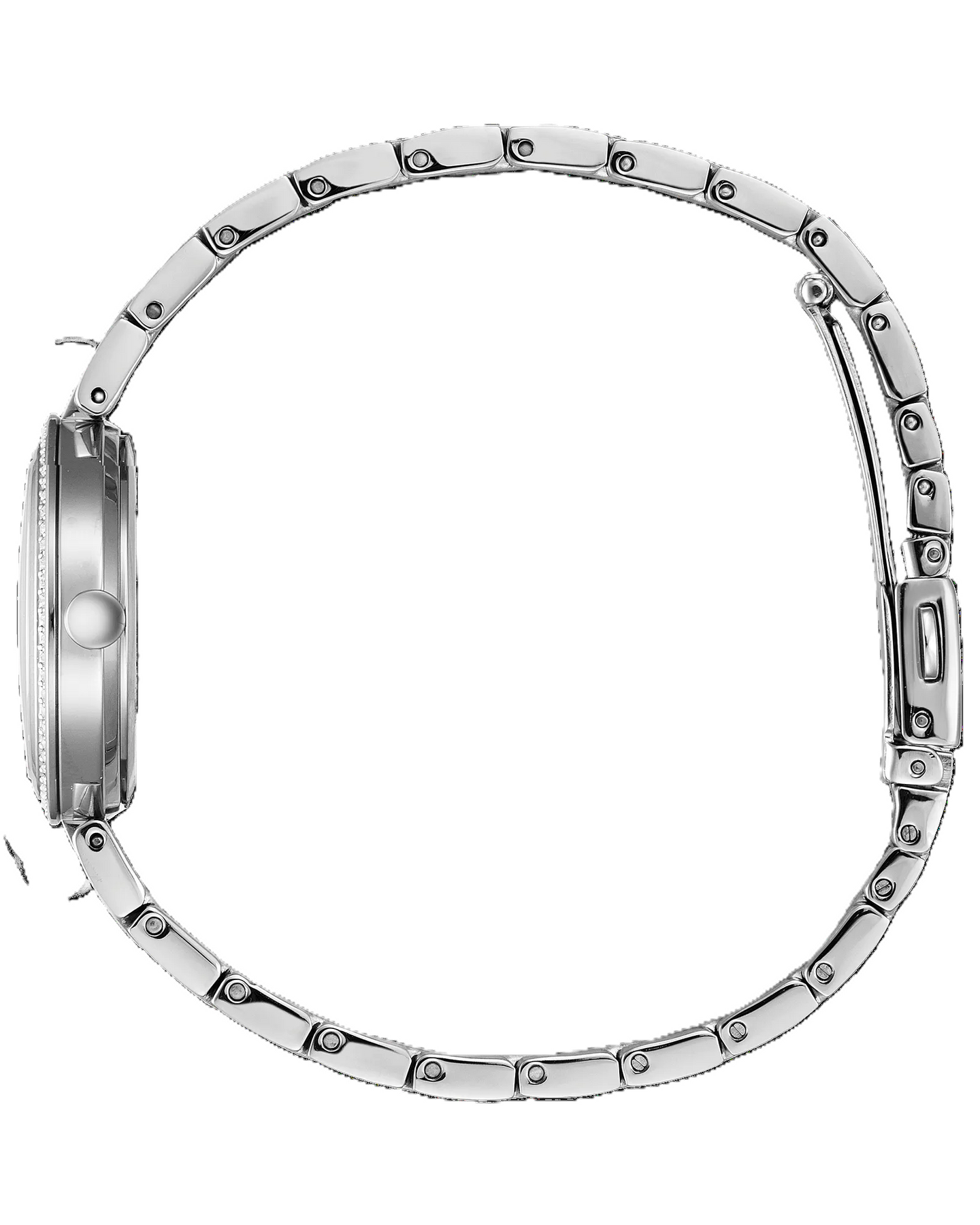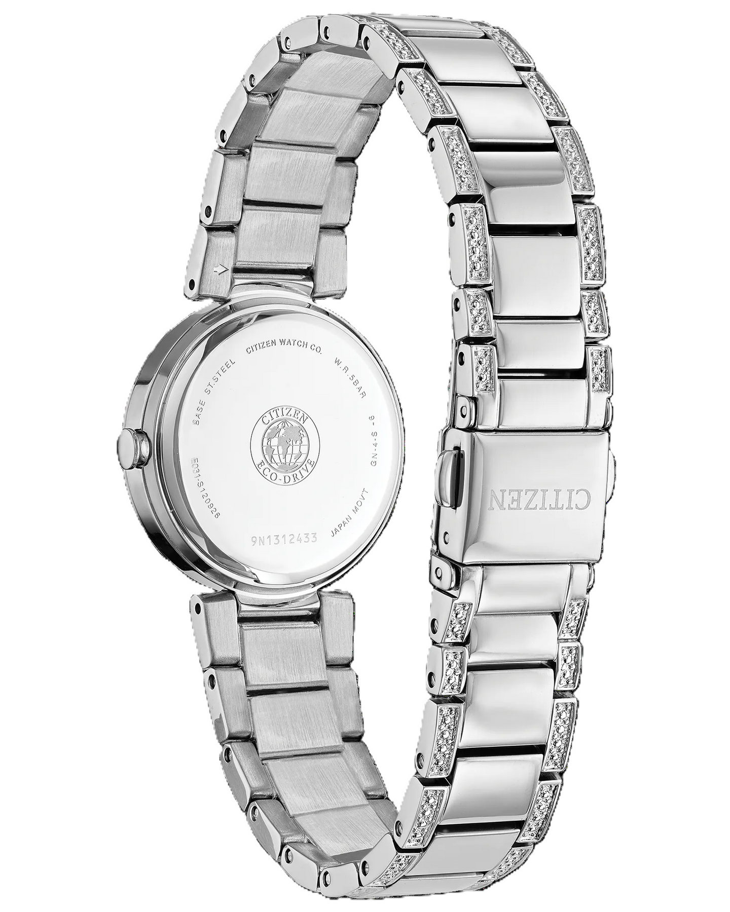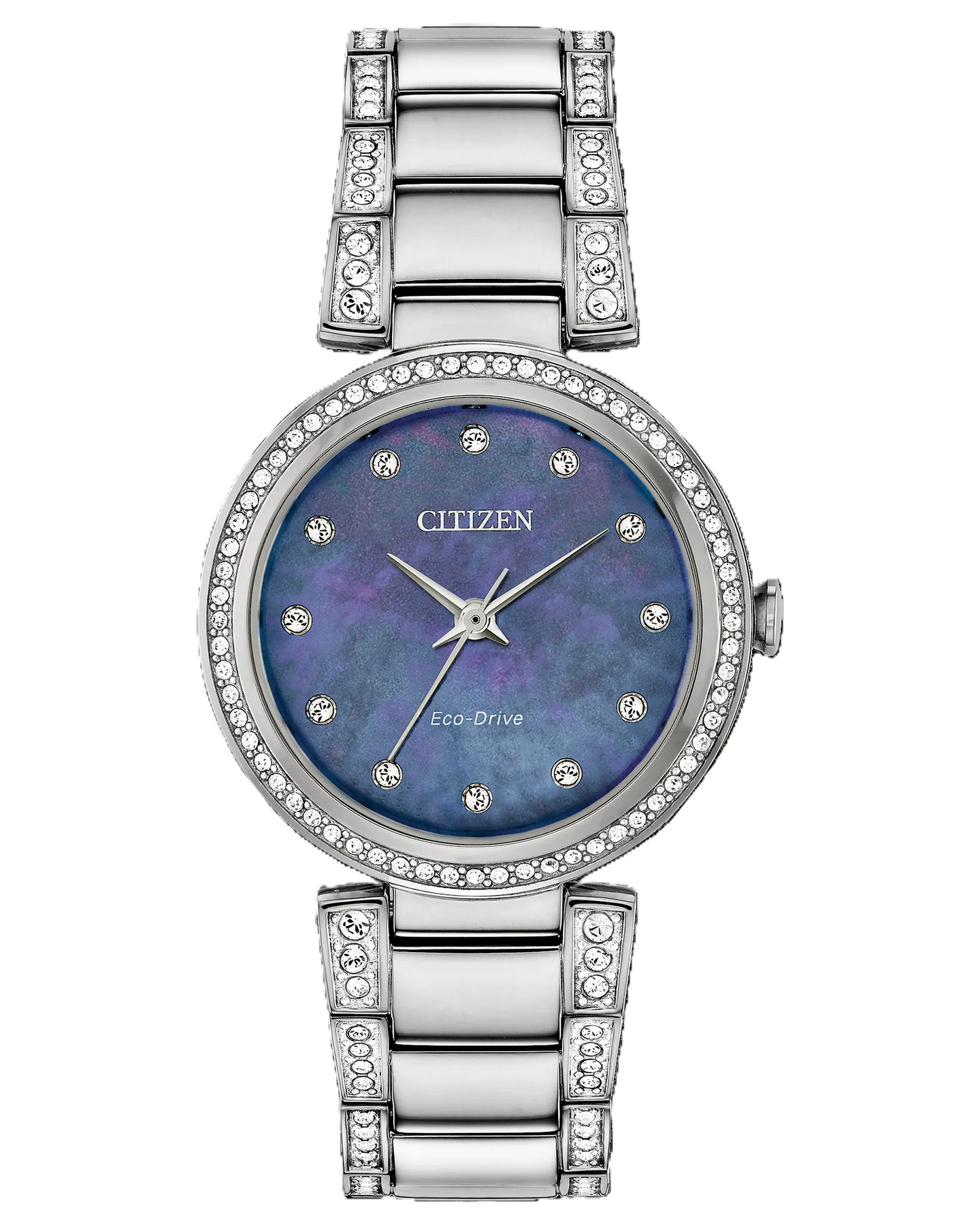 This elegant Citizen Ladies Crystal timepiece brings eye-catching sparkle and everyday versatility. The stainless steel case and bracelet are accented with shimmering crystals, framing a stunning blue mother-of-pearl dial set with crystal hour markers. Powered by Citizen’s reliable Eco-Drive technology, it runs on any light source—no battery needed.