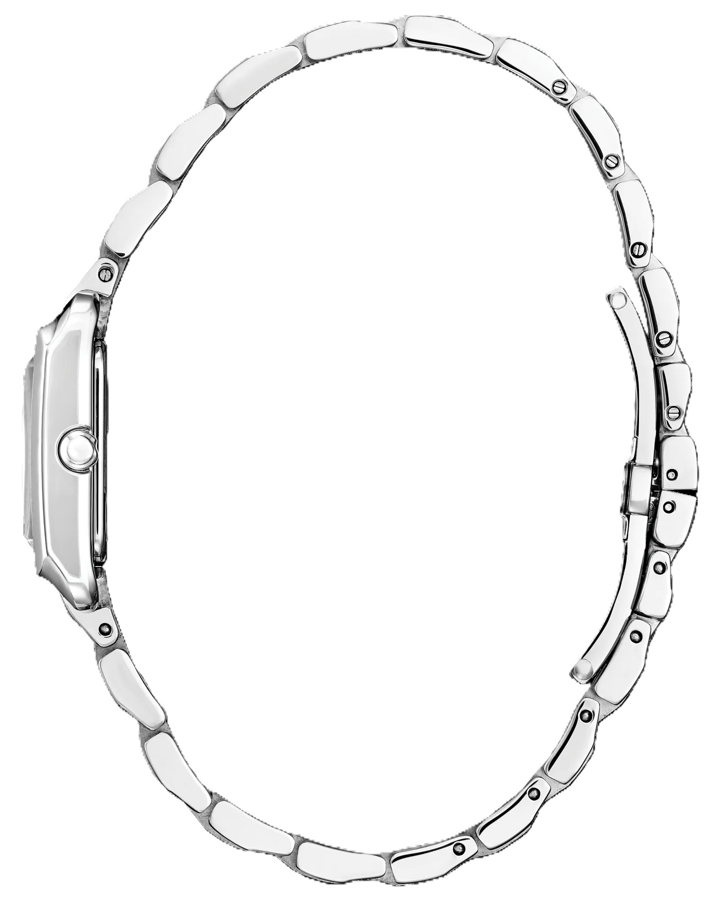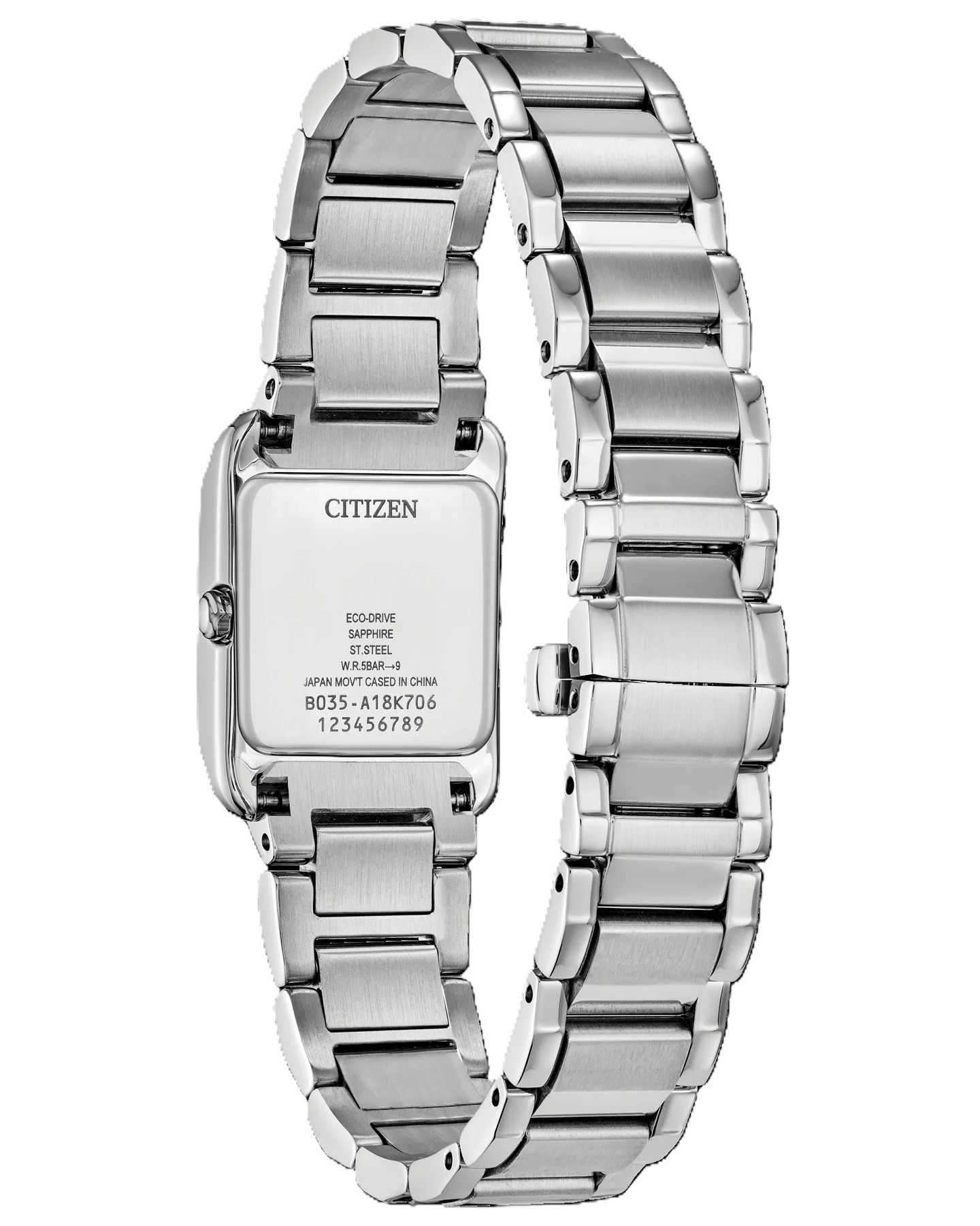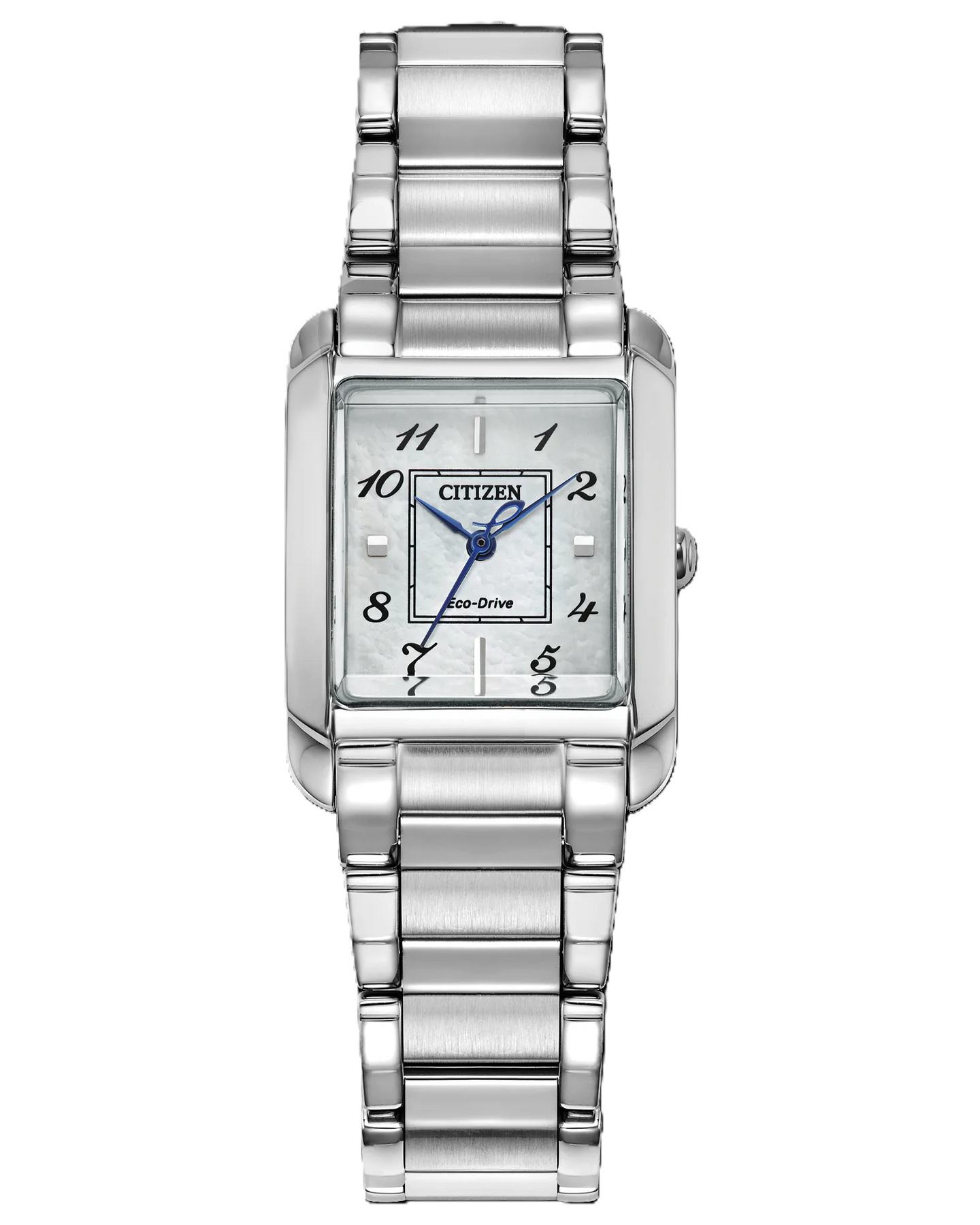 This Citizen L Bianca brings a refined Art Deco–inspired elegance to everyday wear. The 22mm stainless-steel case features a softly curved rectangular profile, paired with a matching bracelet for a seamless, polished look. A mother-of-pearl dial adds a luminous feminine touch, accented by delicate printed numerals and blue-tipped hands. Powered by Eco-Drive technology, it runs on any light source and never needs a battery.