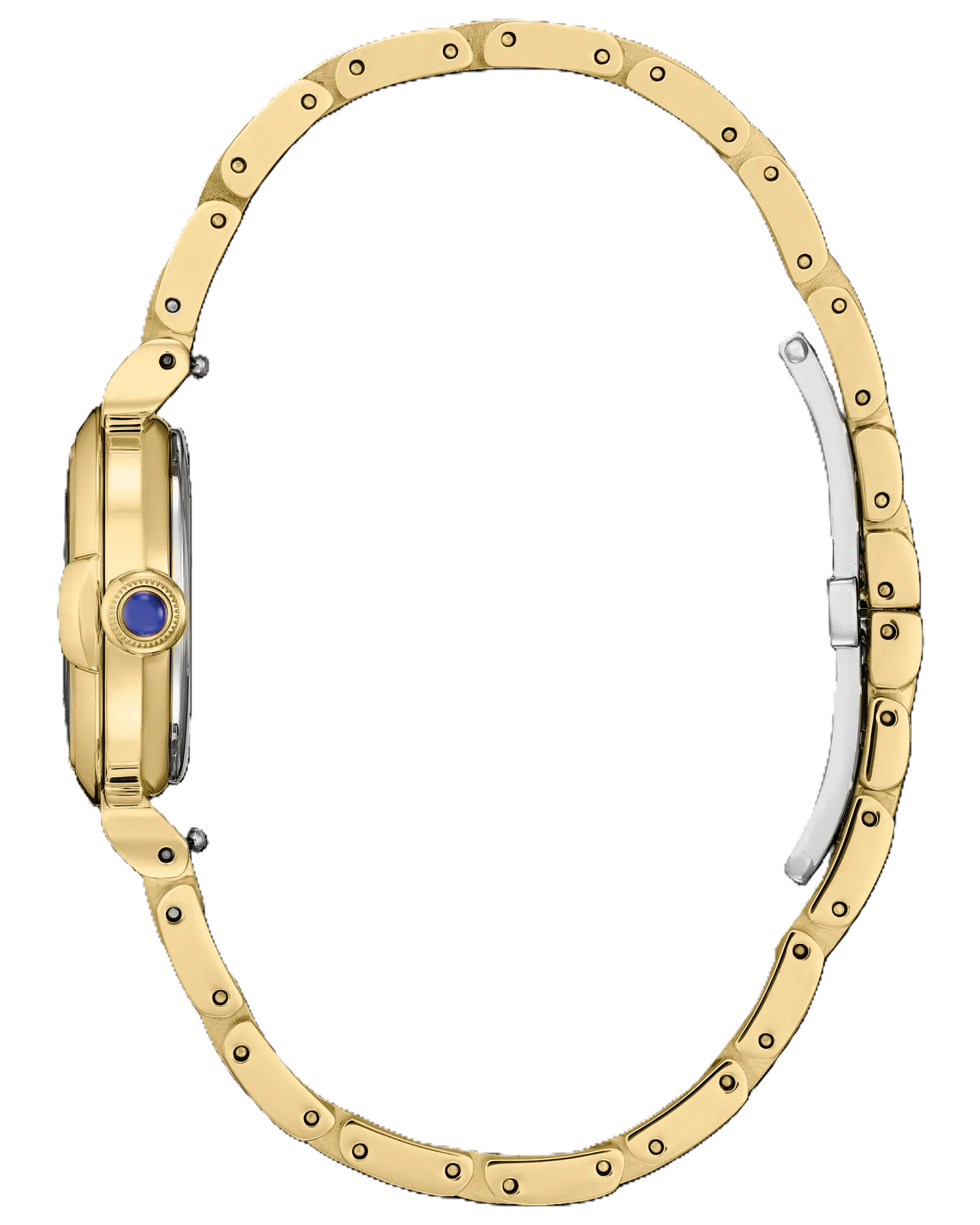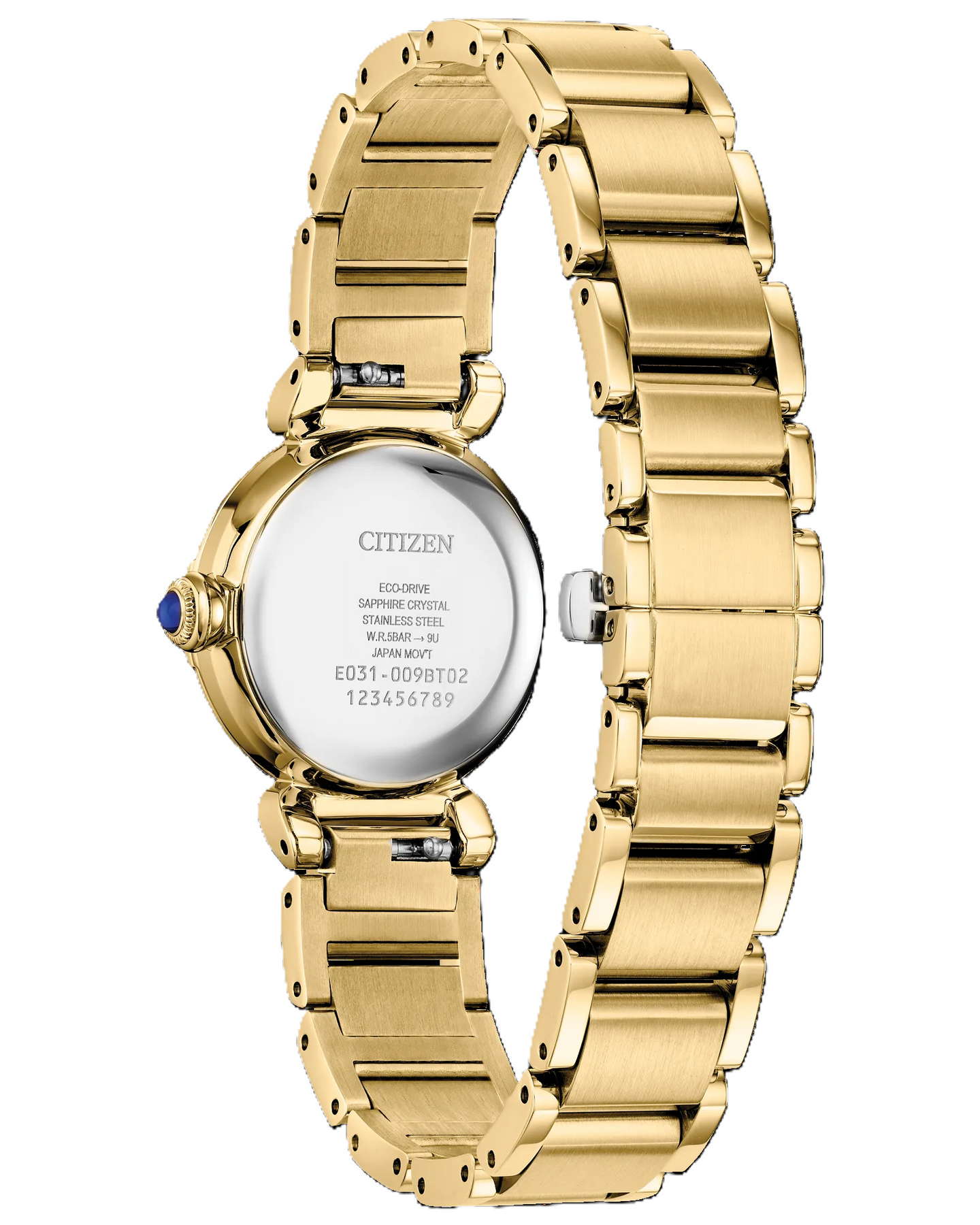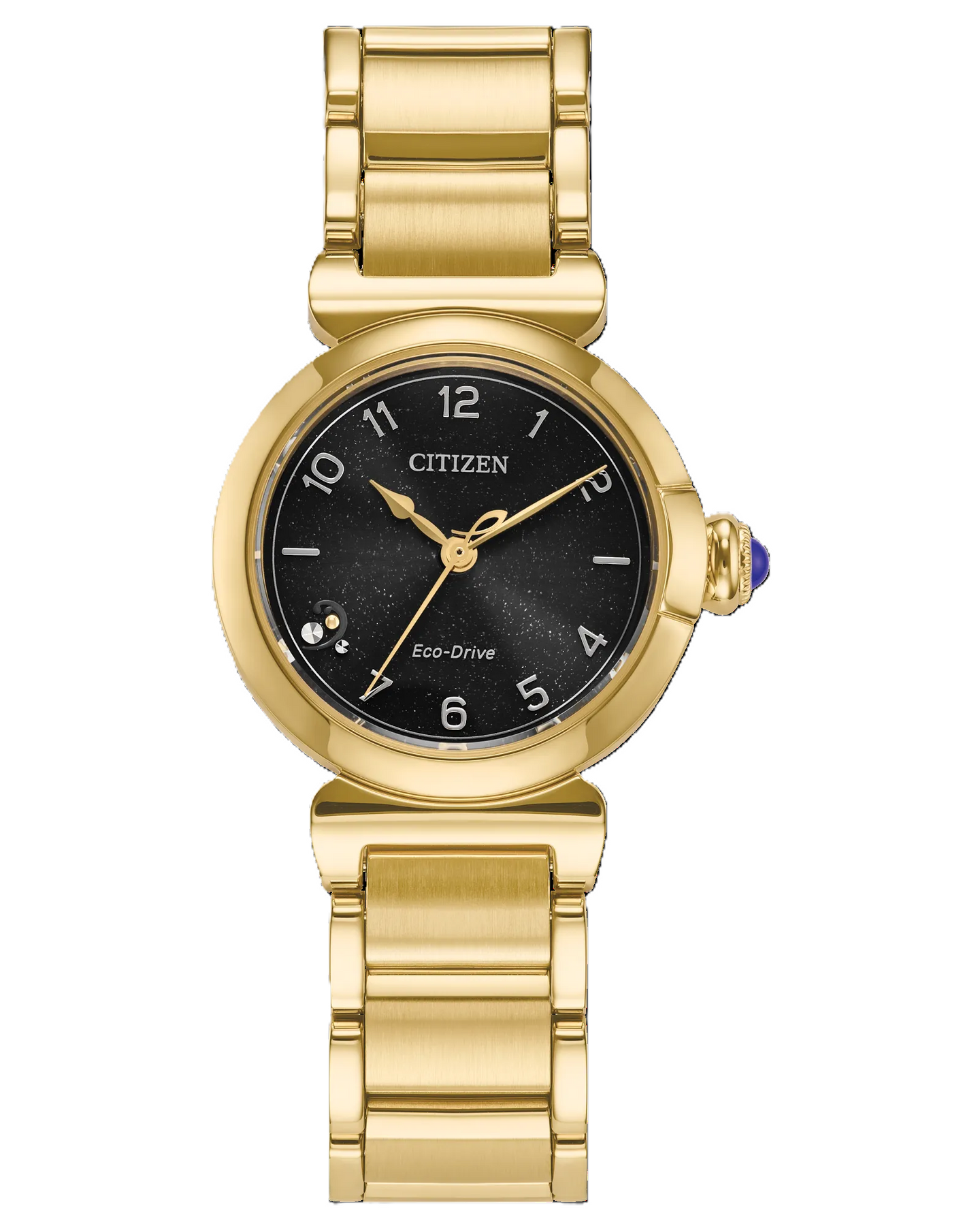A refined blend of romance and modern sustainability, the Citizen L Mae brings elegant charm to your wrist. Its 26mm gold-tone case draws inspiration from vintage perfume bottles, highlighted by a crown styled like a delicate glass stopper. A shimmering black dial adds a touch of drama, complete with a diamond accent at 8 o’clock and finished with a scratch-resistant sapphire crystal. Powered by Citizen’s Eco-Drive technology, it runs on any light—never needing a battery. The gold-tone stainless steel bracelet completes the look with timeless sophistication.