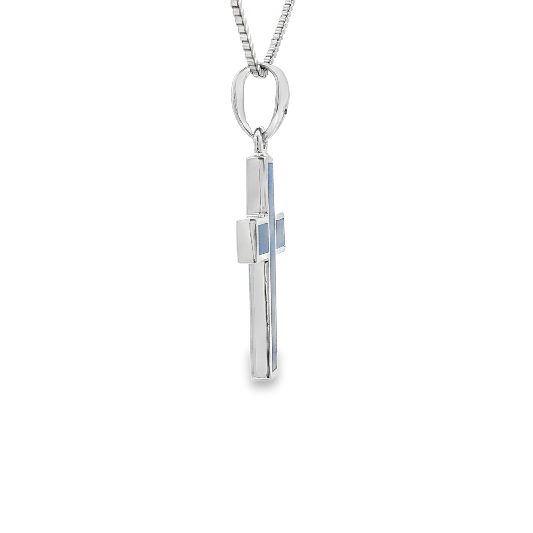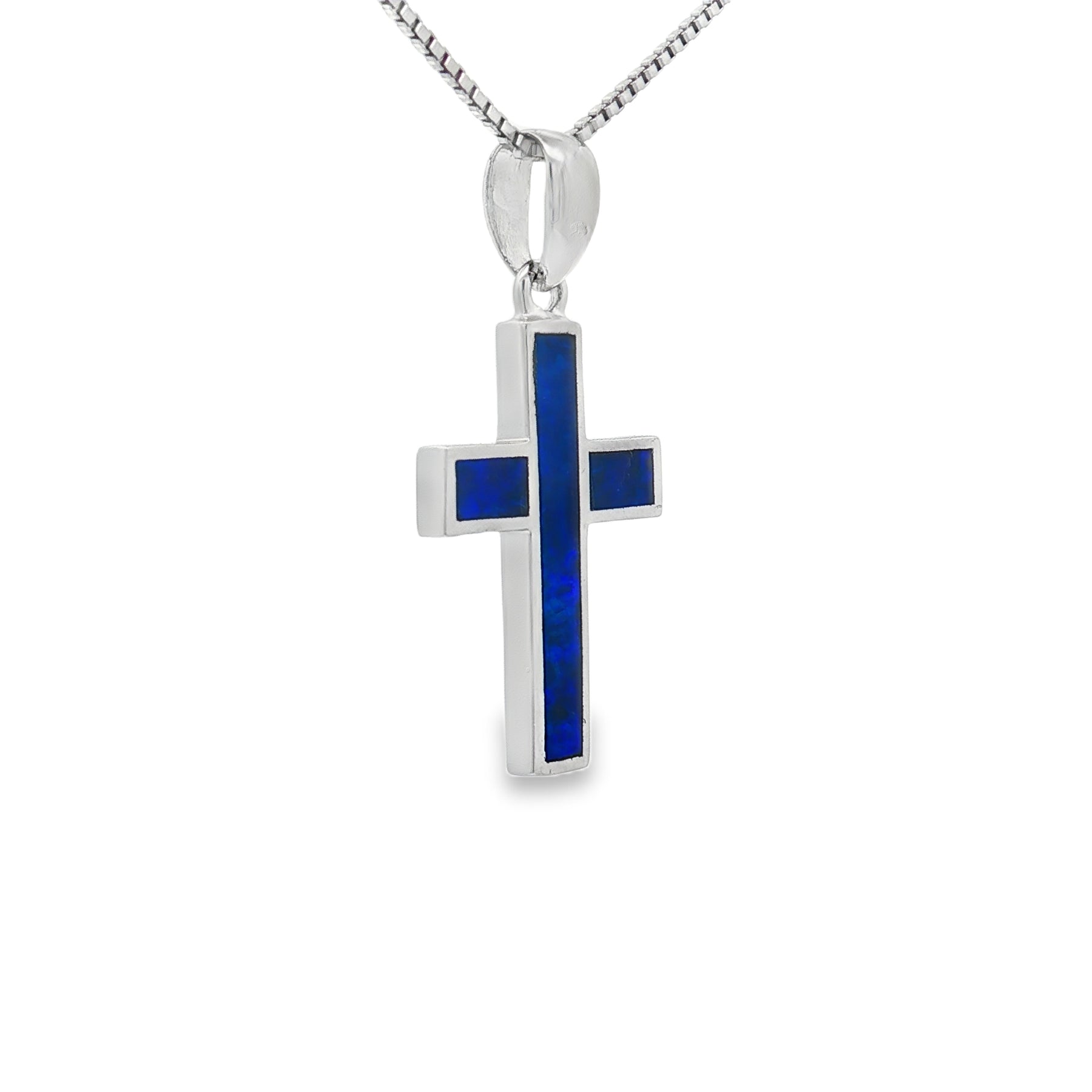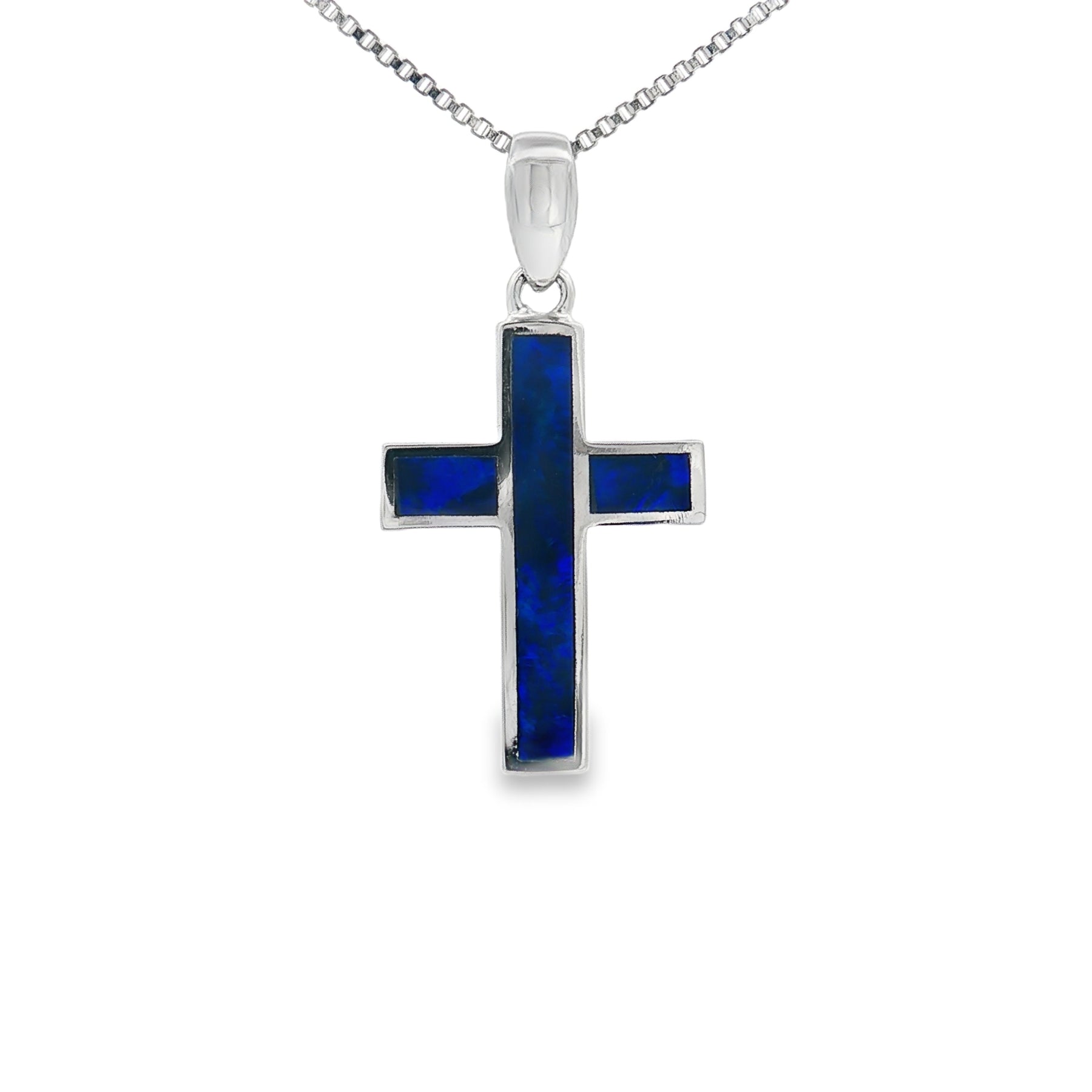 This sterling silver cross pendant radiates faith and beauty with a striking inlay of deep blue doublet opal. The gemstoneโs vibrant flashes of color bring life to the timeless cross design, making it both meaningful and eye-catching. Suspended from an 18" chain with a secure spring ring clasp, this pendant is crafted for everyday inspiration and lasting elegance.