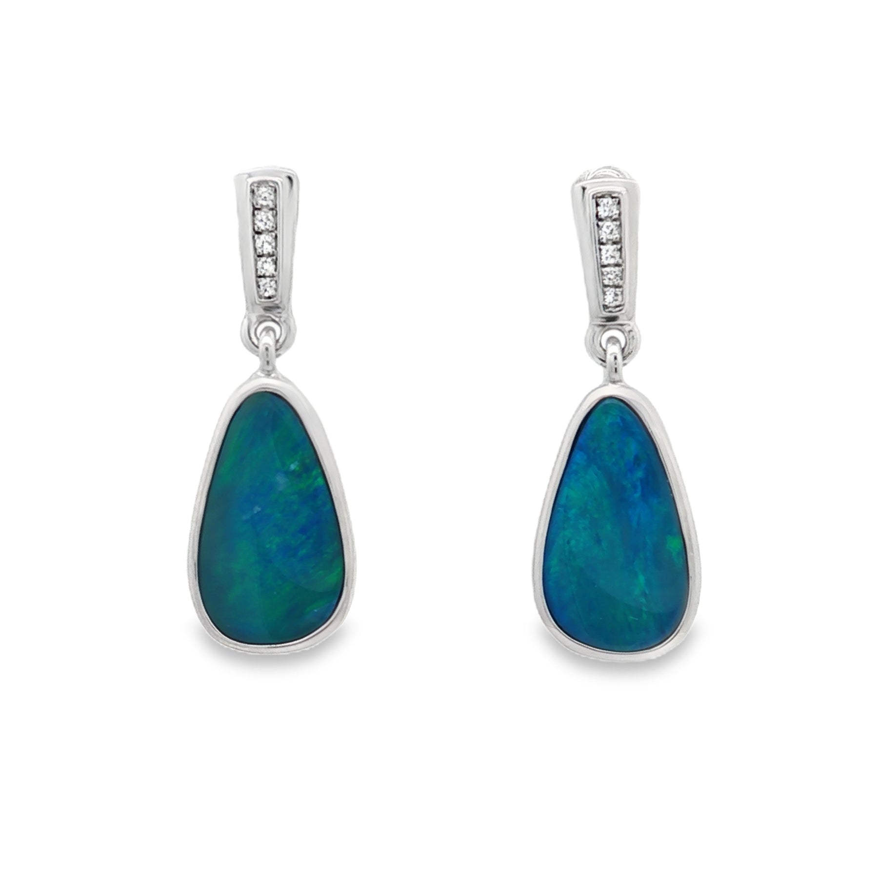 Shimmering with ocean-like blues and greens, these sterling silver earrings feature striking doublet opals accented by sparkling diamonds. The teardrop opals bring a natural vibrancy, while the diamond-set bails add just the right touch of brilliance. A modern yet timeless design, these earrings are perfect for everyday wear or special evenings. Details: šŸ’Ž Gemstones: Doublet opals with vibrant play-of-color ✨ Accents: Sparkling round diamonds set into the bail 🌟 Metal: Sterling silver šŸŽØ Colors: Blue-green opals contrasted with white diamonds šŸŽ A perfect balance of bold color and refined elegance