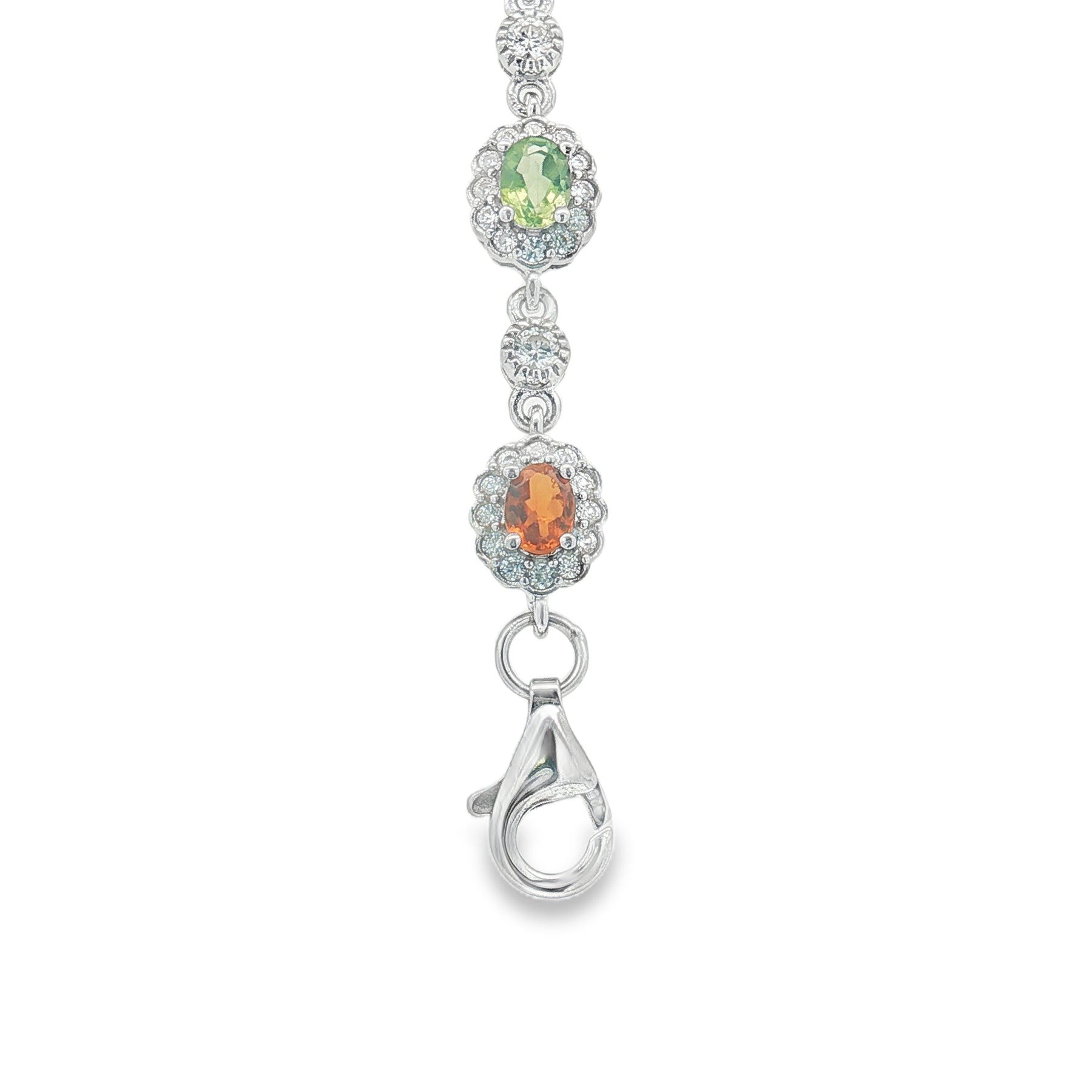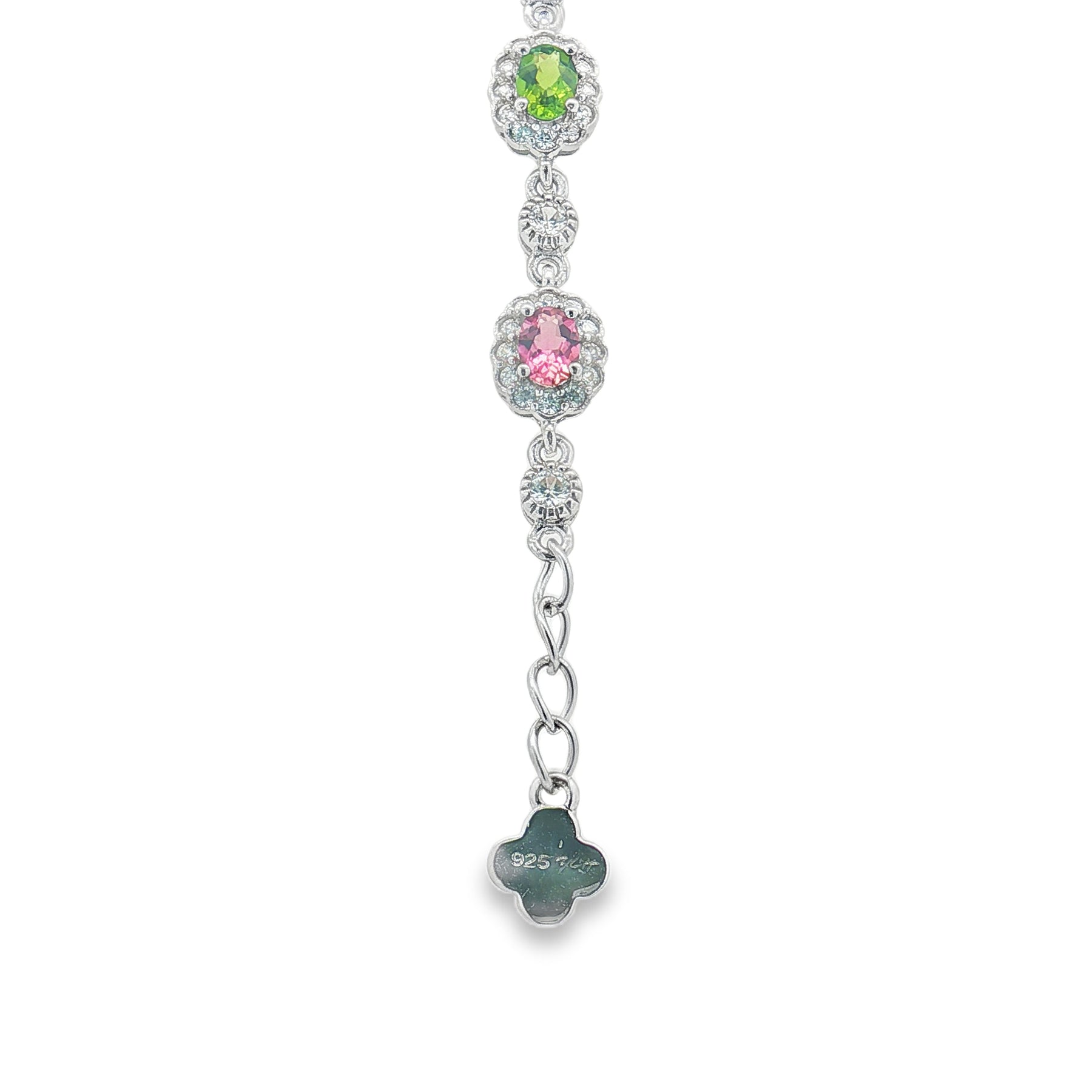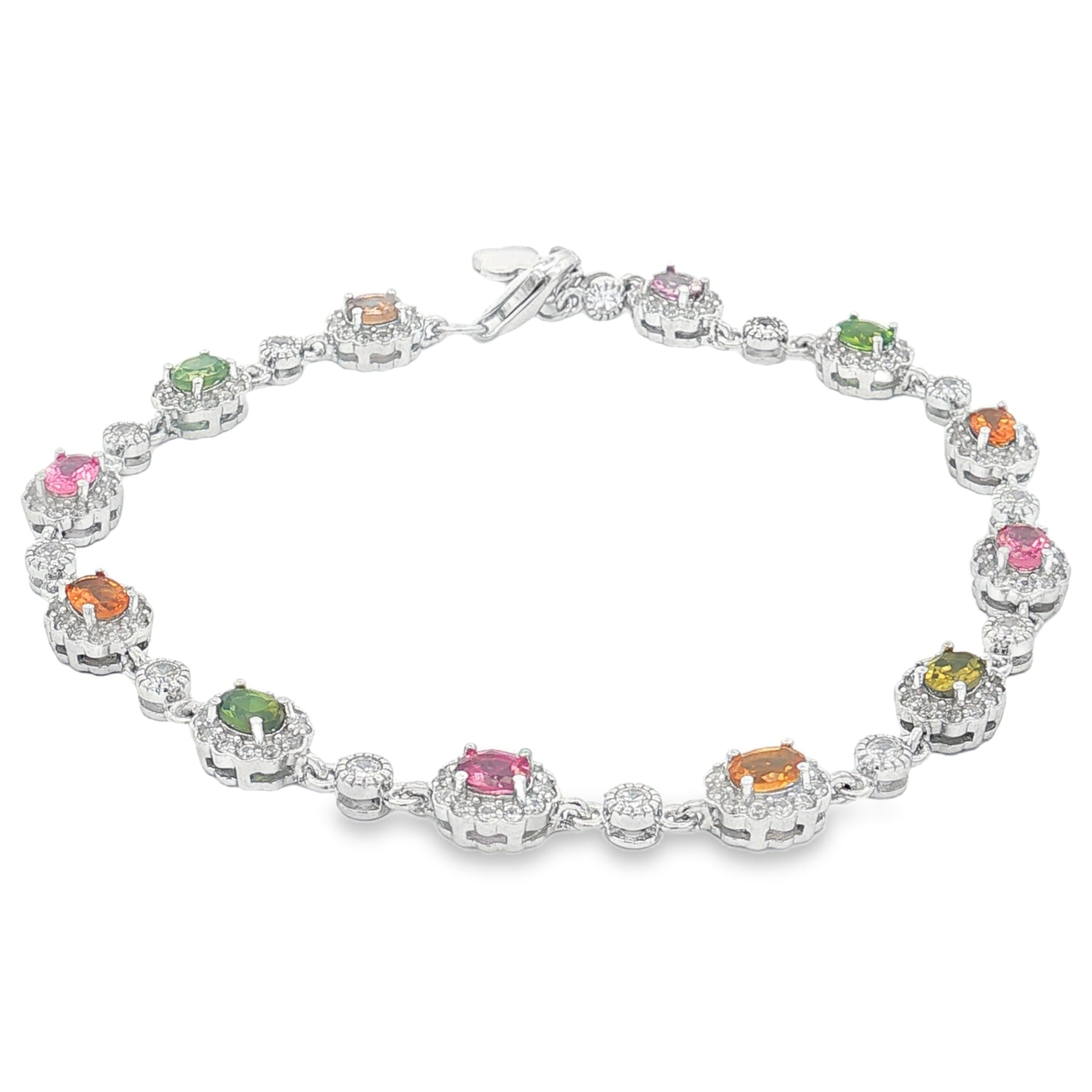 This 7.25" sterling silver bracelet brings a vibrant mix of multicolor tourmaline stones, each accented by sparkling CZ halos for a bright, full-spectrum look. The polished silver setting adds sleek contrast, making every shade pop beautifully. Finished with a secure lobster clasp, it's a colorful, elegant addition to any jewelry collection.