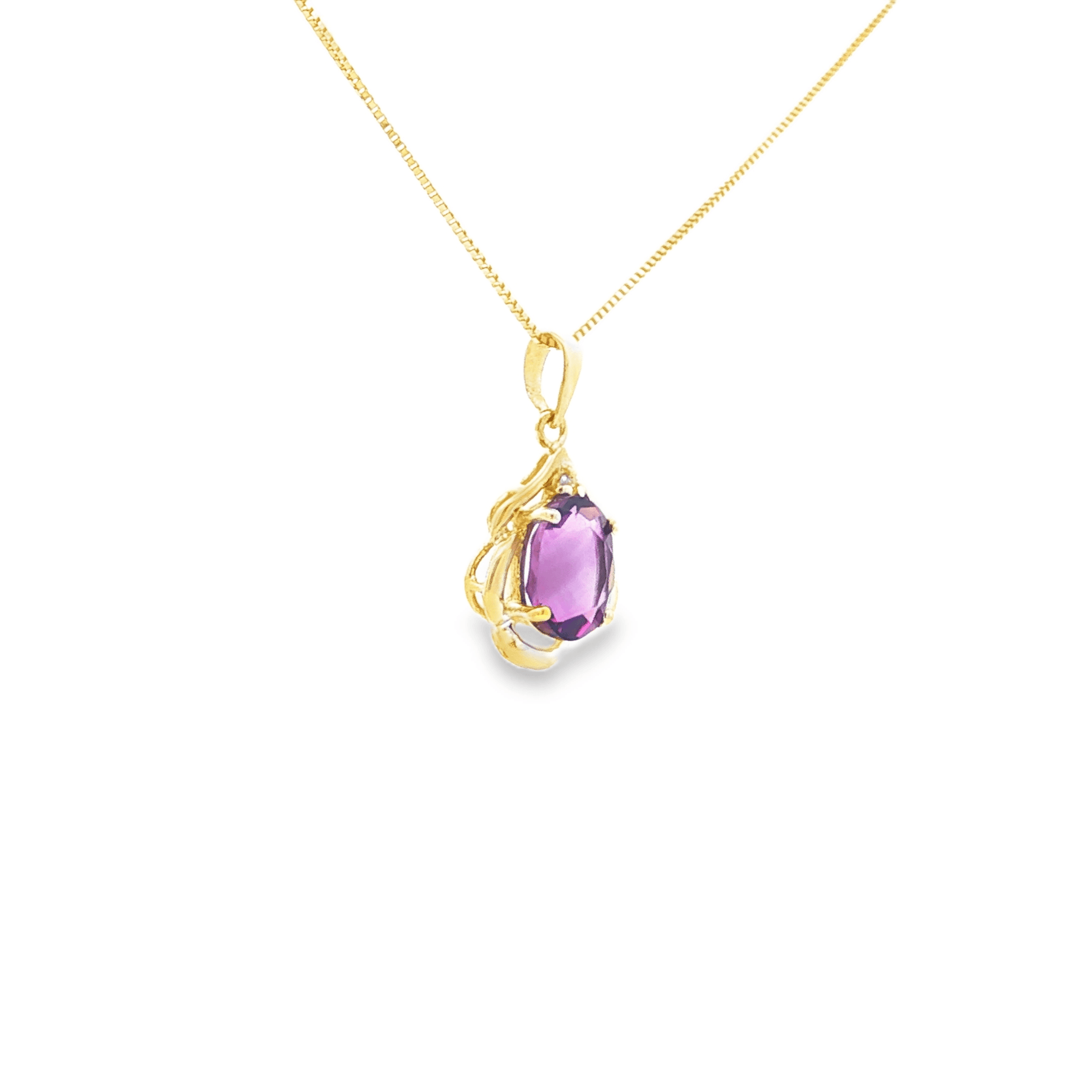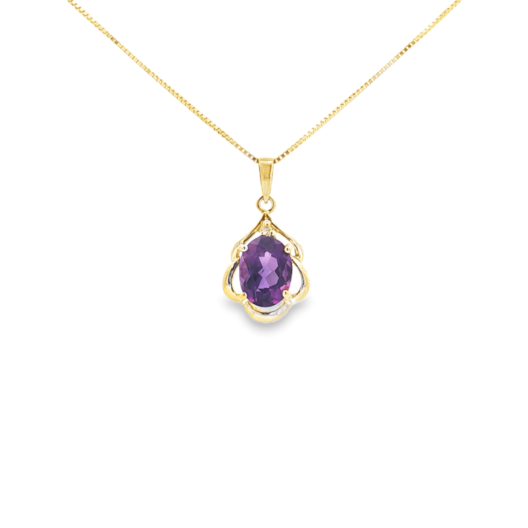 Vibrant and elegant, this 14K yellow gold necklace features a 1ct oval-cut amethyst accented by a sparkling .01ct diamond. The pendant is artfully designed with a scalloped gold frame that highlights the rich purple hue of the amethyst, suspended from an 18" chain with a spring ring clasp. A timeless design perfect for gifting or adding a touch of color to your own collection. ✨ As the February birthstone, amethyst is celebrated for symbolizing clarity, peace, and balance. Details: 💎 1ct total amethyst (oval cut) 💎 .01ct total diamond (accent) 🪙 14K yellow gold scalloped setting 📏 18" chain with spring ring clasp 🌟 Elegant design with colorful brilliance Use our web chat or text us at 937-898-8670 for sizing options.