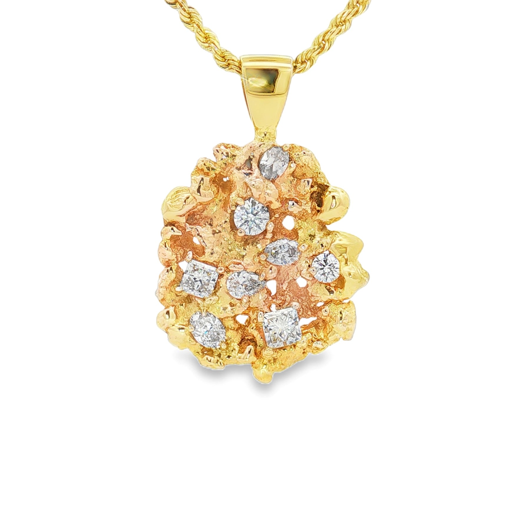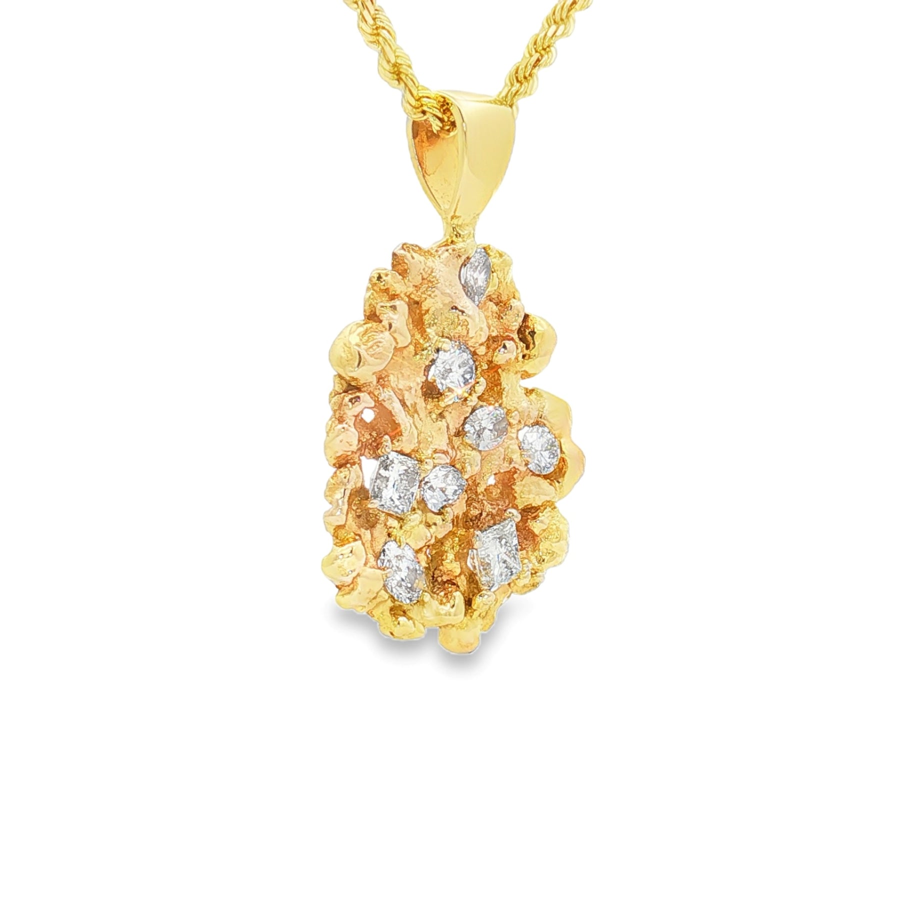 This bold 14k yellow gold nugget necklace makes a statement with its unique texture and radiant sparkle. Set within the nugget design are eight lab grown diamonds of various shapes totaling 3.13ct, creating a one-of-a-kind brilliance. The pendant is paired with a sturdy 3mm, 20" rope chain, perfectly complementing the rugged yet luxurious design.