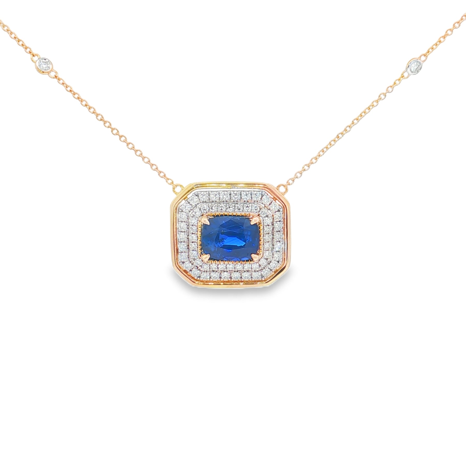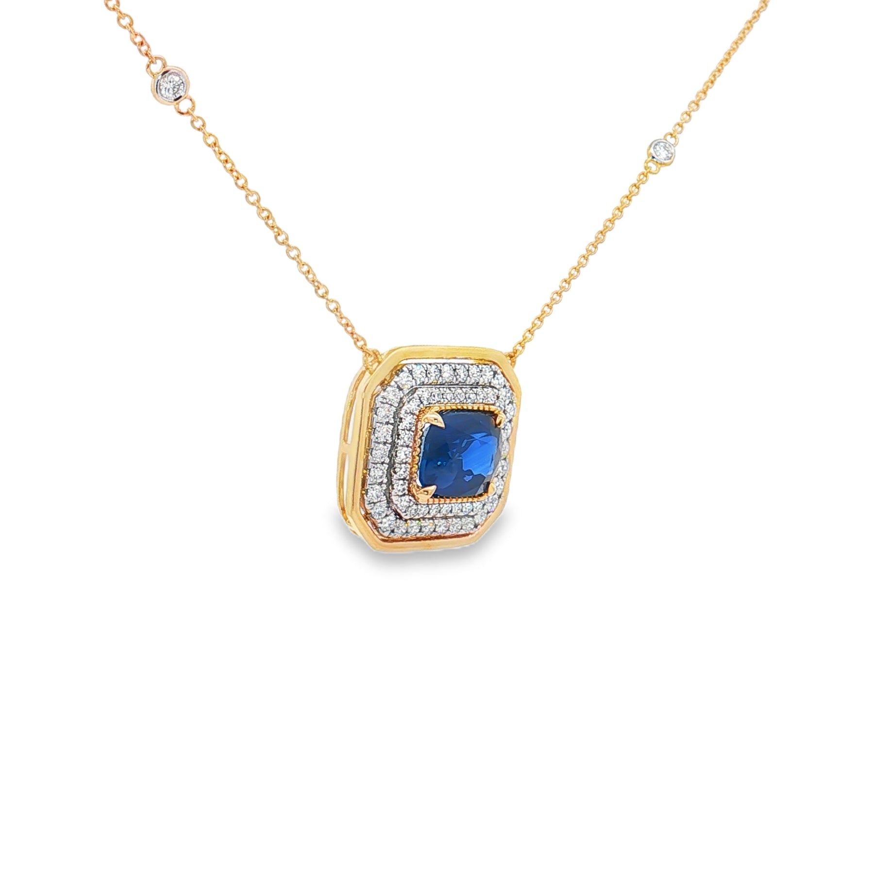 This luxurious 18" necklace is crafted in 14k yellow and white gold, set with a striking 3.28ct deep blue sapphire at its center. The sapphire is framed by 0.62ct of natural diamonds, adding radiant brilliance to the design. Completed with a secure lobster clasp, this necklace blends bold color with timeless sparkle, perfect for elegant occasions.