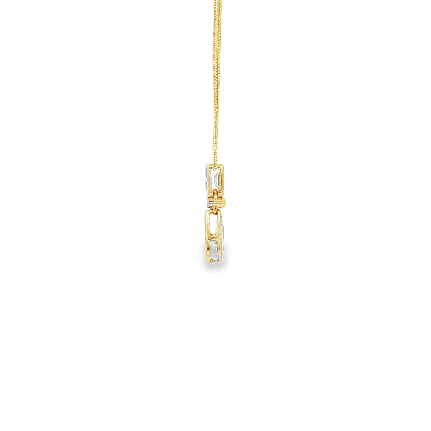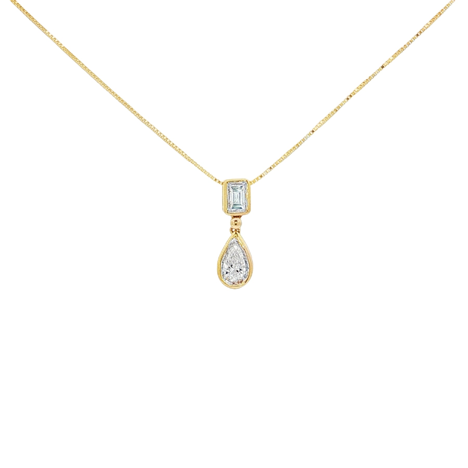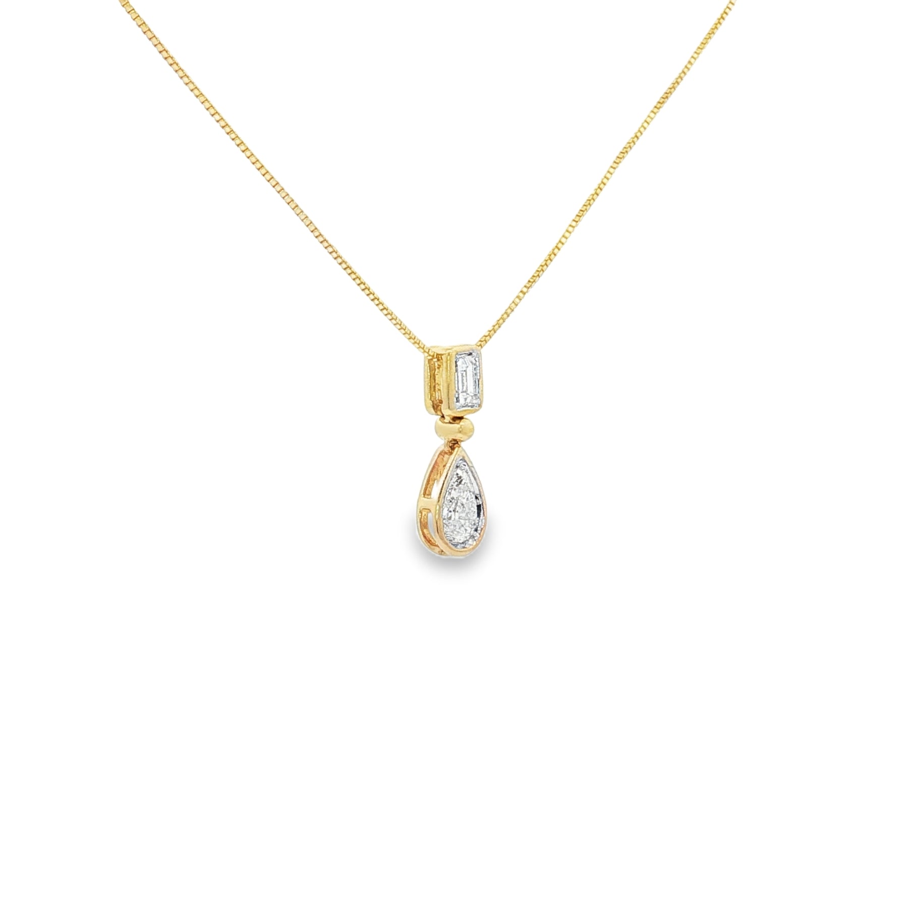 A graceful touch of elegance, this 14K yellow gold diamond pendant is designed to shine with timeless sophistication. The pendant showcases a .45ct total weight in diamonds ā featuring a brilliant baguette cut at the top and a pear cut diamond below, both bezel set for a modern yet classic appeal. Suspended from an 18" chain with a secure spring ring clasp, this piece is perfect for everyday wear or a refined evening look.