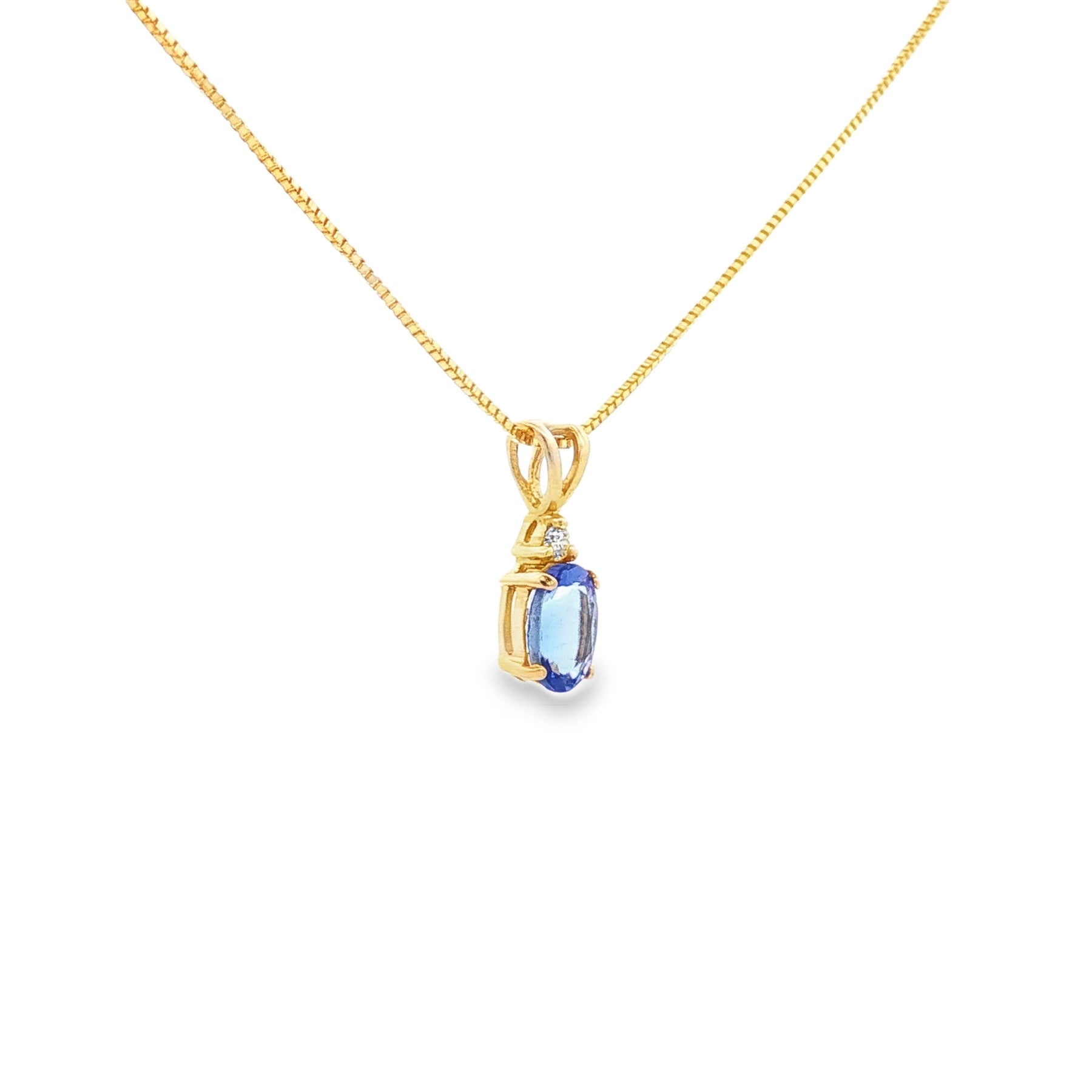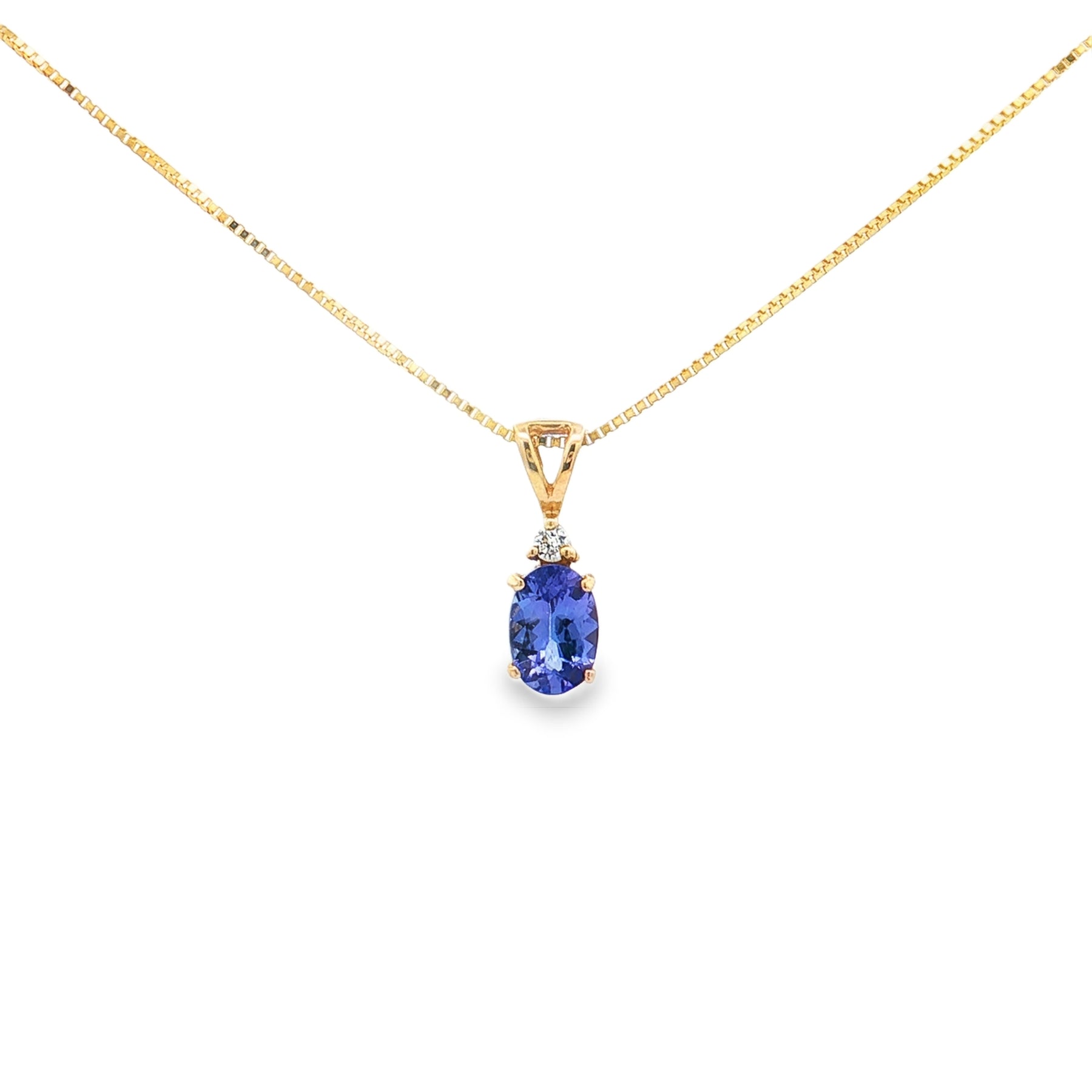 This pendant captures elegance with the vivid blue-violet hue of tanzanite. Set in 14K yellow gold, a .57ct total oval-cut tanzanite is accented by a sparkling .02ct total diamond, adding brilliance and charm to the design. The pendant is suspended from an 18" chain with a spring ring clasp, making it perfect for everyday wear or special occasions.