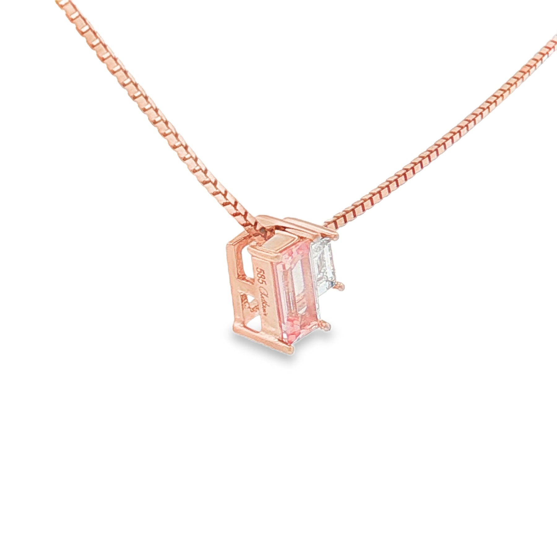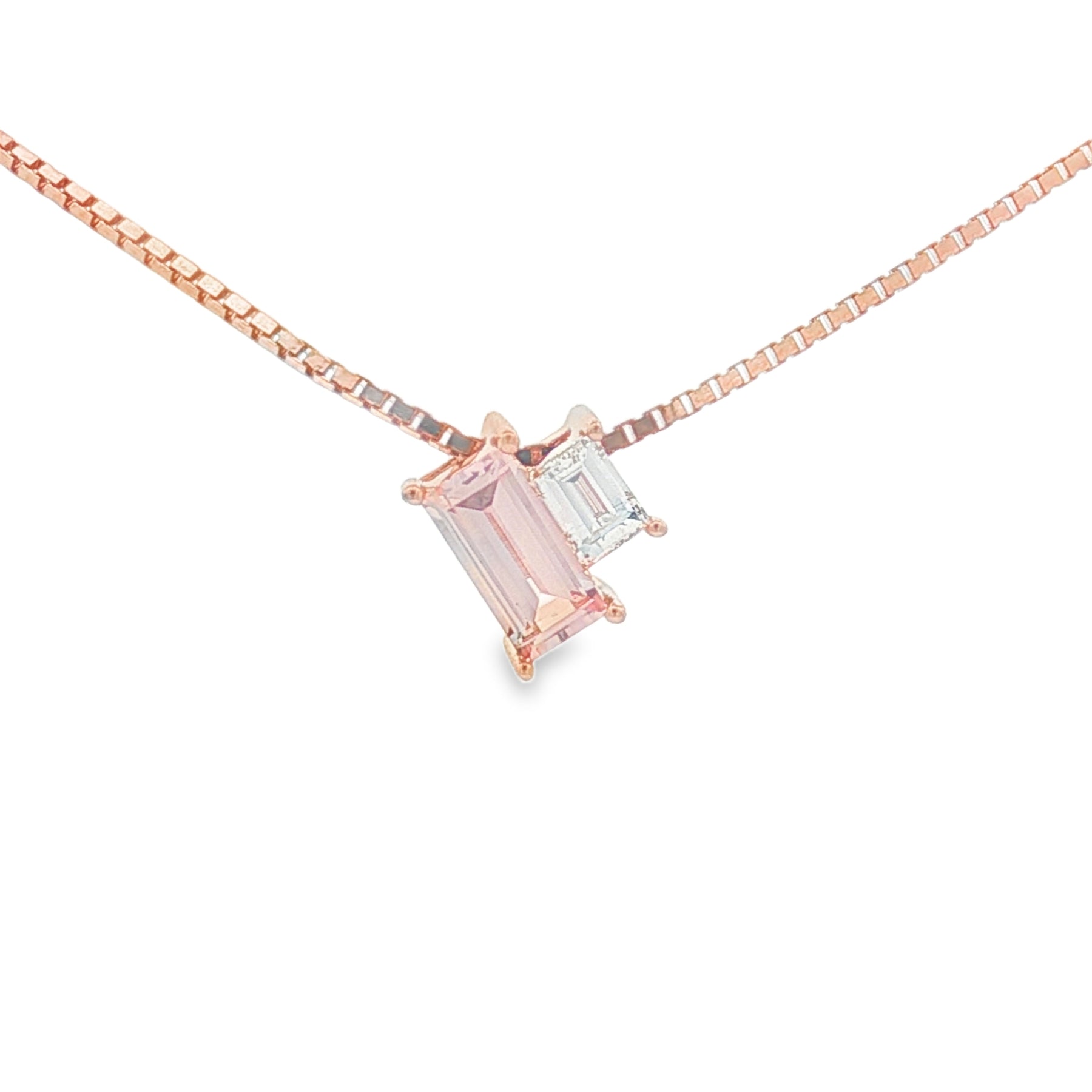 Crafted in warm 14K rose gold, this modern pendant showcases a .48ct lab-grown champagne sapphire paired with a crisp .14ct lab-grown diamond. The offset emerald-cut stones create a clean, contemporary silhouette that feels both elegant and effortlessly stylish. Suspended from an 18" chain with a secure lobster clasp, itβs a striking piece designed for everyday luxury.
