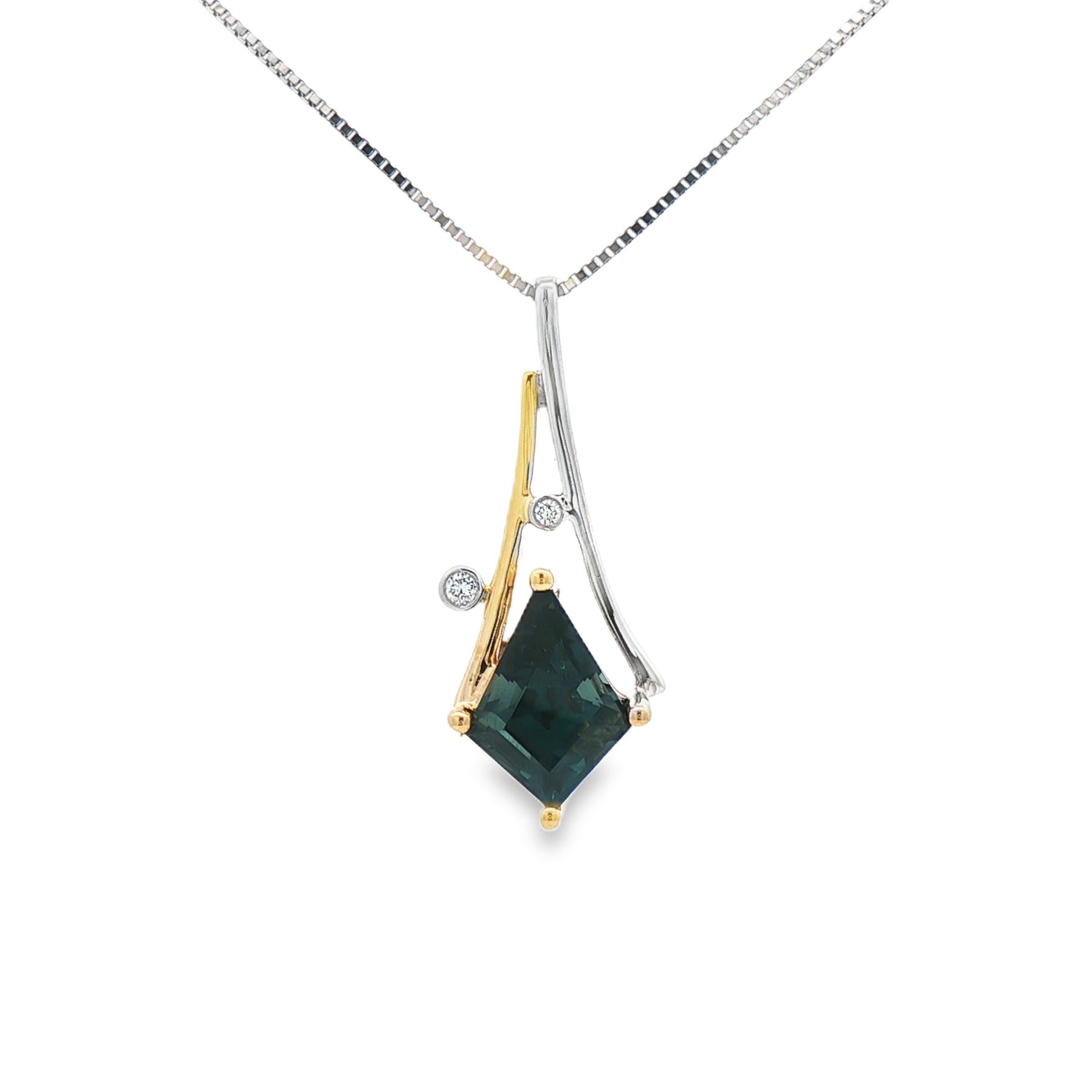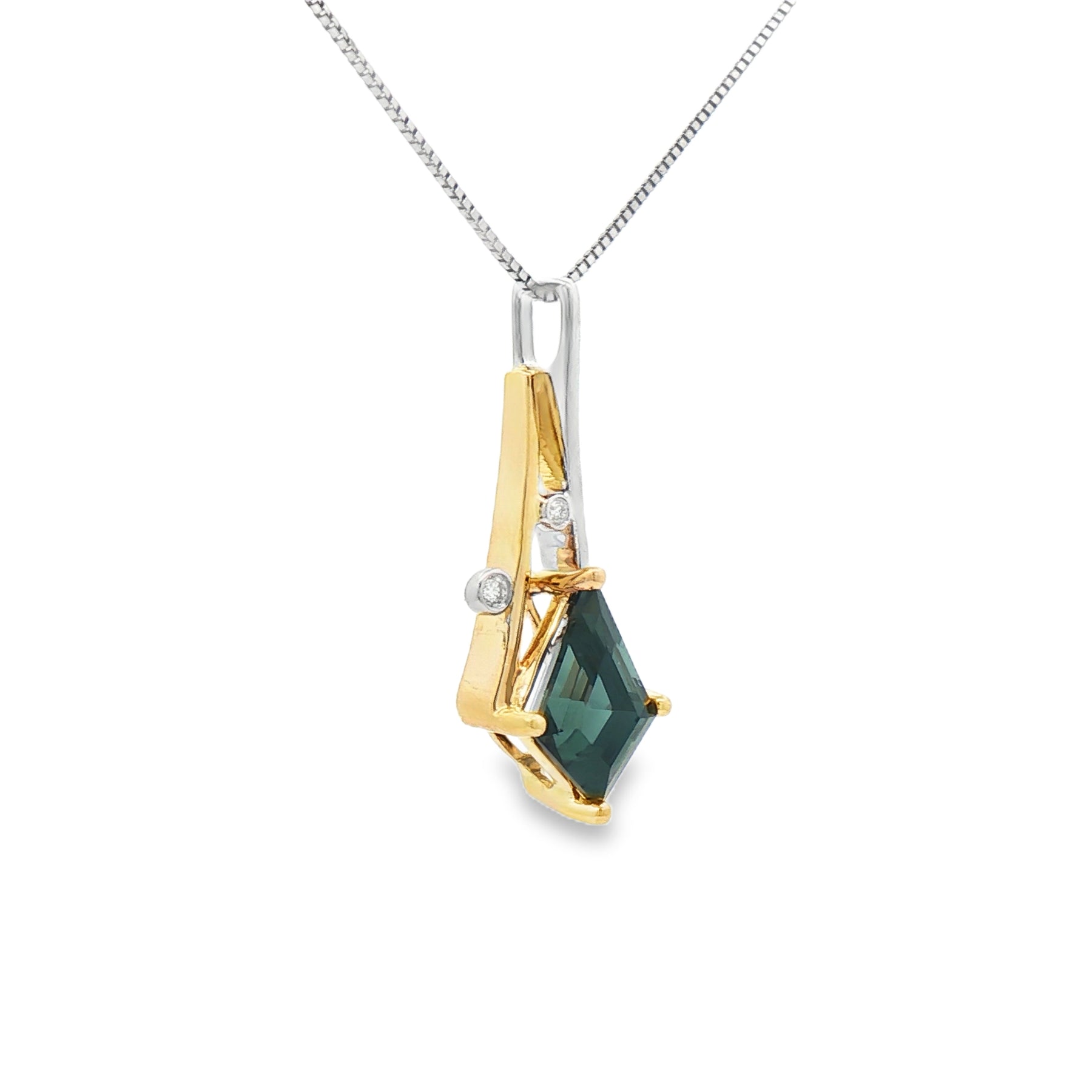 Crafted in 14K yellow and white gold, this pendant features a richly colored 1.5 carat garnet accented by .02 carats total weight of diamonds. The two-tone setting creates a graceful, modern silhouette, while the deep green garnet adds bold elegance. Suspended from an 18" box chain with a secure spring ring clasp.