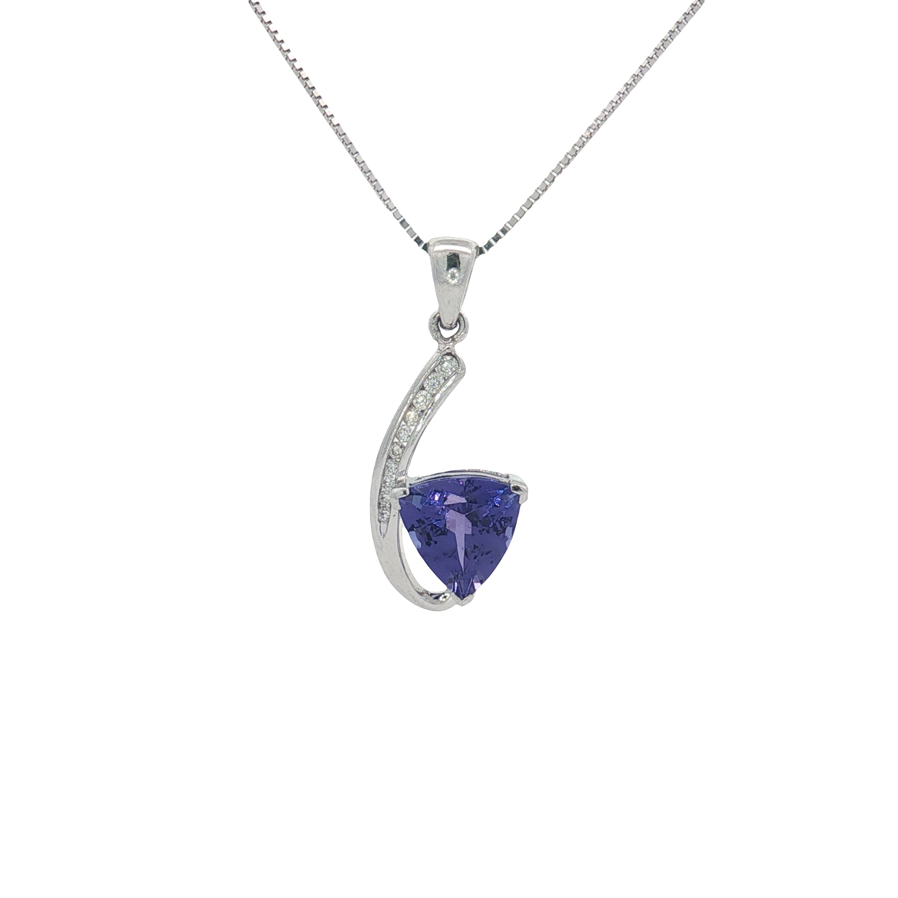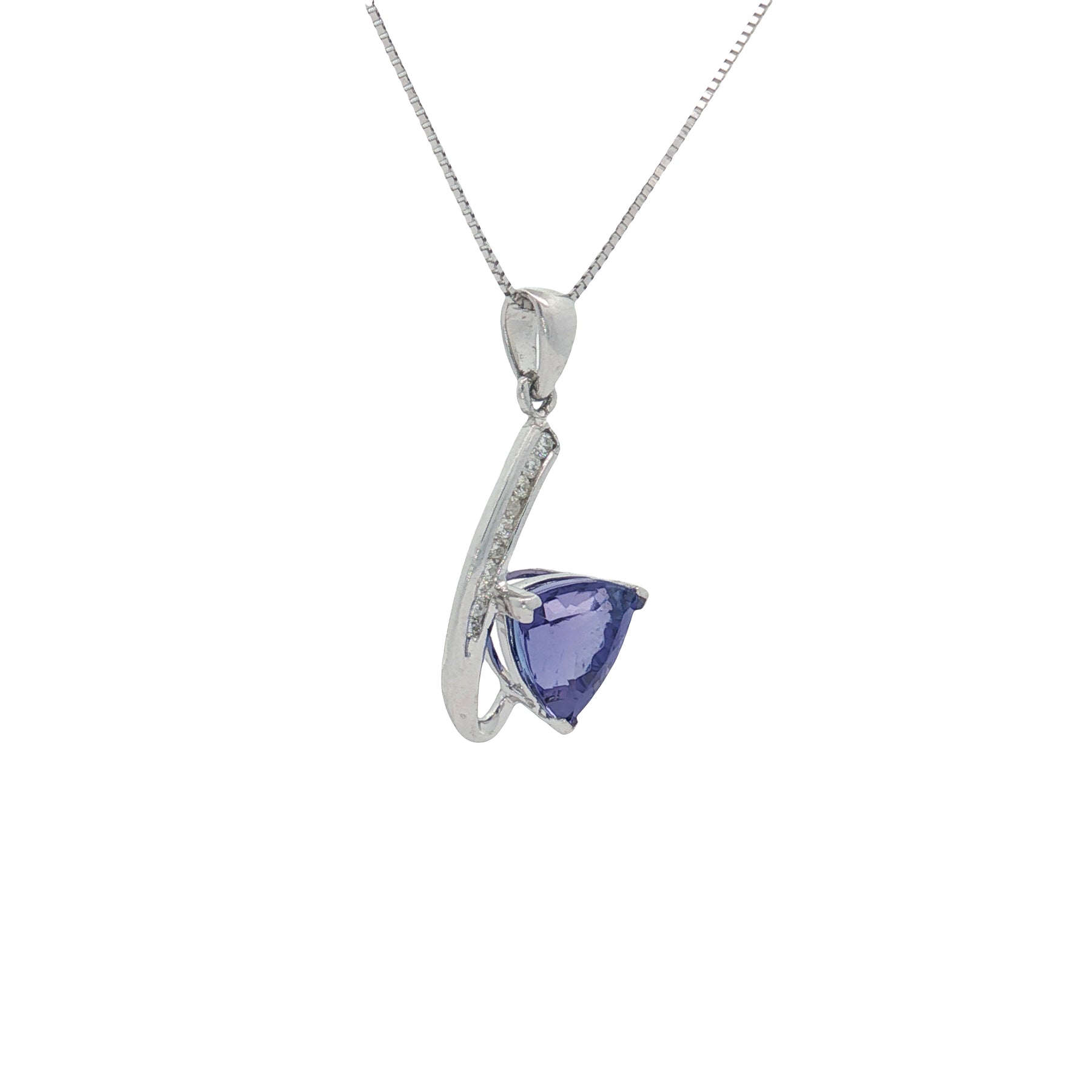 Crafted in elegant 14k white gold, this pendant features a striking 1.4ct trillion-cut tanzanite, glowing with rich violet-blue tones. A delicate sweep of diamonds totaling 0.05ct accents the design, adding sparkle and sophistication. The pendant is suspended from an 18" chain with a secure spring ring clasp. ✨ Details: šŸ’Ž Gemstone: 1.4ct trillion-cut tanzanite šŸ’Ž Diamonds: 0.05ct total weight šŸŖ™ Metal: 14k white gold šŸ“ Chain Length: 18" šŸ”’ Clasp: Spring ring clasp