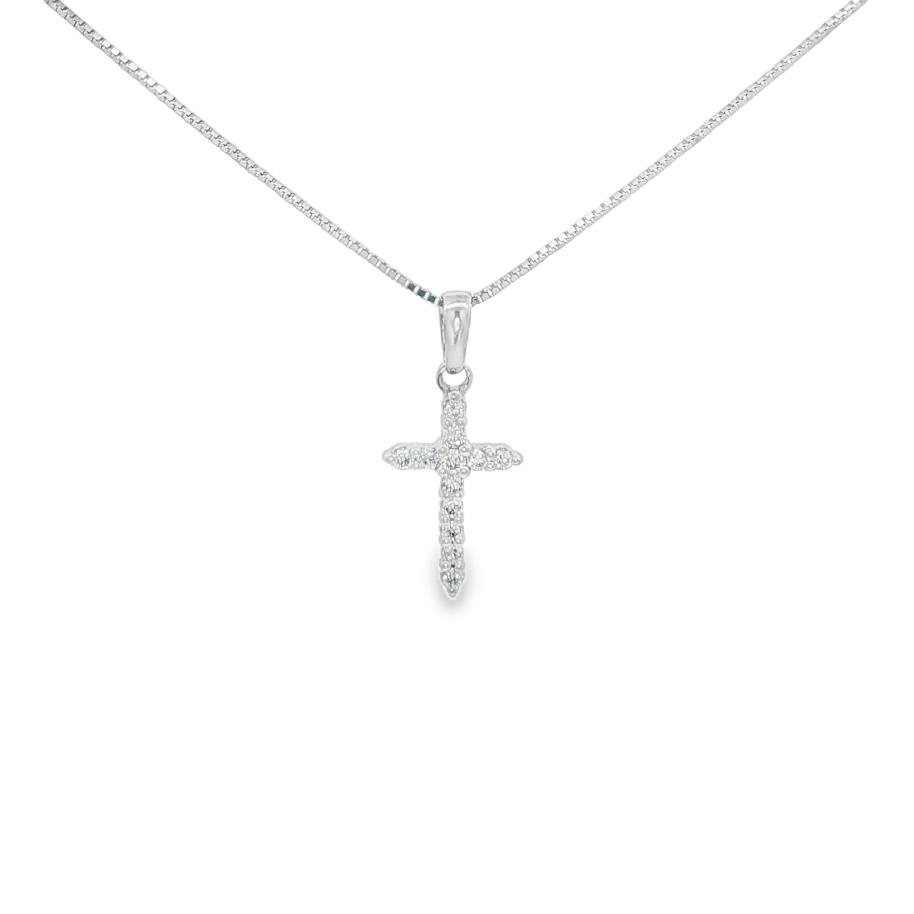 A meaningful cross with timeless sparkle. Crafted in 14K white gold, this petite cross pendant features .11ct total weight of round brilliant-cut lab-grown diamonds in F color and SI clarity. Suspended from an 18-inch baby rope chain with a spring ring clasp, itβs a refined expression of faith and style.
