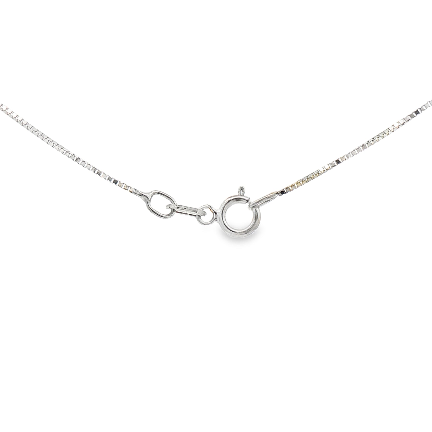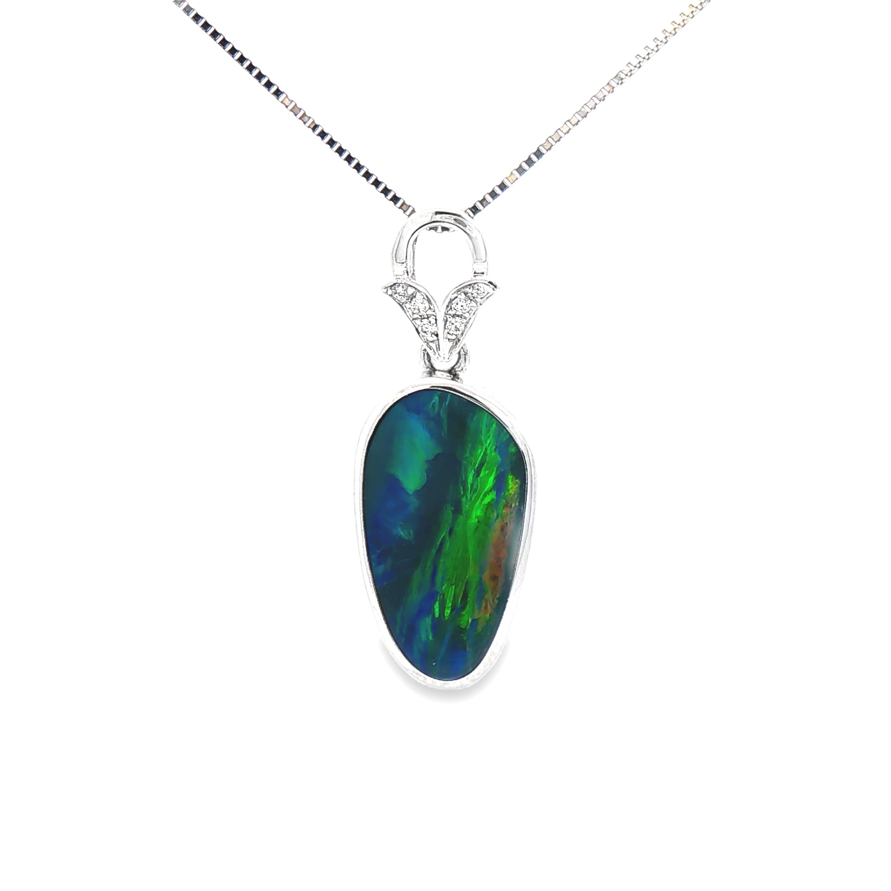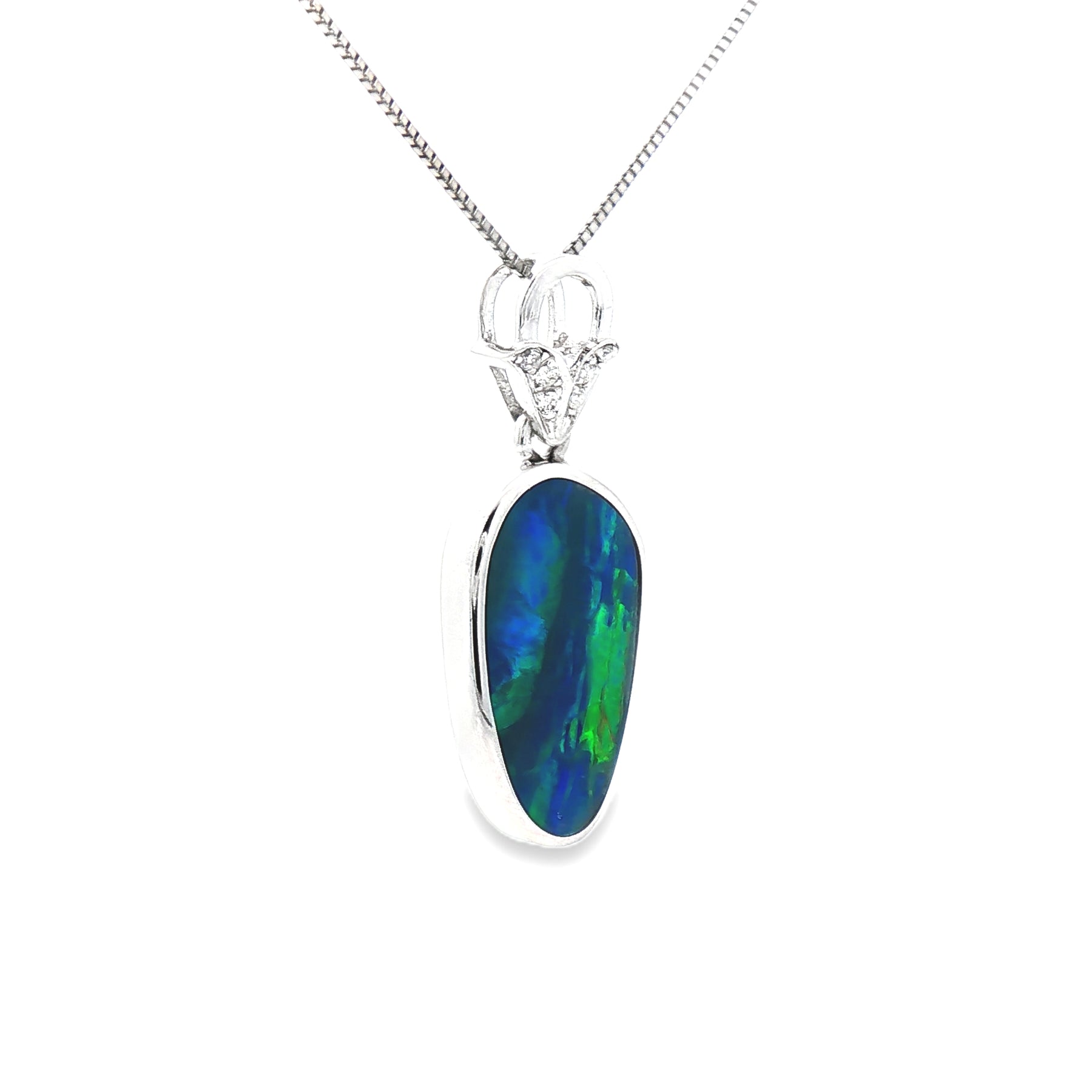 This 14K white gold necklace features a 2.45ct free-form doublet opal with vibrant green and blue flashes, accented by .025ct total diamonds in the bail and suspended from an 18" box chain for refined, colorful brilliance.