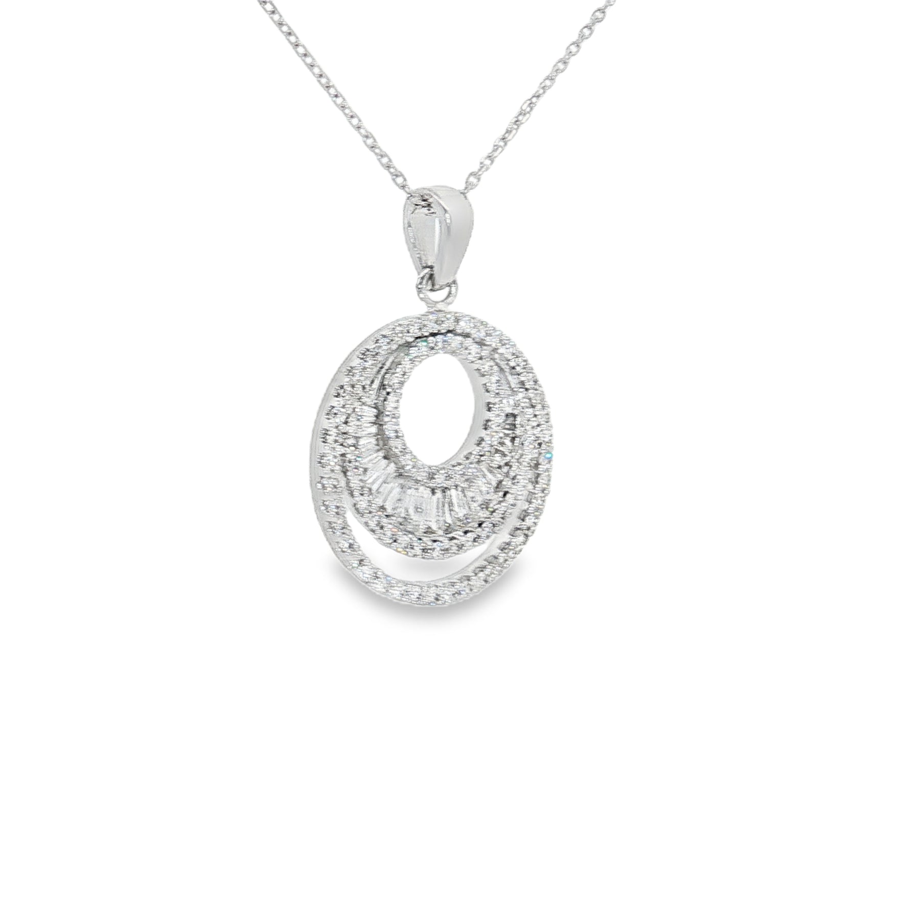 Crafted in 14K white gold, this radiant necklace showcases a stunning circle pendant, adorned with .8 carats of diamonds for exceptional sparkle. Designed with baguette and round cut diamonds, the layered design creates a luxurious statement piece. Comes on an 18-inch chain with a secure lobster clasp.