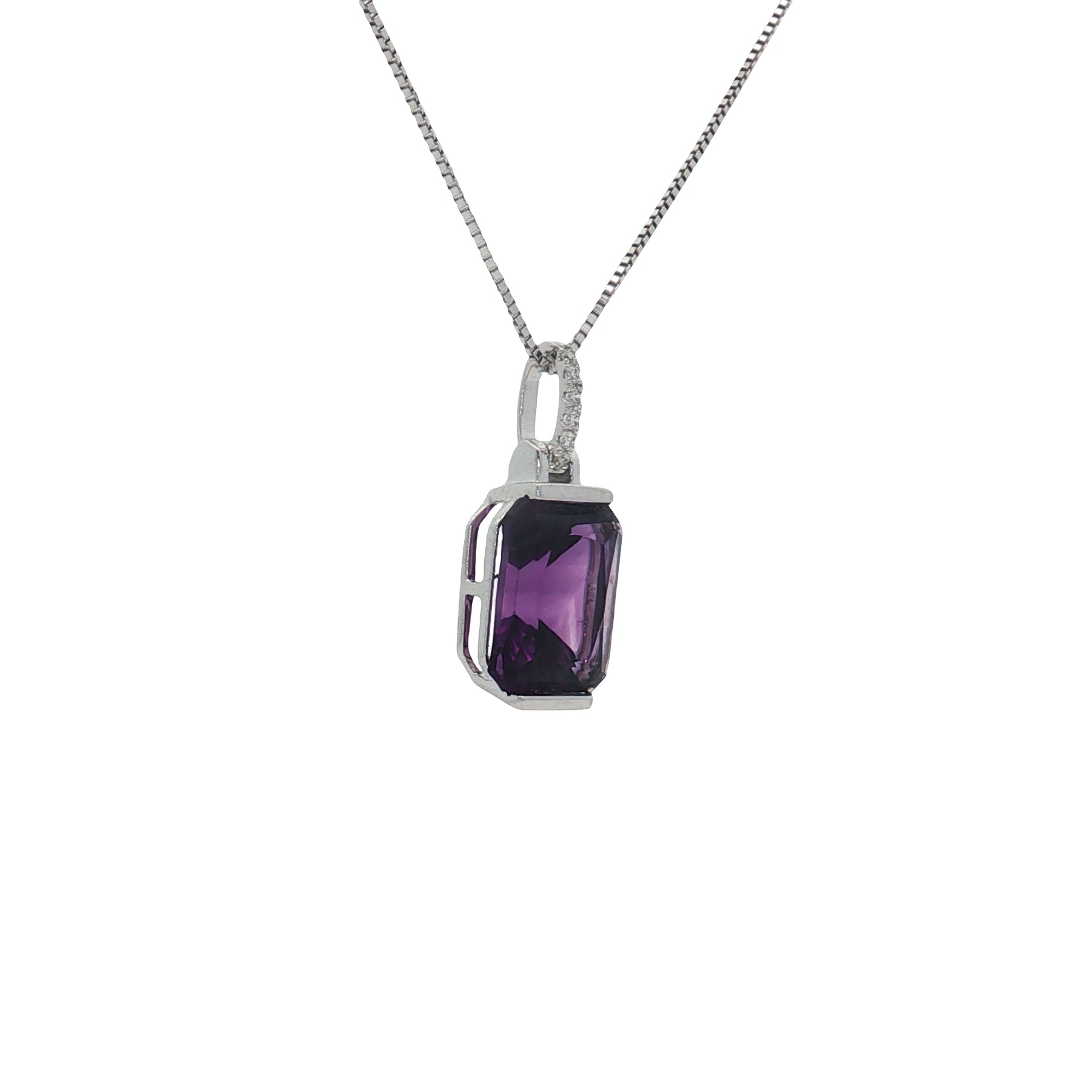 Crafted in luminous 14K white gold, this pendant showcases a 1.7ct emerald-cut amethyst, exuding rich purple hues and captivating sparkle. The pendant is accented with 0.03ct of shimmering diamonds on the bail, adding a touch of elegance. Suspended from an 18" box chain with a secure spring ring clasp, this piece is a timeless statement of sophistication.