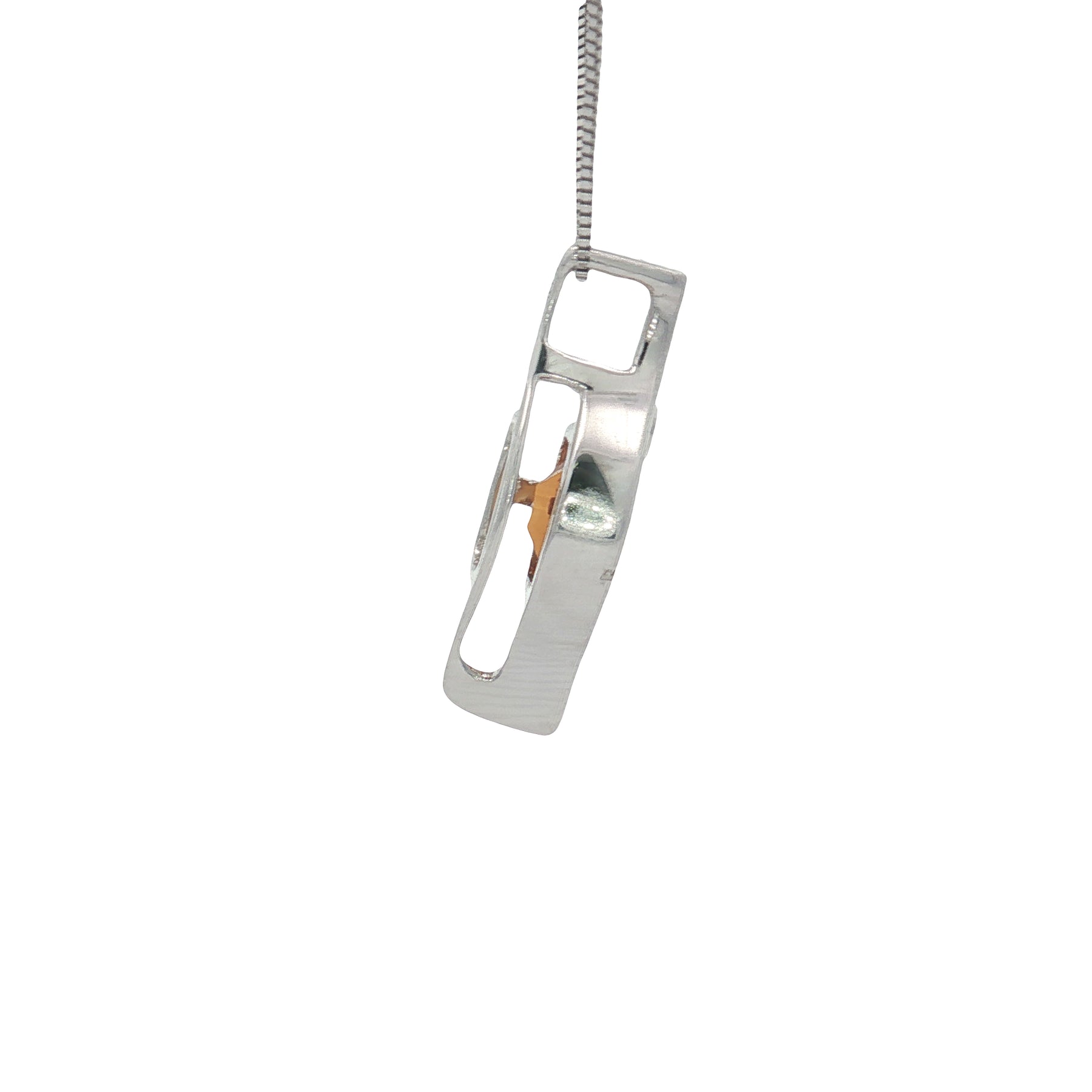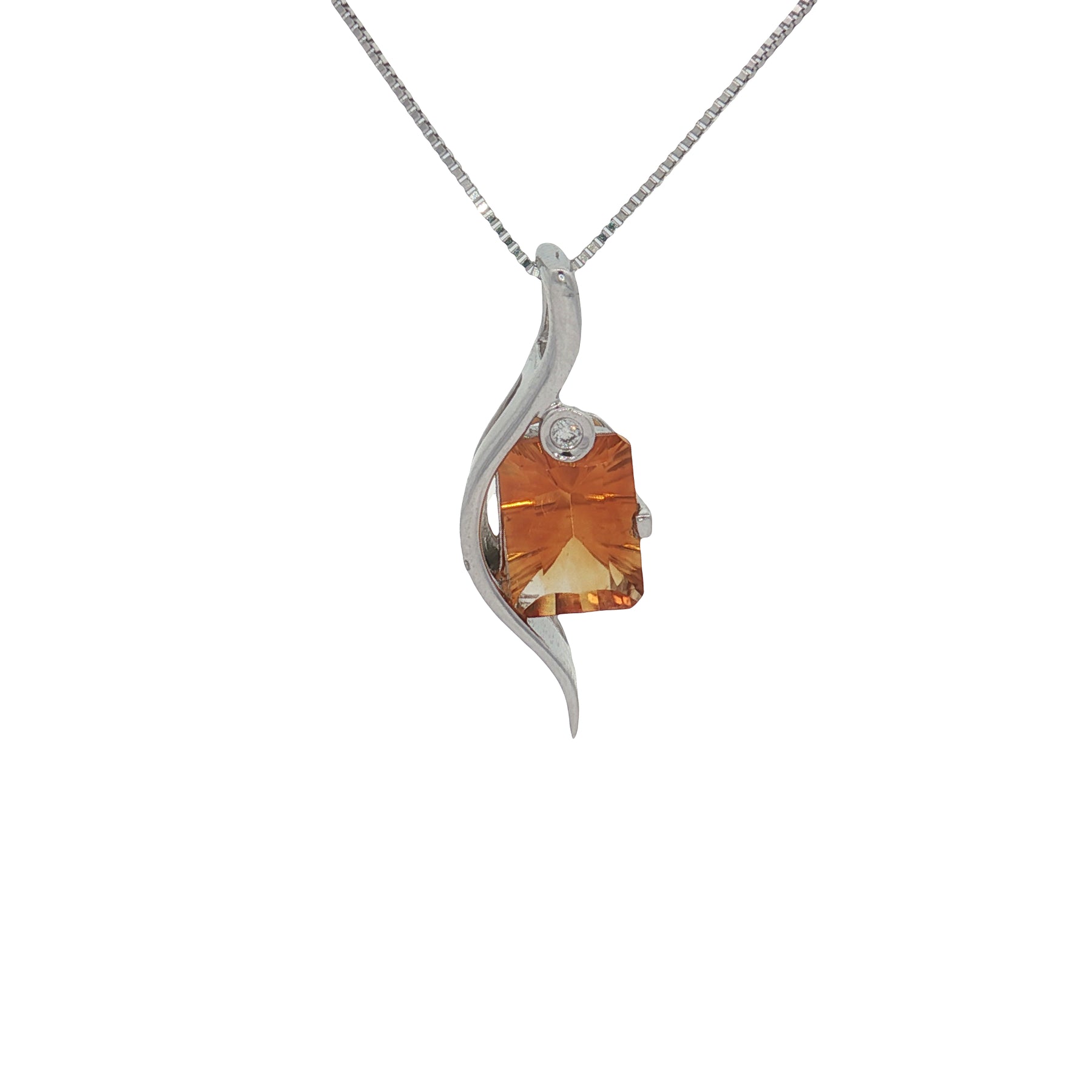 A warm burst of color meets sleek elegance in this 14k white gold pendant, featuring a brilliant 1.3ct citrine in a captivating geometric cut. The graceful wave design embraces the stone, accented by a single round diamond (.01ct) that adds a touch of sparkle. Perfect for adding a golden glow to any look.