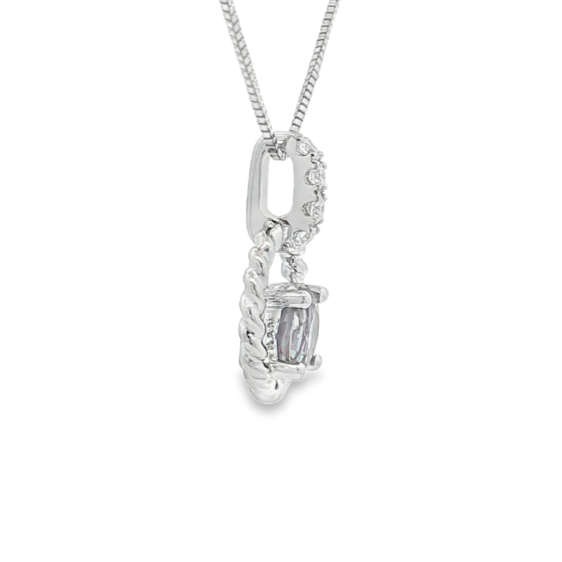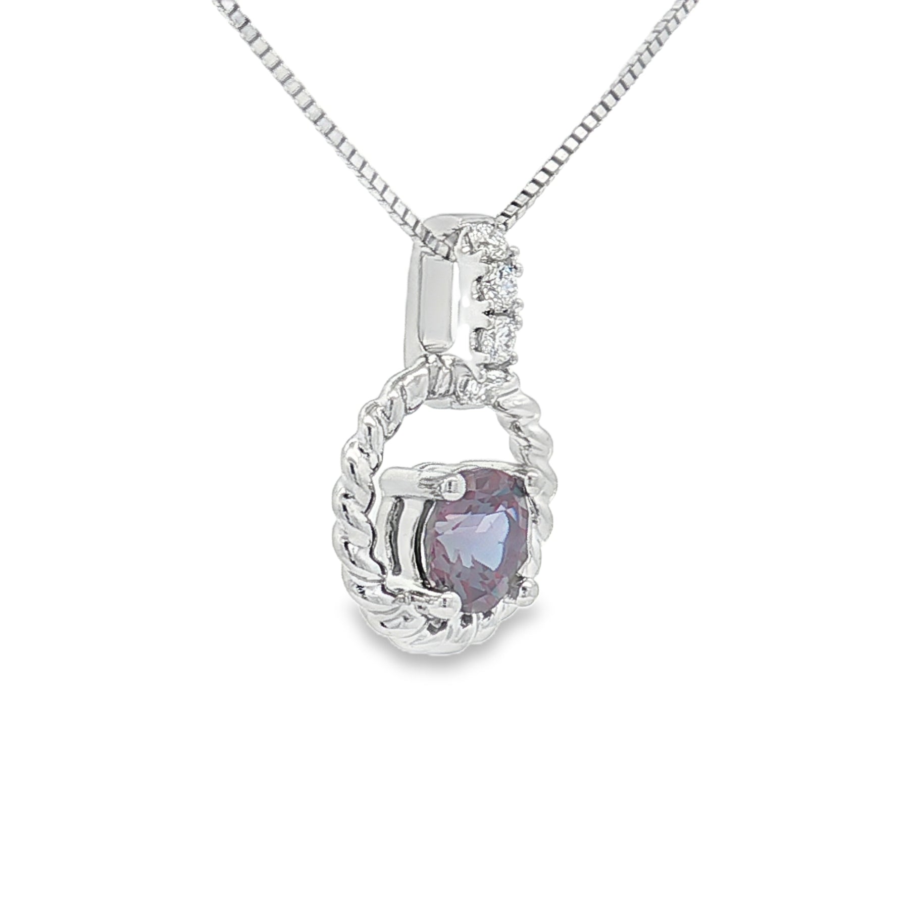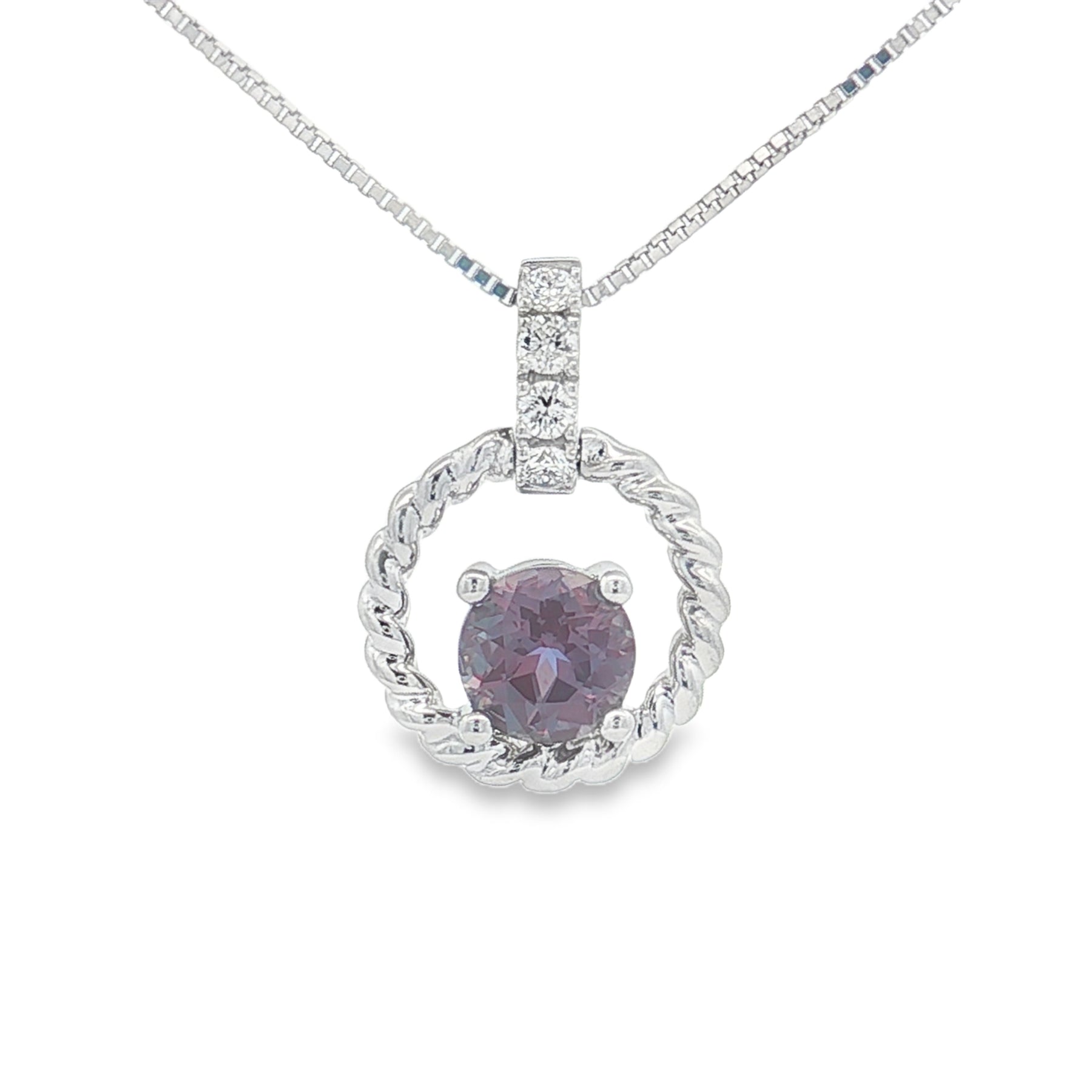 This elegant 14K white gold pendant showcases a .63ct lab-grown alexandrite, shifting beautifully between violet and blue-green tones. A twisted circle halo frames the center stone, accented by .07ct total of sparkling lab-grown diamonds on the bail. Suspended from an 18" chain with a spring ring clasp, this pendant blends color, brilliance, and timeless styling.