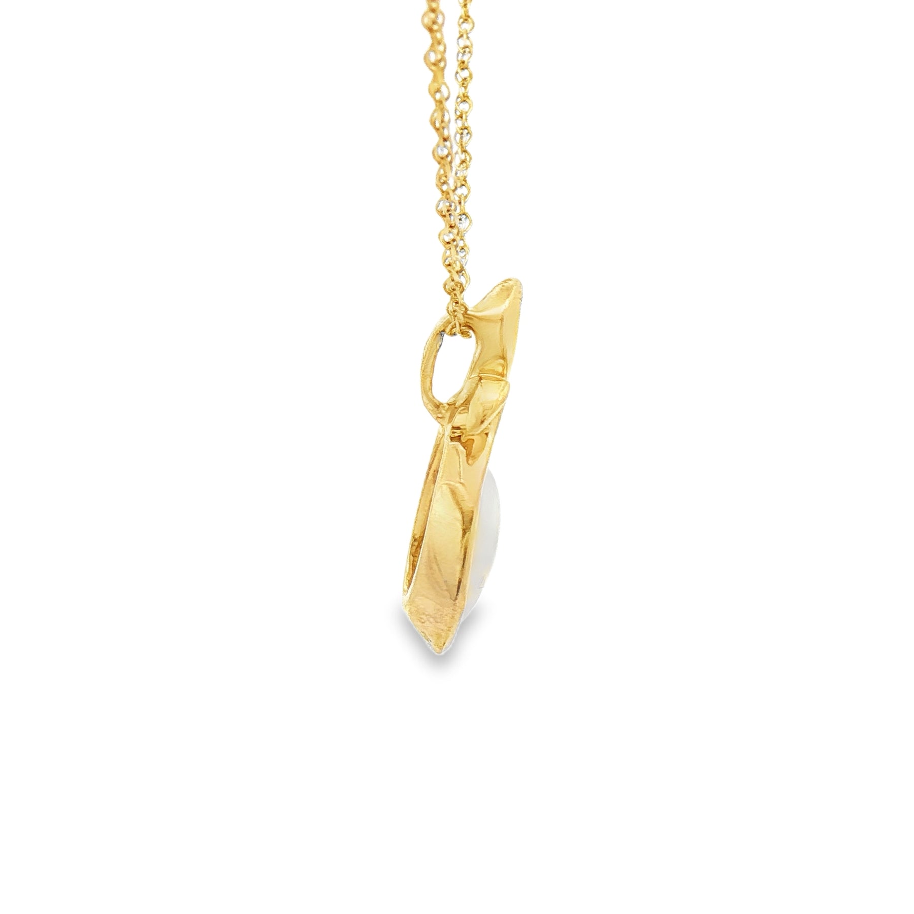 This estate 14K yellow gold necklace features a 1.1ct opal with soft flashes of color and luminous glow. Suspended from an 18" chain with a secure spring ring clasp, this pre-owned piece offers timeless elegance with vintage charm.