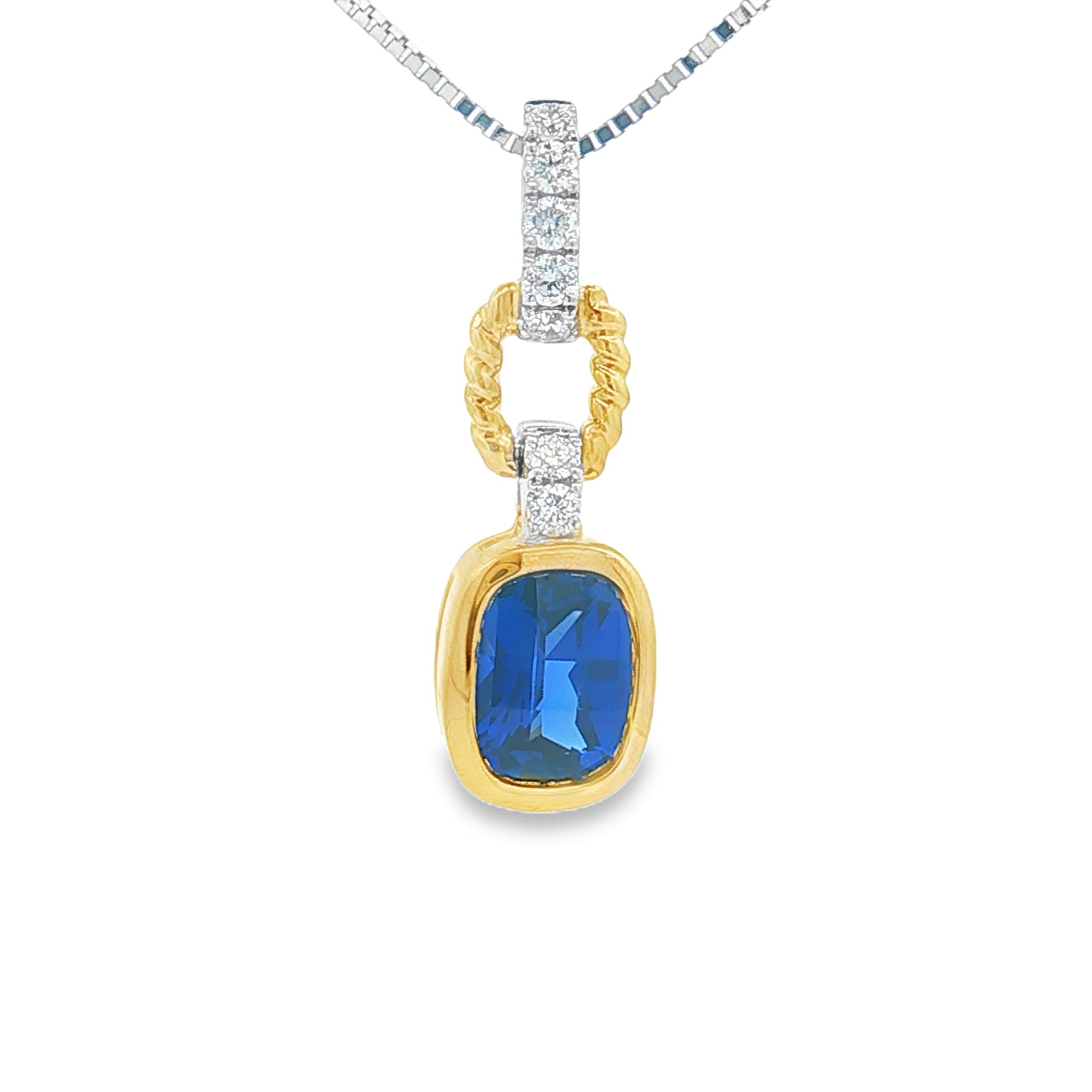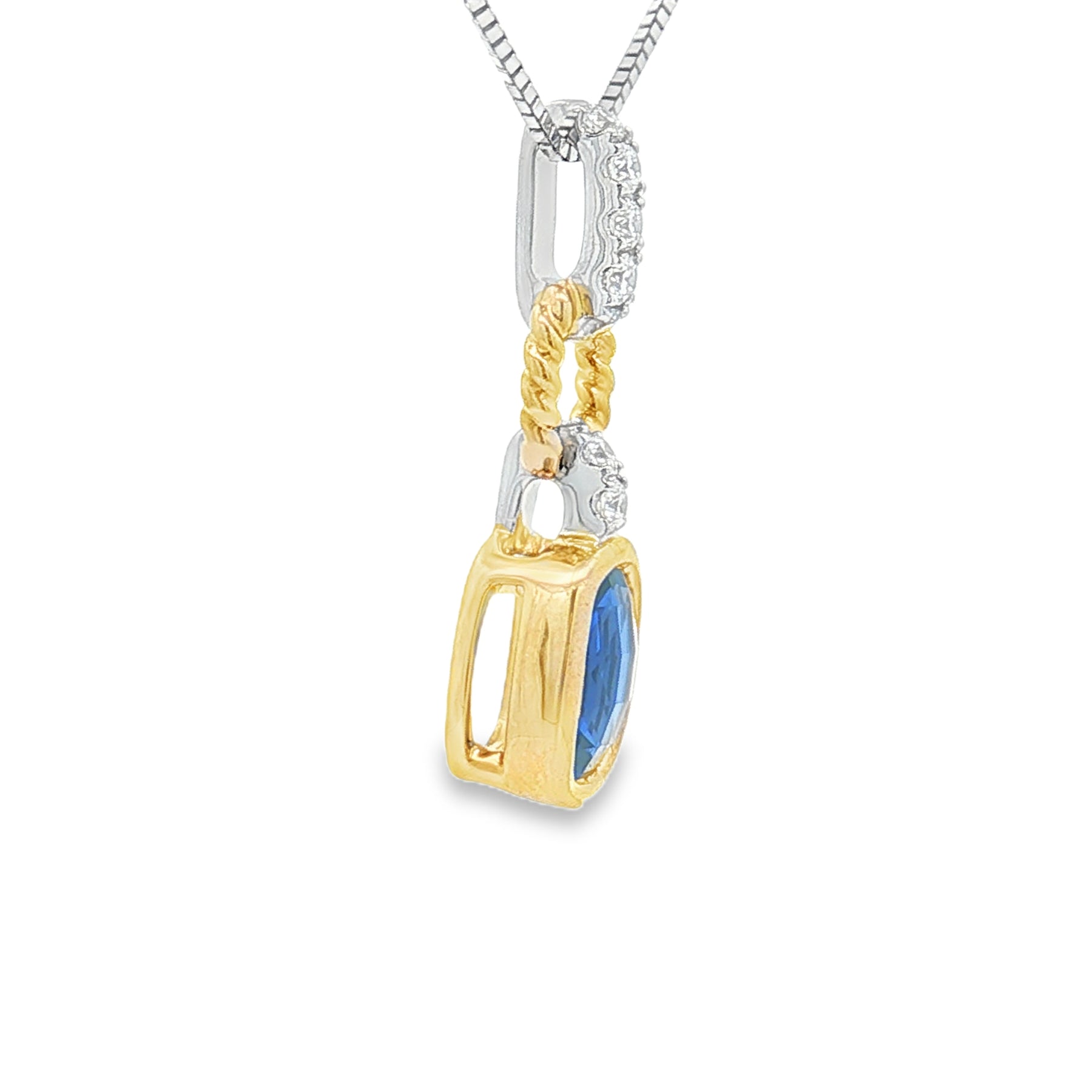 This striking two-tone pendant showcases a 1.21ct lab-grown sapphire in a rich, vibrant blue, framed in a smooth 14K yellow gold bezel. Above the center stone, .18ct of lab-grown diamonds accent a twisted yellow gold link and polished white gold elements, creating a luxurious contrast with beautiful movement and depth. The pendant is completed with an 18" chain secured by a lobster clasp, offering durability and everyday wearability.
